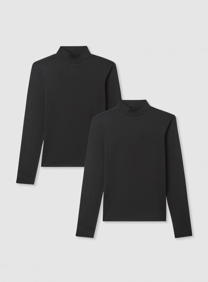 Verpackung bestehend aus zwei Langarm-T-Shirts für Mädchen mit hohem Kragen. Elastischer, einfarbiger Stoff mit minimalistischem Design. Perfekt alleine oder als Basisschicht unter anderen Jacken oder Pullovern.