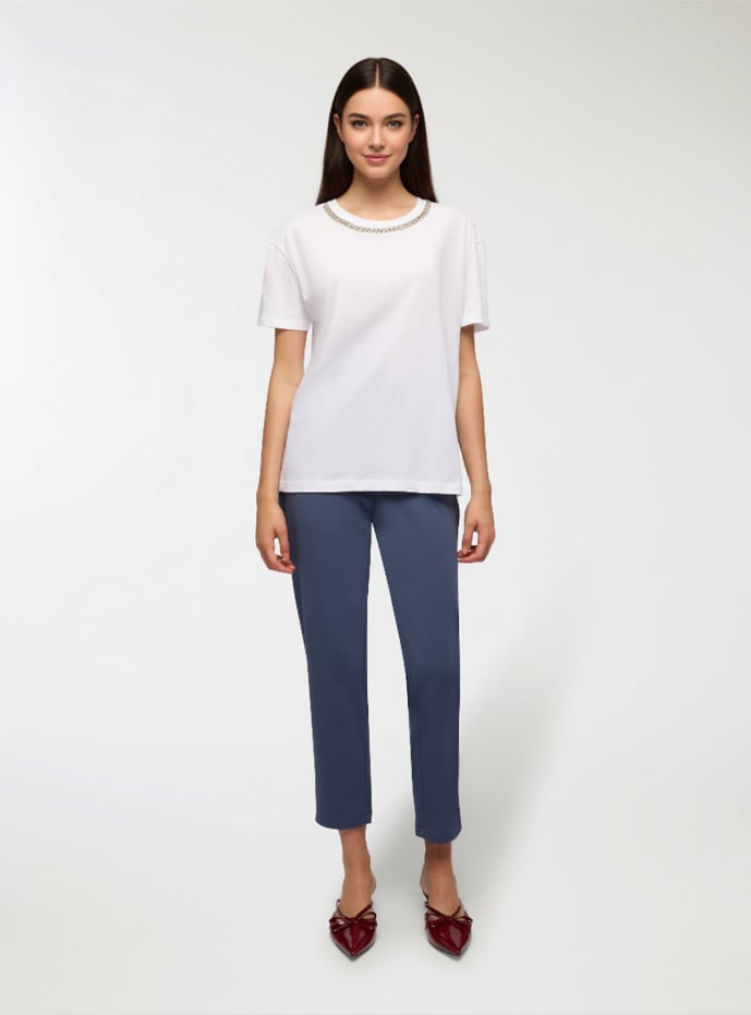 Damen Chino-Hosen in einfarbigem Design, ideal für einen lässig-eleganten Stil. Das weiche und bequeme Design passt sich perfekt der Figur an, während der elastische Bund hinten eine praktische und vielseitige Passform garantiert. Der schlichte Schnitt macht sie perfekt für das Büro, die Freizeit oder elegantere Looks. Leicht zu kombinieren mit Hemden, Pullovern oder Blazern.