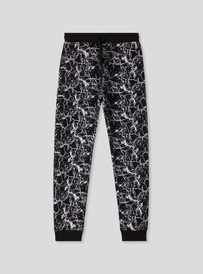 Schwere Jogginghosen für Kinder mit einem Allover-Marmorprint, ideal für die Freizeit und sportliche Aktivitäten. Das Modell hat eine normale Passform, einen elastischen Bund mit verstellbarem Kordelzug und einen Beinabschluss mit elastischen Bündchen. Perfekt zu Sweatshirts oder T-Shirts kombinierbar für einen dynamischen und bequemen Look, sind sie darauf ausgelegt, Bewegungsfreiheit in jeder Situation zu gewährleisten.