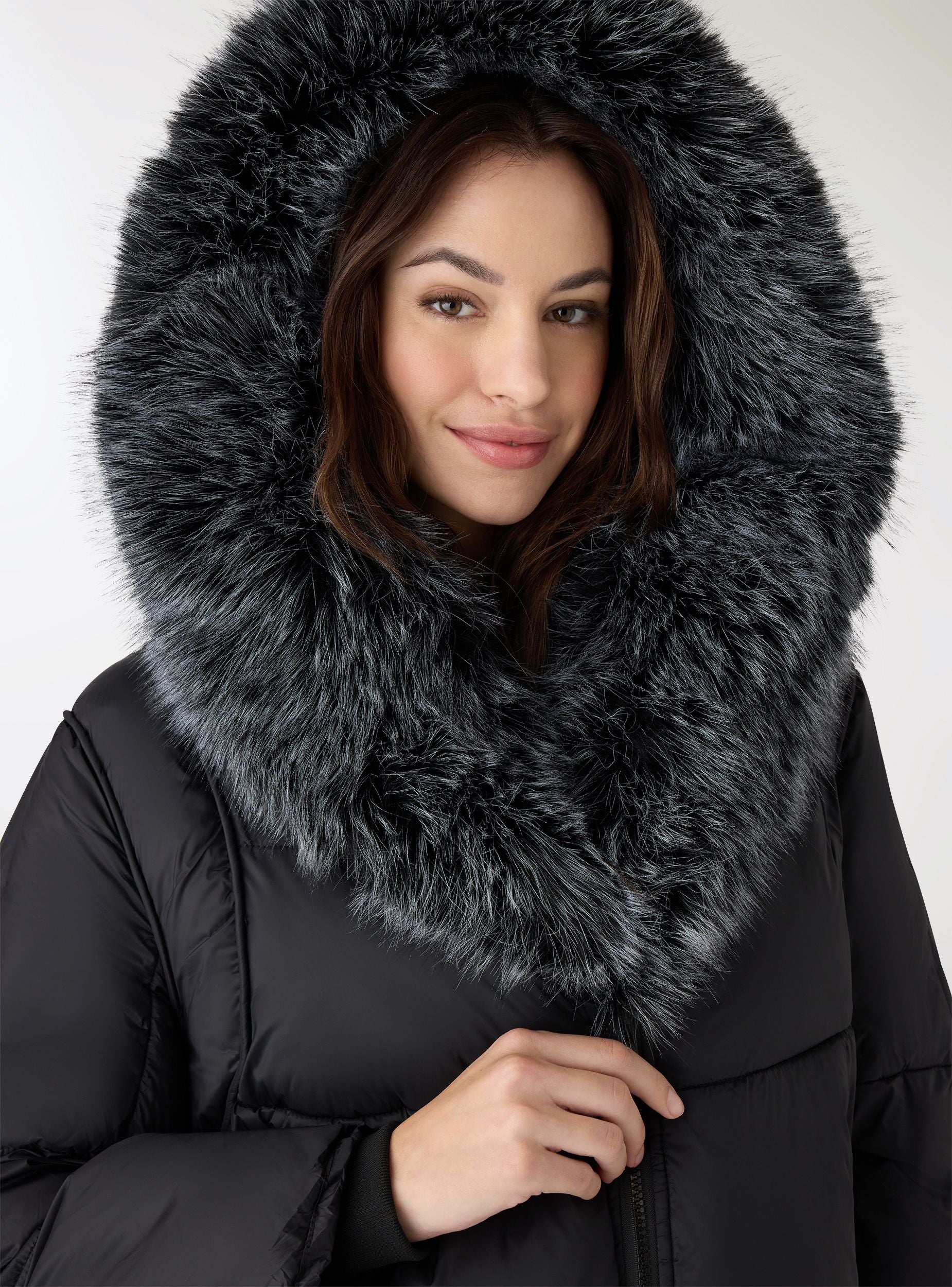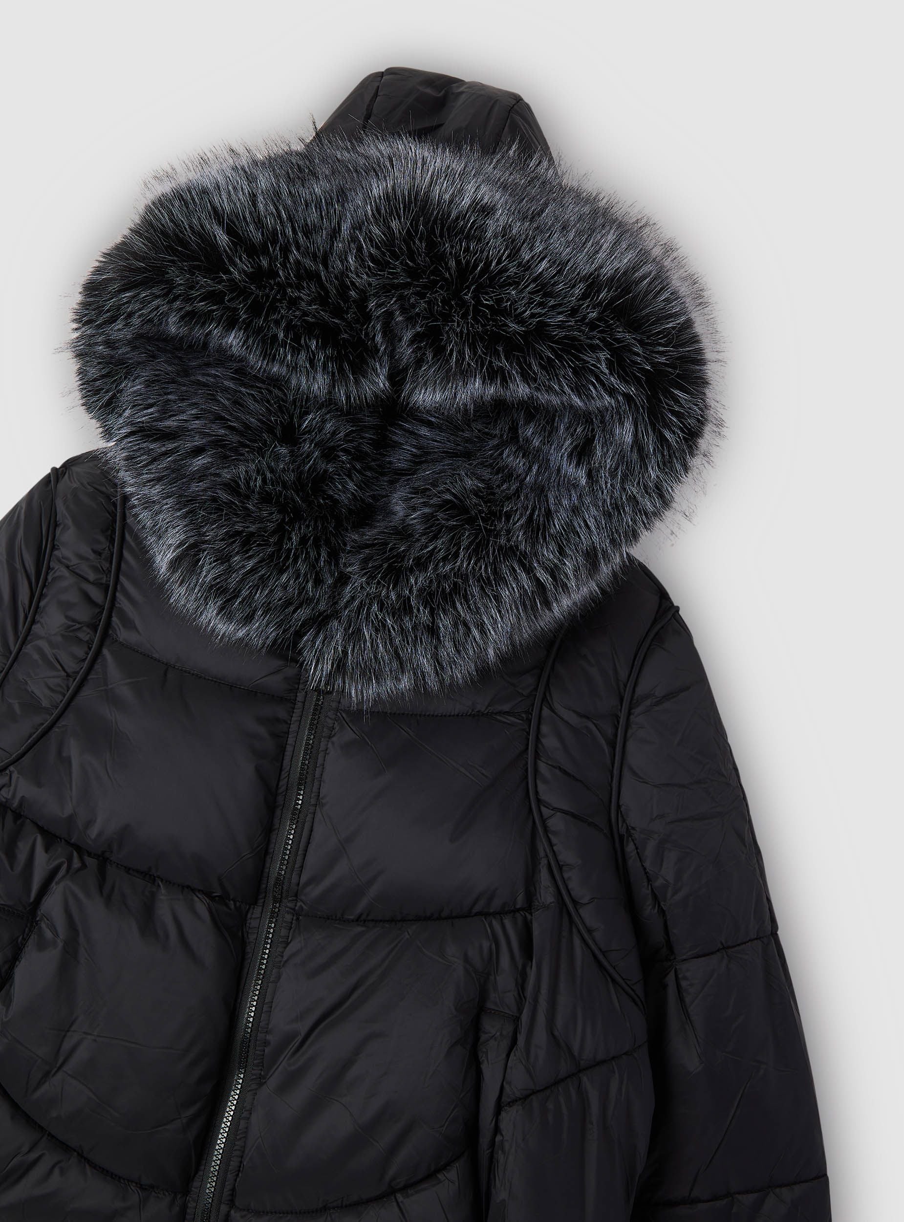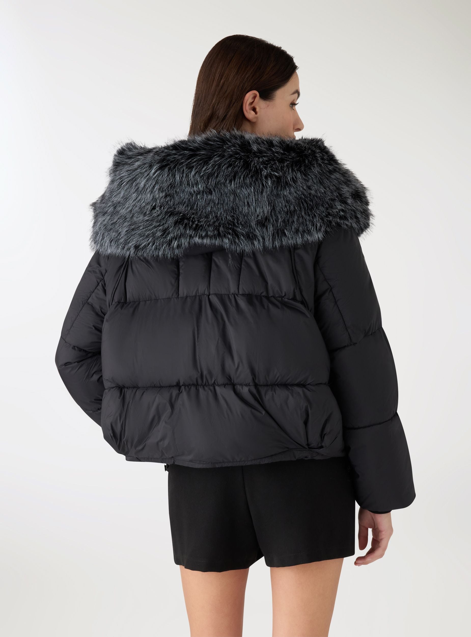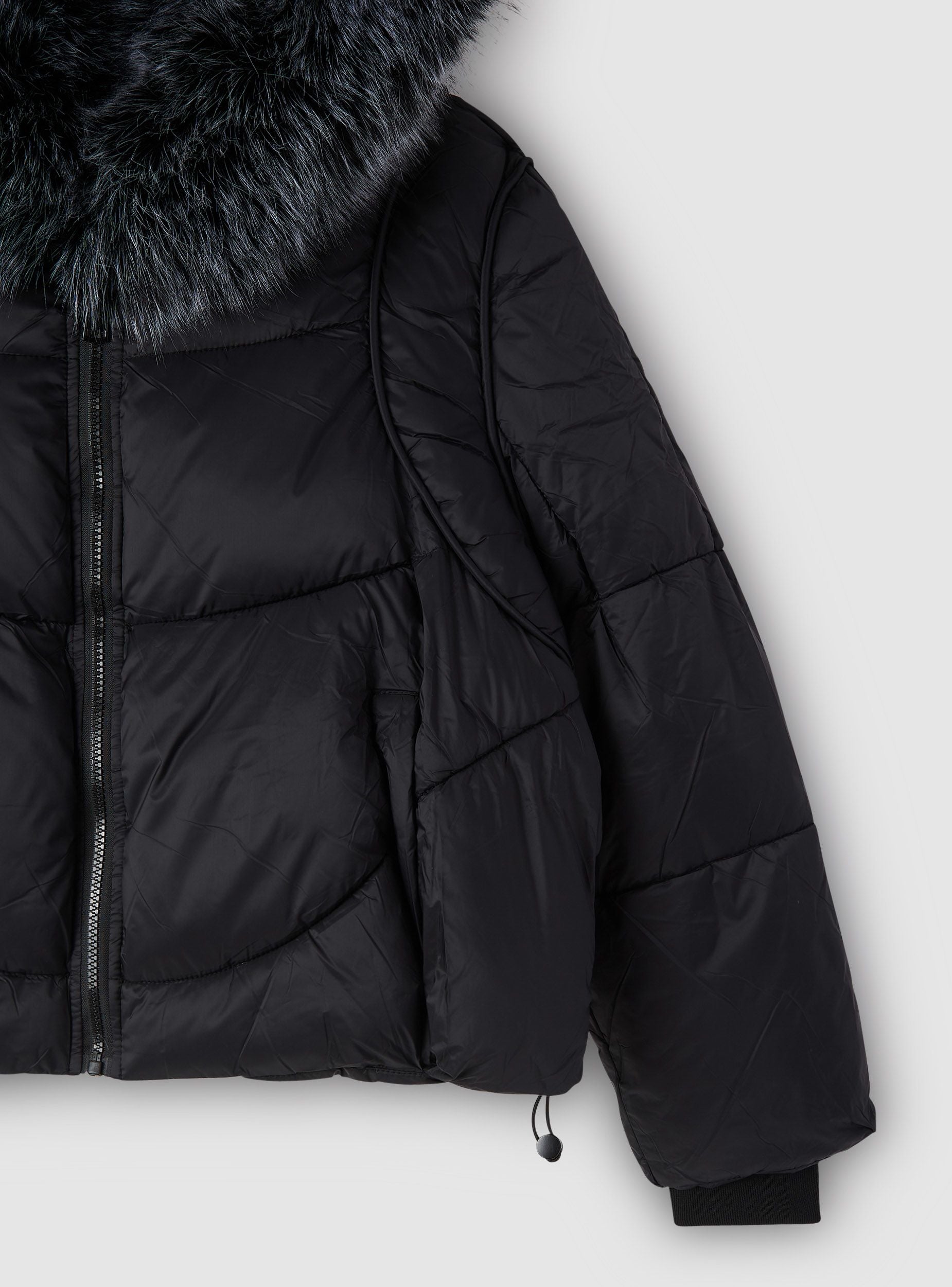 Късо подплатено яке с качулка с ефект на кожа - Черно
