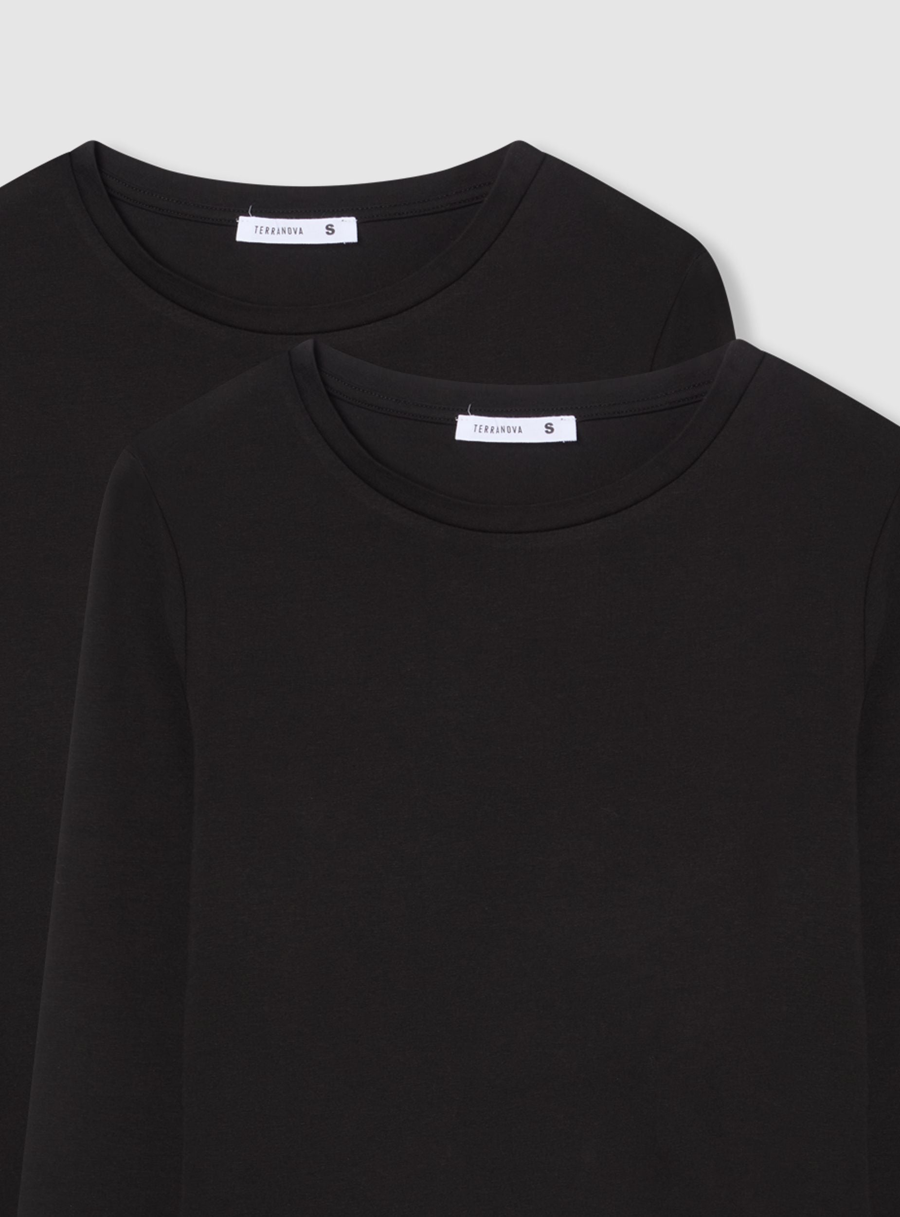 Дамска блуза с дълъг ръкав в едноцветен дизайн, с изчистен стил, кръгло деколте и редовно прилягане. Еластична едноцветна материя. Идеална под блейзър или кардиган за офиса, перфектна също с дънки и маратонки през свободното време. Обработена яка и прав подгъв за чист вид. Лесна за комбиниране във всеки сезон и удобна за носене като първи слой.Детайли