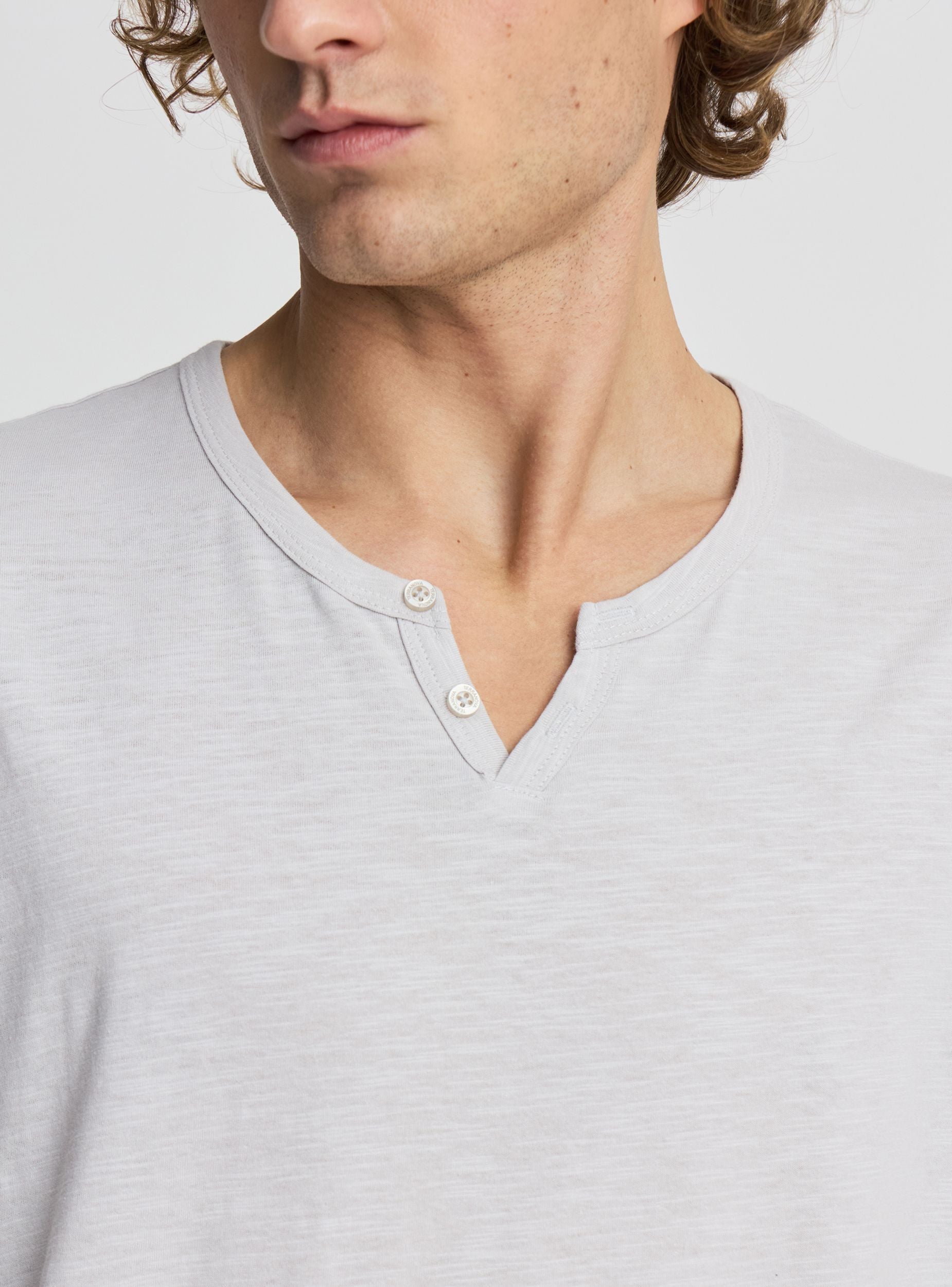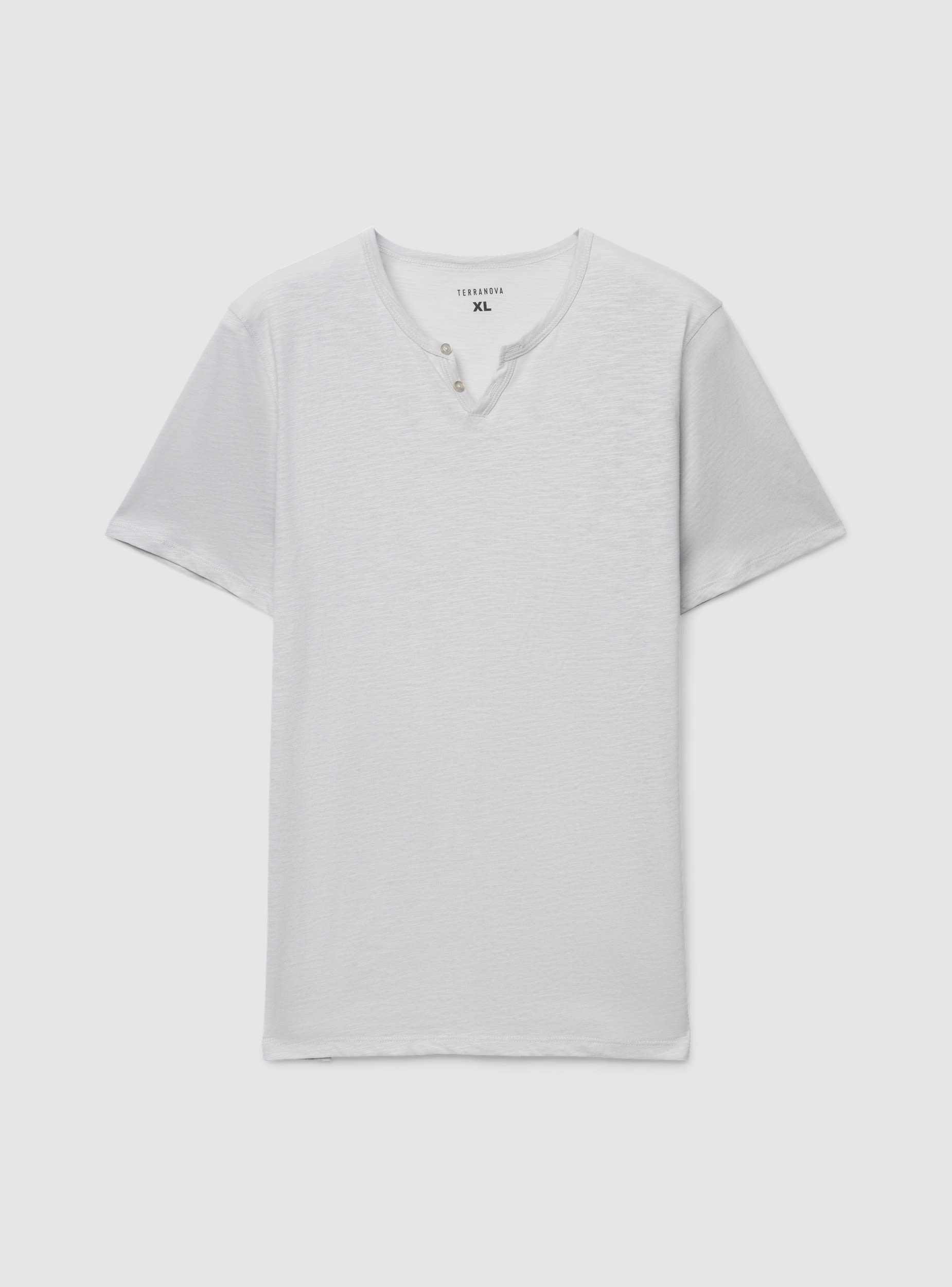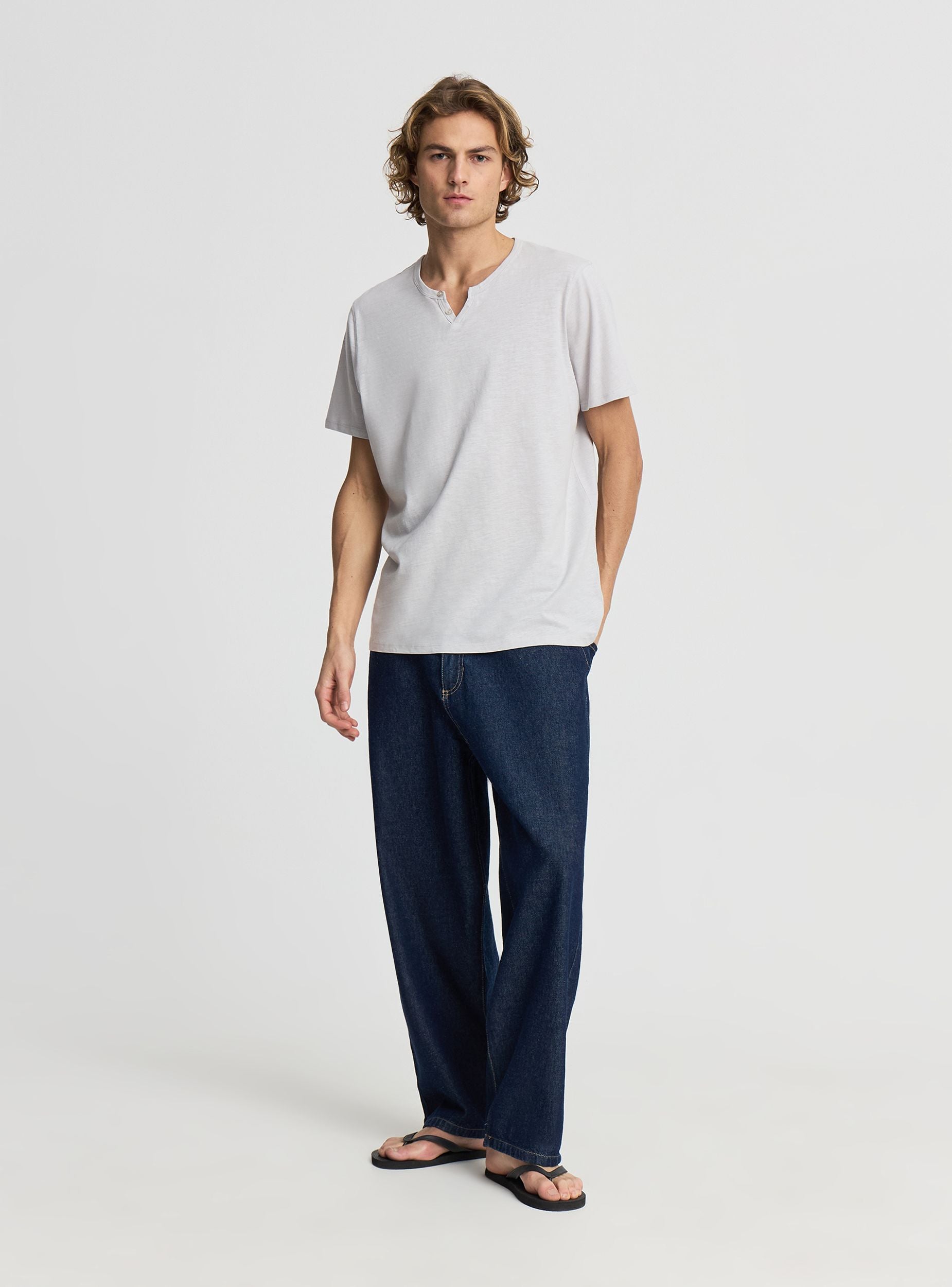 Мъжка тениска с къс ръкав, с V-образно деколте с два копчета и едноцветна пламъчна текстура. Идеална за свободното време и ежедневен стил, лесно се комбинира с дънки или чино панталони и маратонки. С редовно прилягане, с прав подгъв, отворено V-образно деколте с къса капа и малки копчета. Универсален артикул за всеки ден, перфектен и под лека риза или суитшърт.
