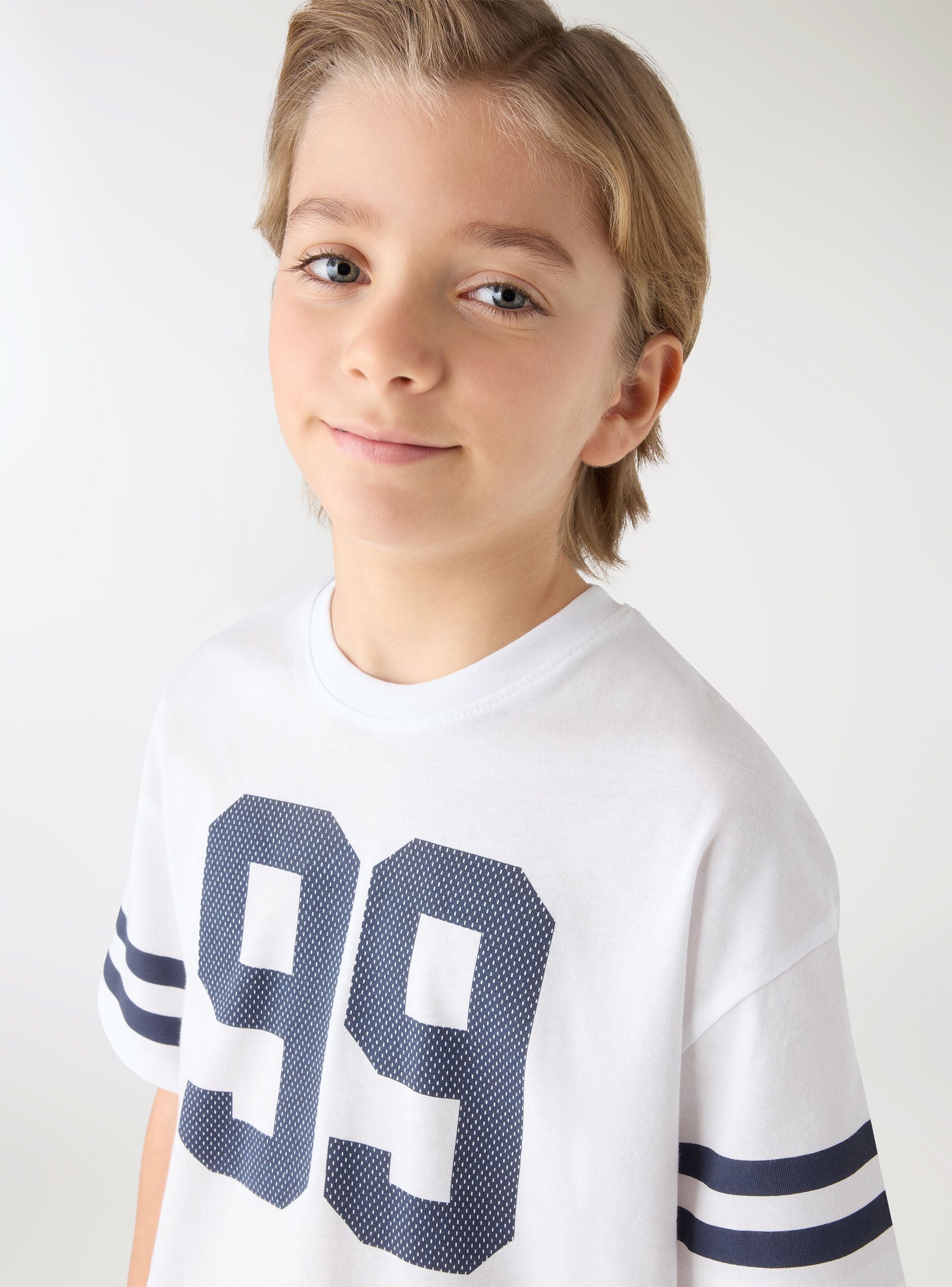 Детска тениска с числов принт отпред и къси ръкави, декорирани с двойни ивици, перфектна за спортен вид. С кръгло деколте и редовно прилягане, идеална за училище или свободно време. Лесно се комбинира с дънки, къси панталони или спортни панталони за динамични аутфити.Детайли