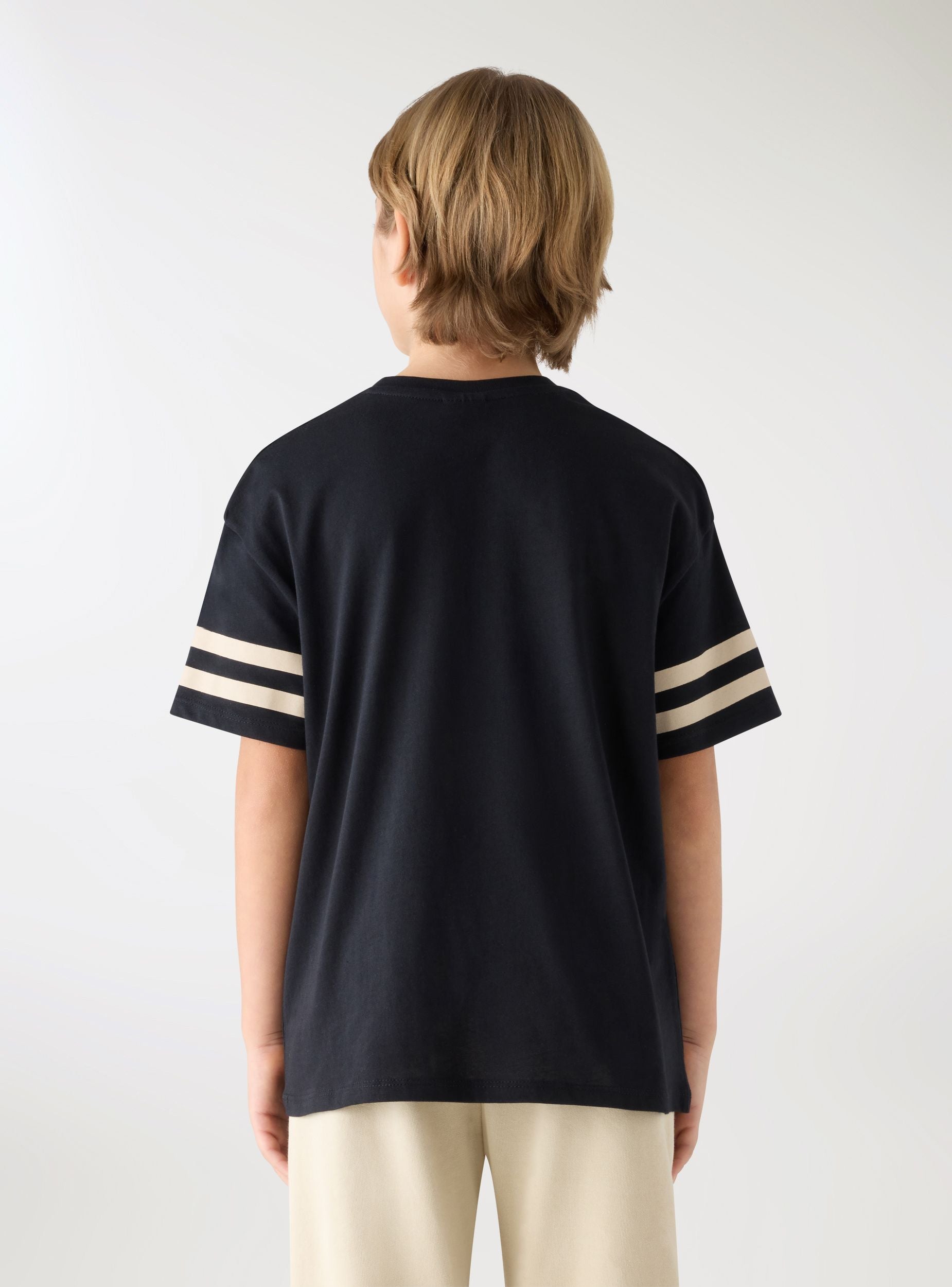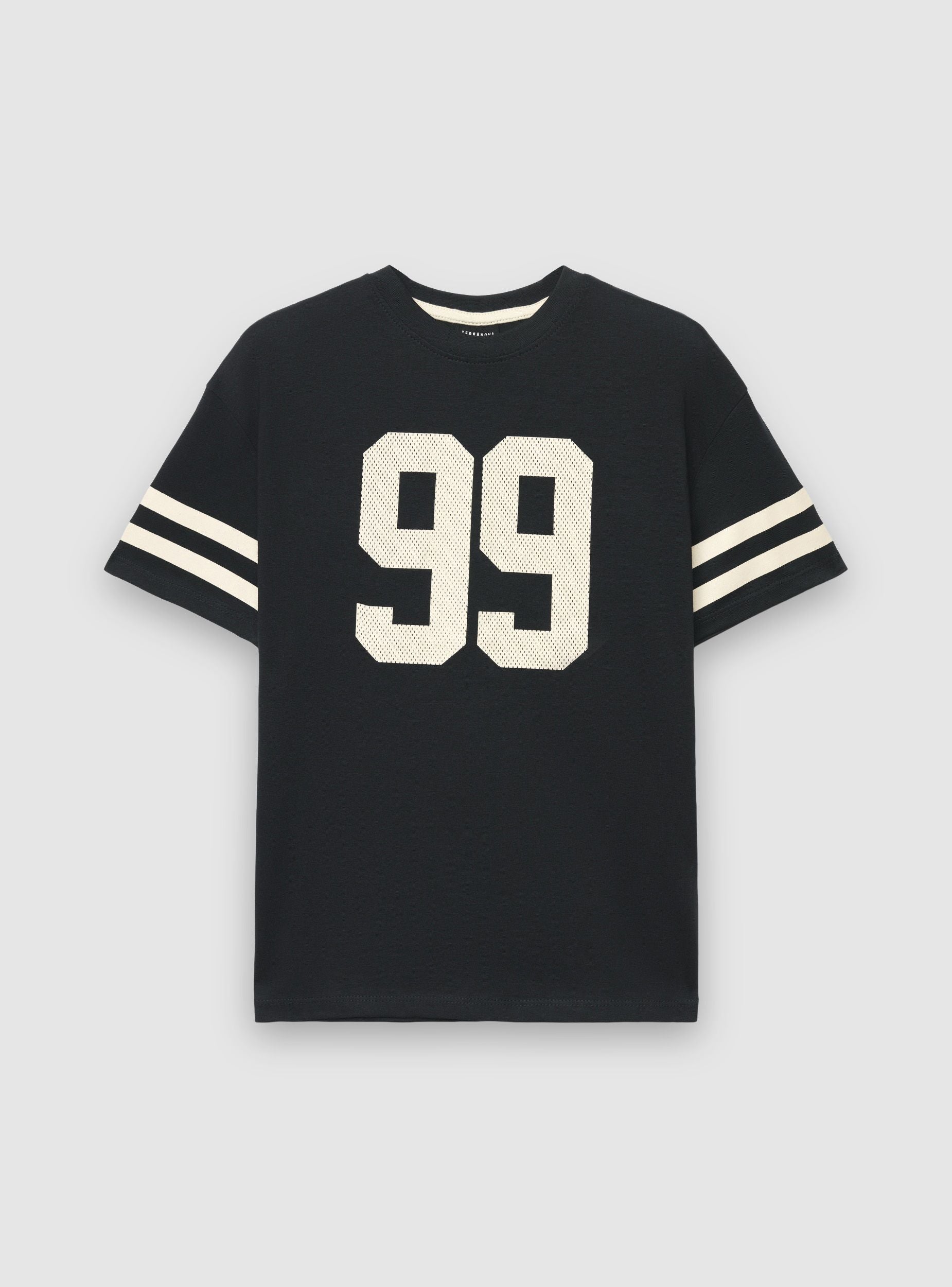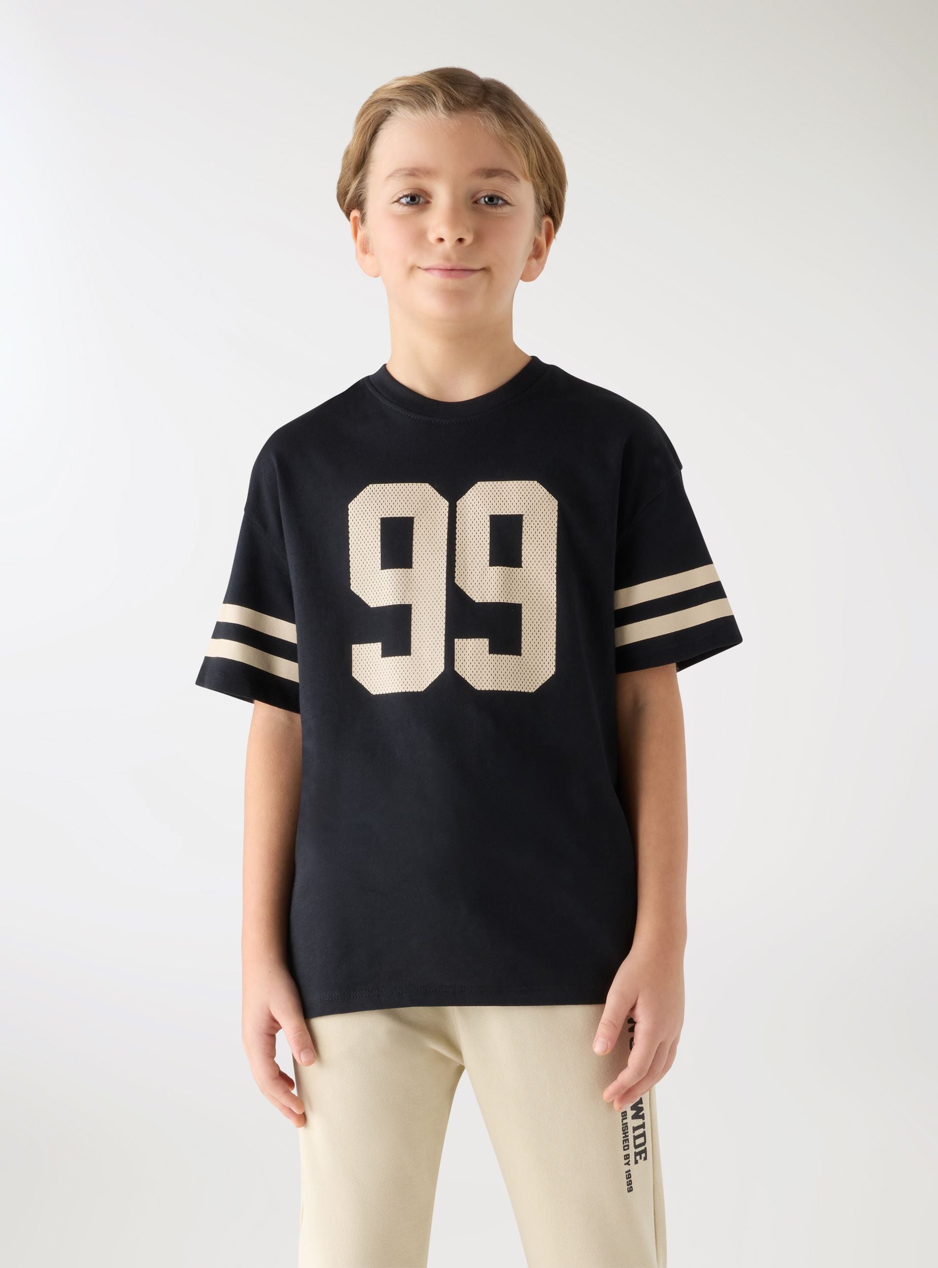 Детска тениска с числов принт отпред и къси ръкави, украсени с двойни райета, перфектна за спортен стил. С кръгло деколте и редовно прилягане, идеална за училище или свободното време. Лесно се комбинира с дънки, къси панталони или спортни панталони за динамични визии.Детайли