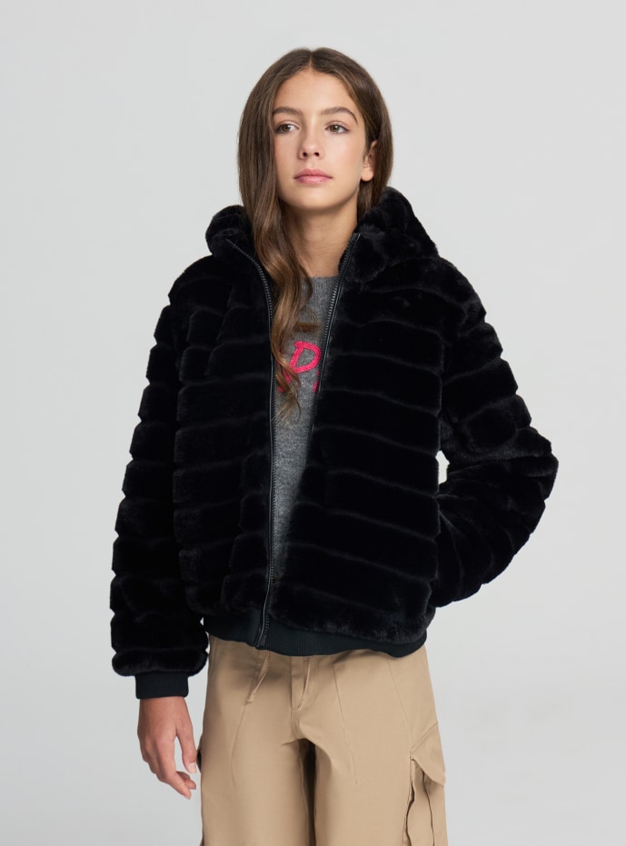 Детско бомбер яке от синтетичен косъм в едноцветен цвят с странични джобове. Тази универсална дреха се отличава с модерен дизайн и практичност, перфектна за допълване на удобни и стилни аутфити. С цип и качулка, предлага комфорт и защита. Лесно се съчетава с дънки или спортни панталони, което го прави идеален избор за свободното време и ежедневни дейности.