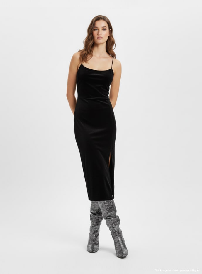 Дълга дамска рокля с тънки презрамки, идеална за елегантни вечери или специални събития. Отличава се с изискан дизайн с драпирано деколте и детайл с разрез отстрани, който добавя нотка на чувственост. Перфектна за комбиниране с високи токчета и минималистични аксесоари за изискан и женствен вид.