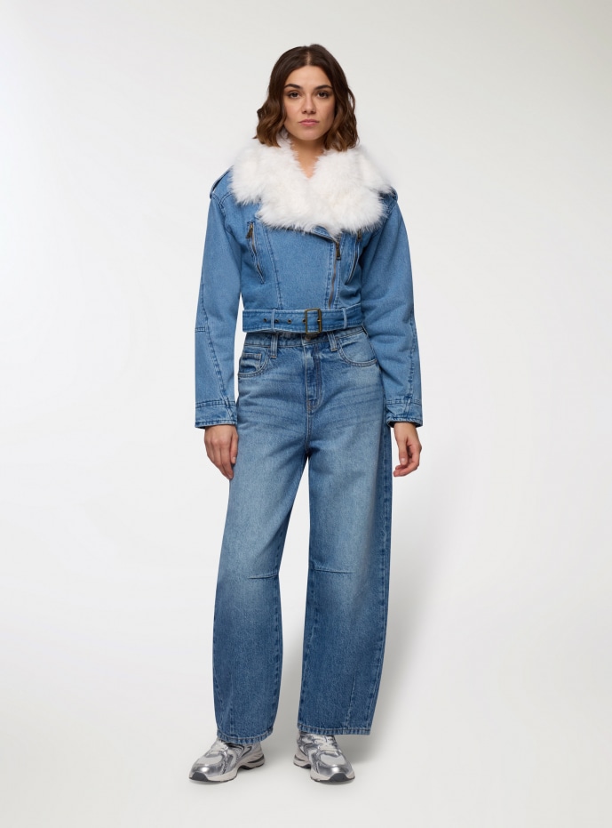 Дамско яке от деним с къса кройка. Широка яка с ефект на кожа, асиметрично закопчаване с цип и колан с катарама в долната част. Вертикални джобове с цип отпред и дълги ръкави. Идеално за градски визии с висока талия дънки или прилепнали рокли, добавя характер на твоите междинни и вечерни тоалети.