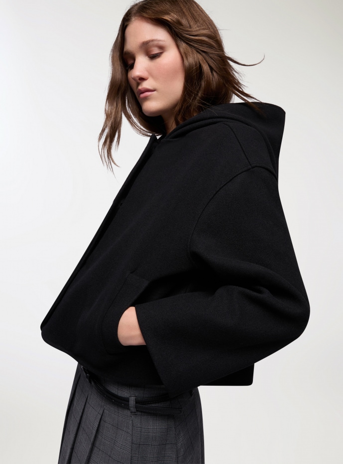 Дамско едноцветно яке с къс и изчистен силует. Оборудвано с обгръщащ качулка и предно закопчаване с копчета, идеално за свободното време в града или за допълване на елегантни визии с дънки, панталони или поли. Дълги ръкави и странични джобове с прорез осигуряват практичност, докато редовната кройка гарантира комфорт без да се жертва стилът.