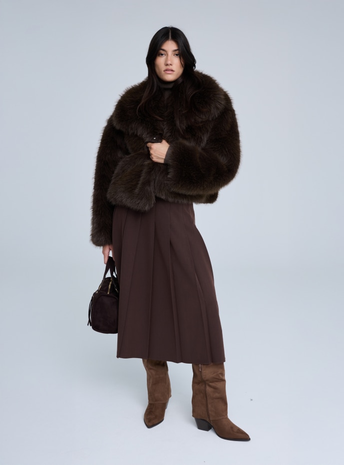 Дамско яке от изкуствена кожа с широк яка и дълги ръкави, идеално за добавяне на изискан щрих към ежедневен тоалет или за специални поводи. Якето има редовно прилягане и елегантен дизайн с предно закопчаване за удобство. Отличава се с мека и обгръщаща текстура, която осигурява комфорт и стил. Перфектно за съчетаване с панталони или поли.