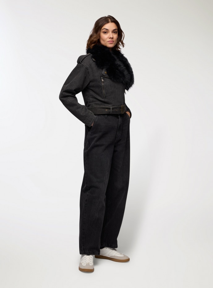 Дамско яке от деним с къса кройка. Широка яка с ефект на пух, асиметрично закопчаване с цип и колан с катарама в долната част. Вертикални джобове с цип отпред и дълги ръкави. Идеално за градски стил с дънки с висока талия или прилепнали рокли, добавя характер на твоите междинни и вечерни визии.
