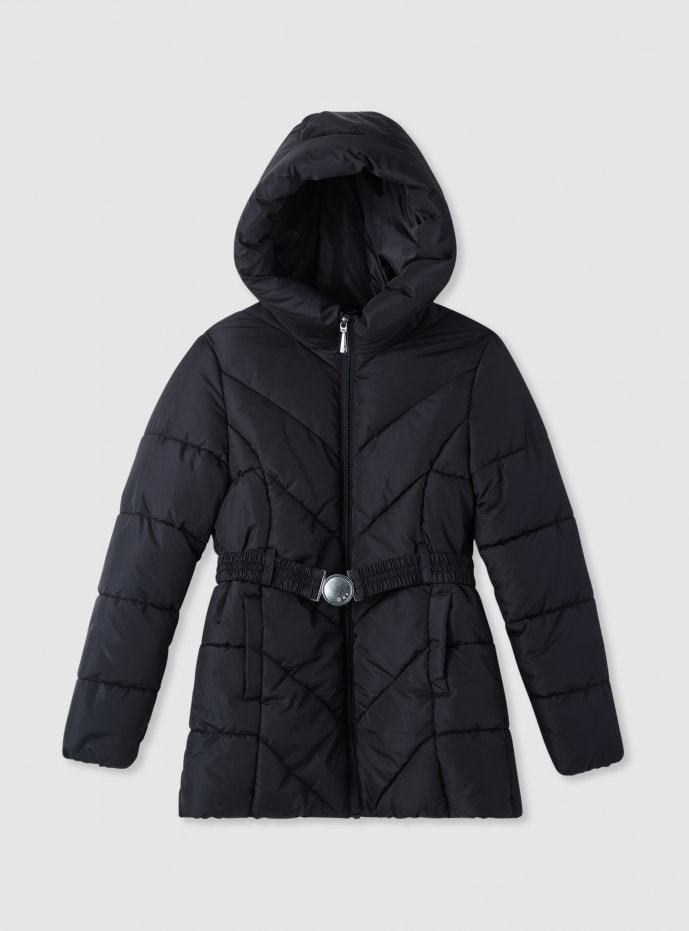 Детско подплатено яке с качулка, перфектно за студените дни. Разполага с предно закопчаване с цип и еластичен колан с декоративна катарама за регулируемо прилягане. Страничните джобове осигуряват удобство, а капитонираният дизайн добавя модерен акцент. Идеално за завършване на ежедневни визии и гарантира защита от студа.
