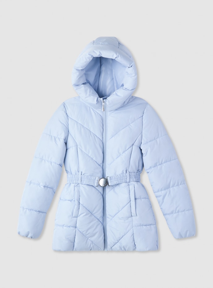 Пухено яке за момичета с качулка, перфектно за студените дни. Разполага с предно закопчаване с цип и еластичен колан с декоративна катарама за регулируемо прилягане. Страничните джобове осигуряват удобство, а капитонираният дизайн добавя модерен щрих. Идеално за завършване на ежедневни визии и гарантира защита от студа.