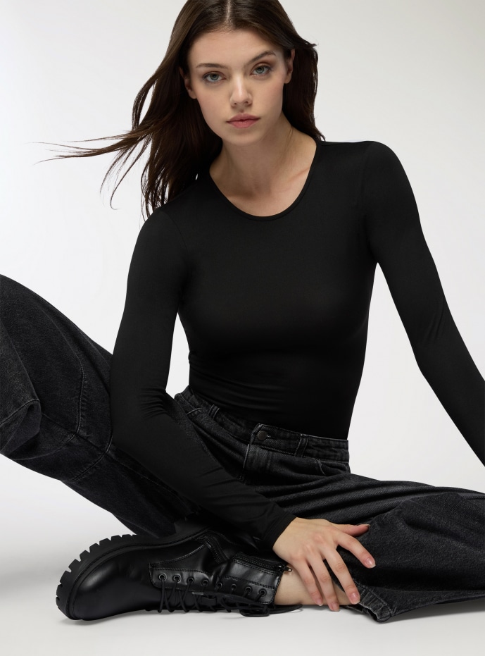 Дамско боди с дълъг ръкав, с кръгло деколте и закопчаване с копчета в областта на кръста. Мек едноцветен плат. Прилепнало и с изчистени линии, идеално за създаване на стилни и без гънки тоалети, които да се носят с дънки, официални панталони или поли. Перфектно за свободното време или за офиса под блейзър и кардиган, подчертава силуета. Универсален артикул за женствени и подредени визии.