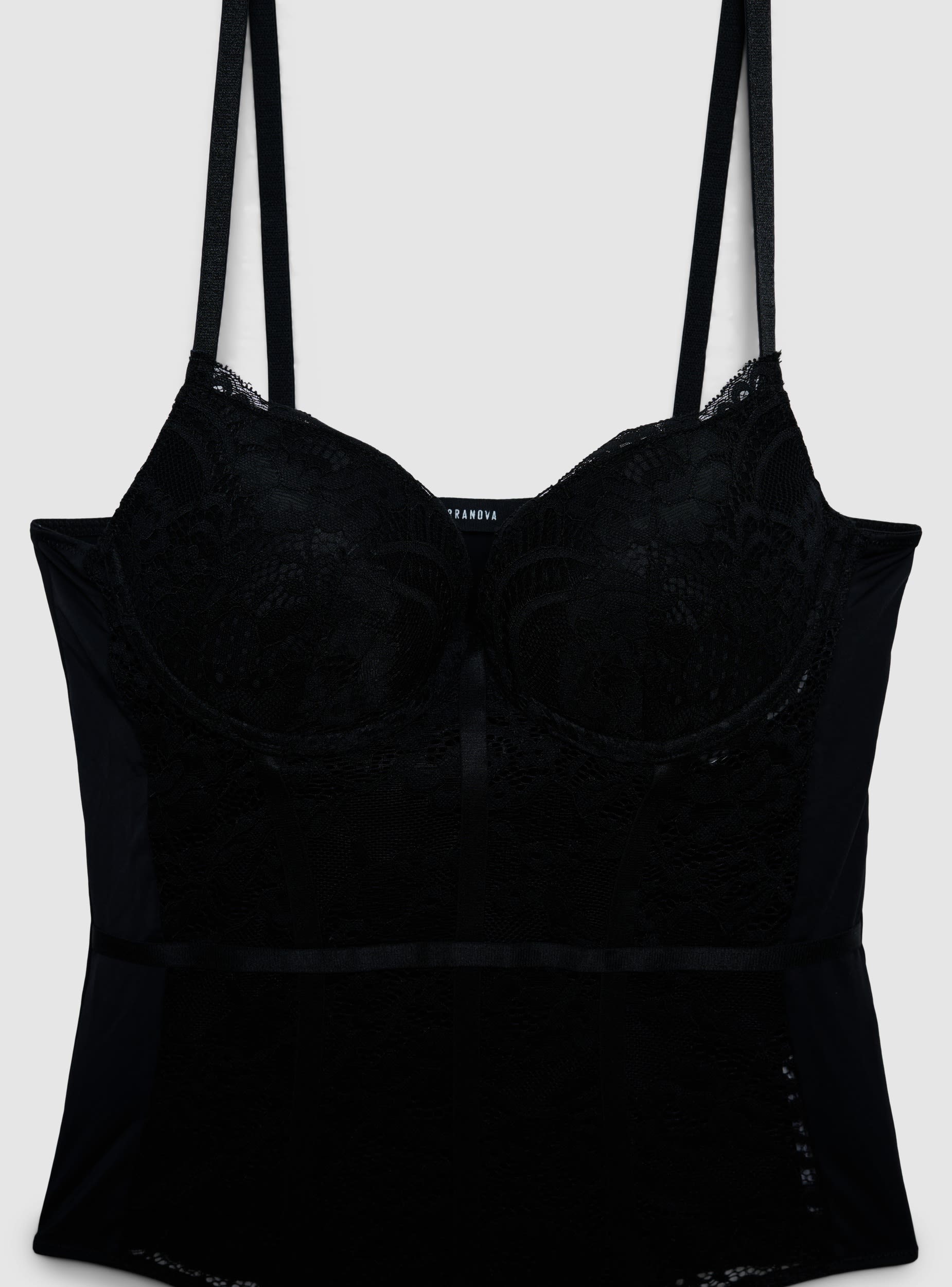 Ženski bodi u jednoj boji sa oblikovanim korpicama i podesivim naramenicama. Dizajn sa efektom korzeta i čipkastim panelima. Savršen ispod blejzera i pantalona visokog struka ili uz midi suknju za večernji outfit. Uže pristajanje koje oblikuje struk i pruža podršku dekolteu.Detalji