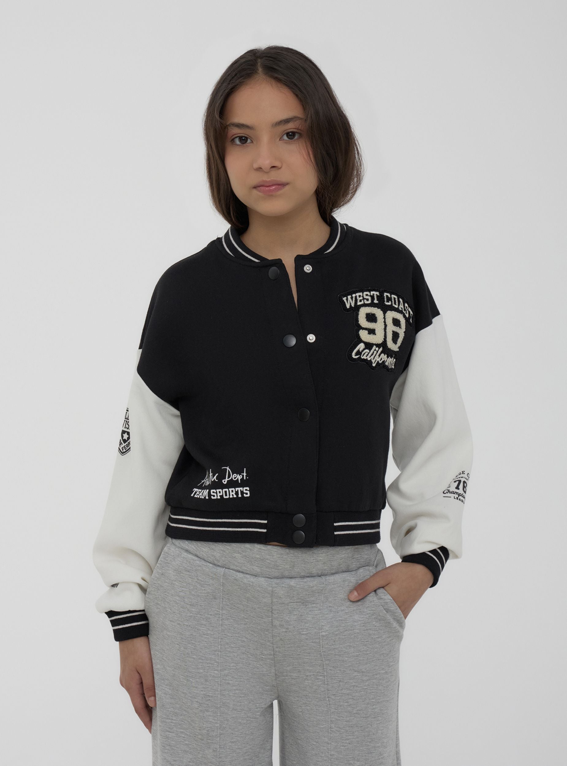 Dječja jakna u bomber stilu, idealna za sportski i dinamičan izgled. Izrađena od teškog flisa, nudi udobnost i zaštitu u međusezoni. Zatvaranje na gumbi dodaje praktičnost, dok dekorativne oznake na prsima i rukavima daju privlačan dodir inspiriran sveučilištem. Savršena za slobodno vrijeme, lako se kombinira s trapericama i tenisicama za ležeran i suvremen izgled.Detalji