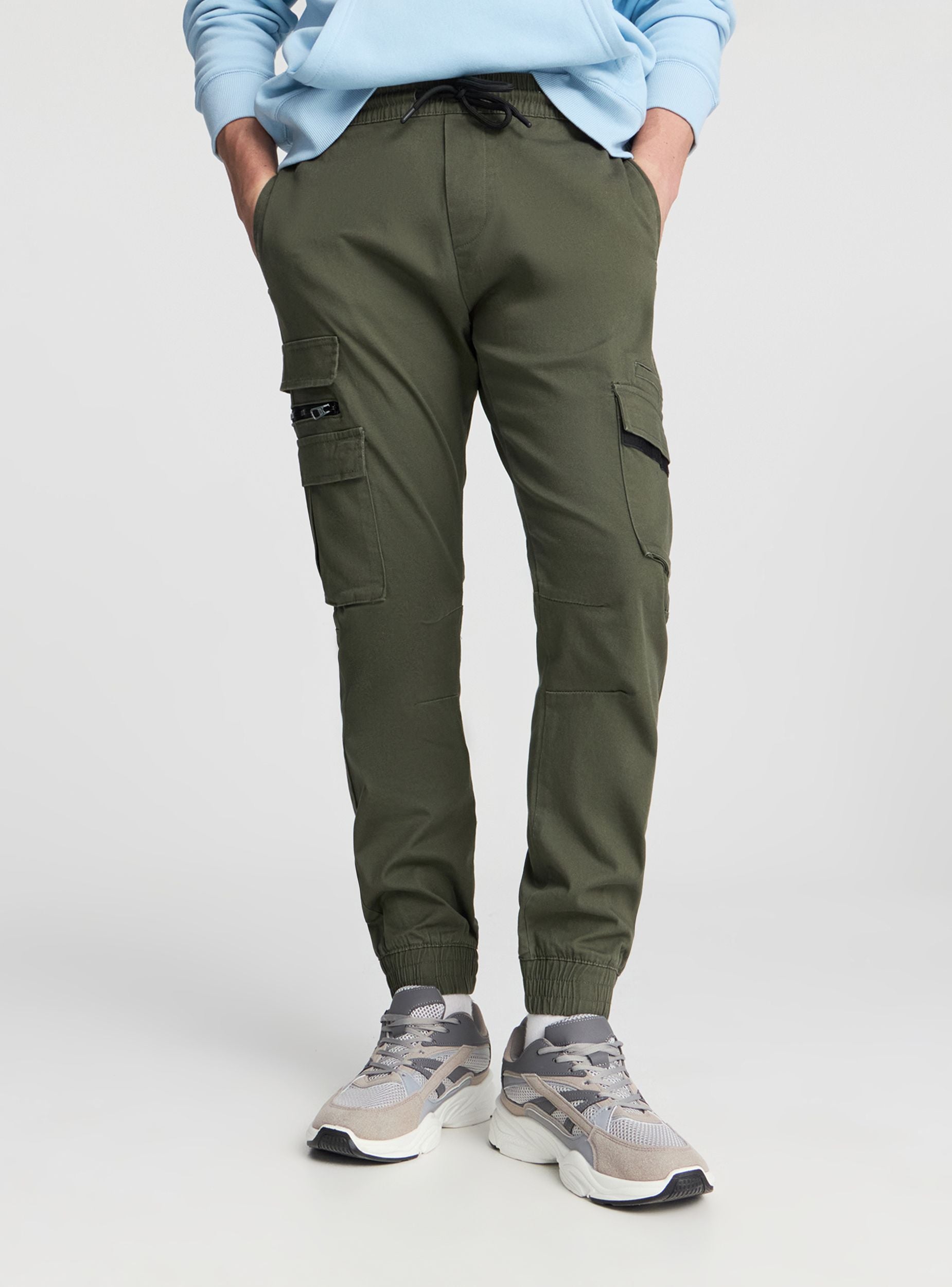 Muške hlače s cargo dizajnom, idealne za ležeran i svestran izgled. Opremljene su vrpcom u struku za podesivu i udobnu prilagodbu. Imaju bočne džepove sa zatvaračem i praktične detalje za svakodnevnu upotrebu. Savršene za kombiniranje s majicama ili duksericama, prikladne za različite neformalne prilike. Regularan kroj i moderan stil.Detalji