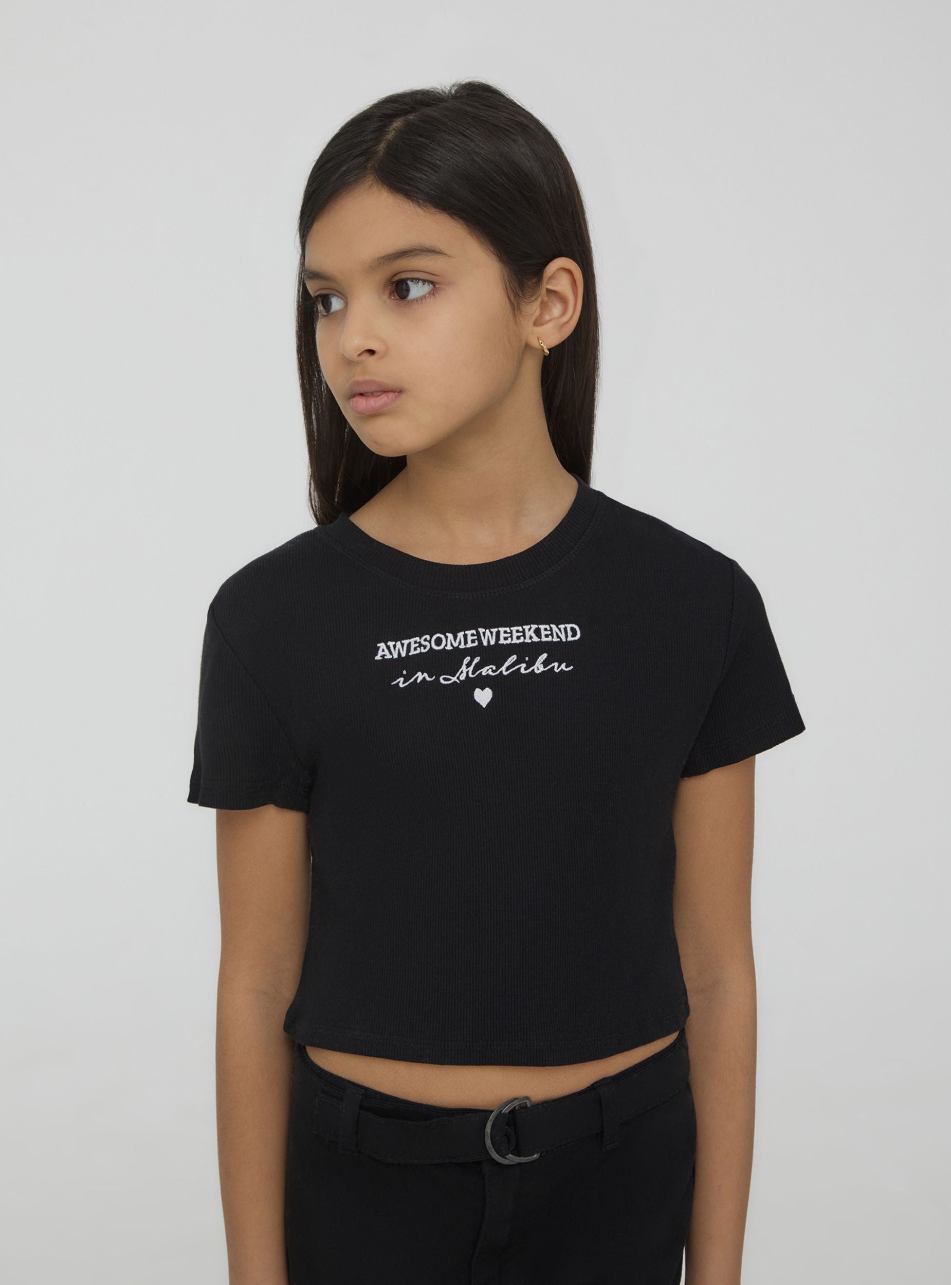 Majica za djevojčice s kratkim rukavima, krojena u crop stilu s modernim dizajnom. Ima okrugli izrez i dekorativni natpis na sredini koji dodaje razigran i trendi dodir. Idealna za kombiniranje s trapericama, suknjama ili kratkim hlačama kako bi se stvorio ležeran i moderan izgled, prikladan za svaku neformalnu priliku.Detalji