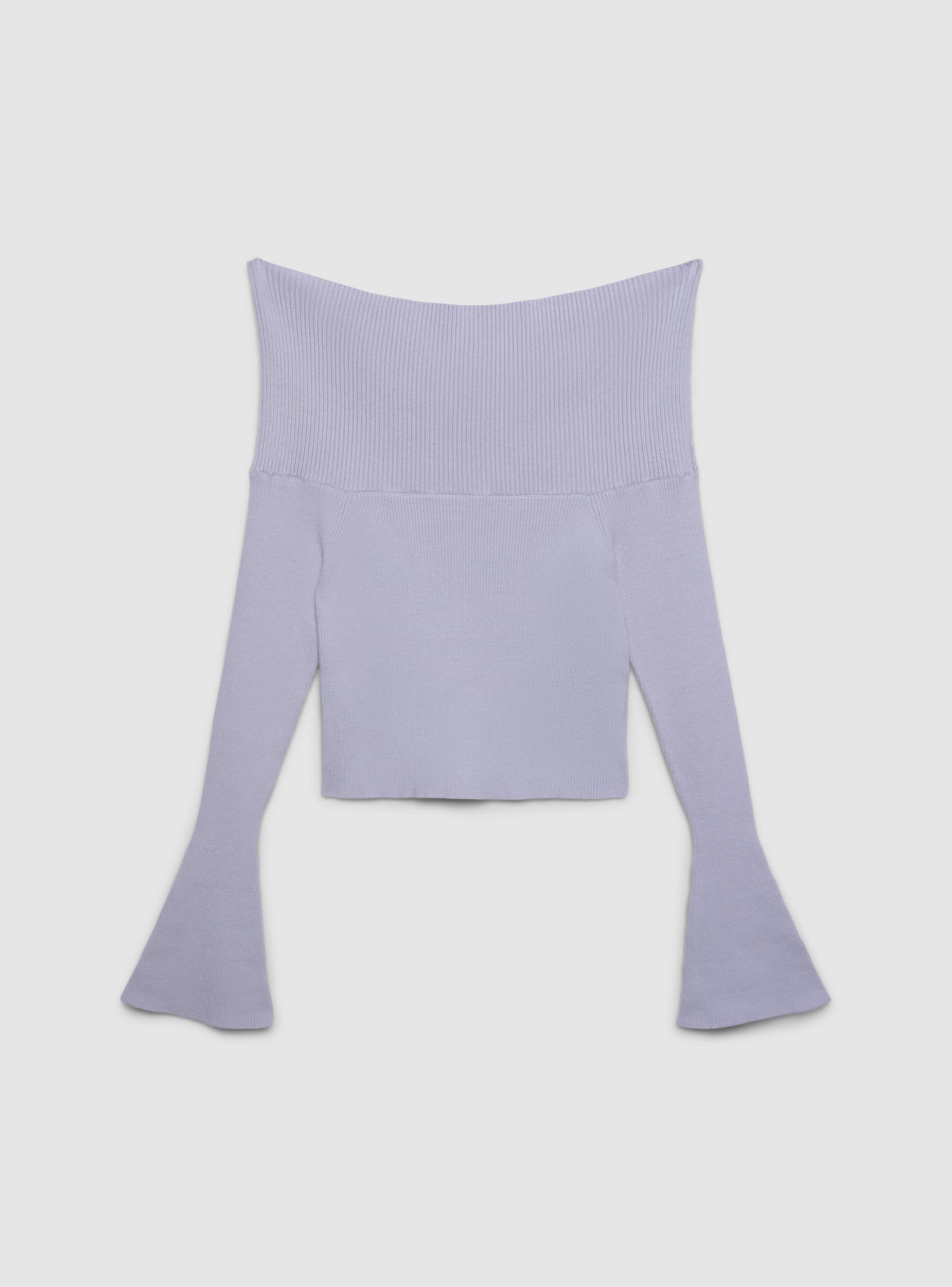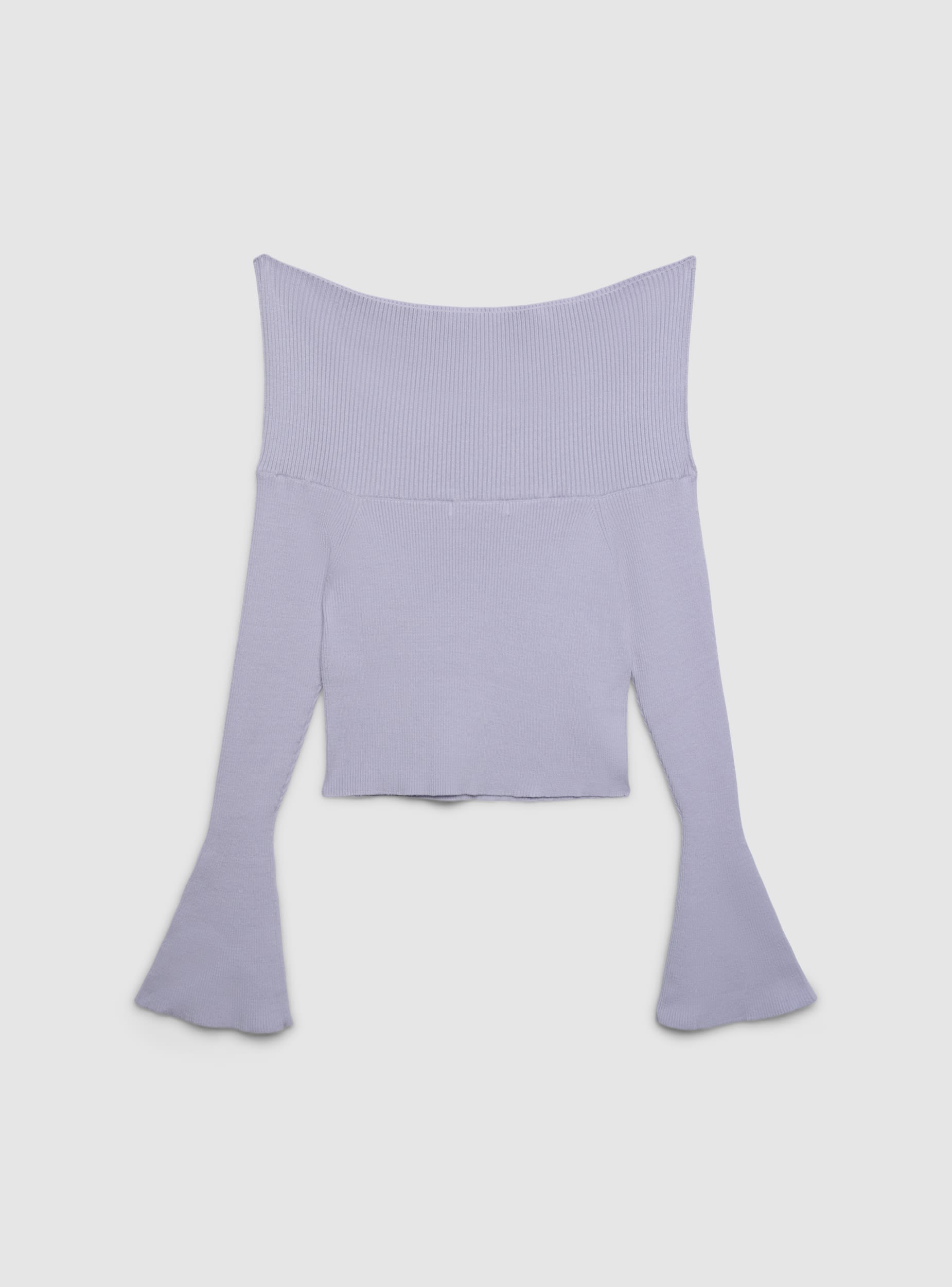 Ženska crop majica s golim ramenima, savršena za trendi izgled i večernje izlaske. Duge zvonaste rukave dodaju ženstveni dodir. Rebrasti rad na gornjem dijelu ističe siluetu. Uski kroj na grudima. Jednobojna, lako se kombinuje s trapericama visokog struka, midi suknjama ili elegantnim pantalonama.Detalji