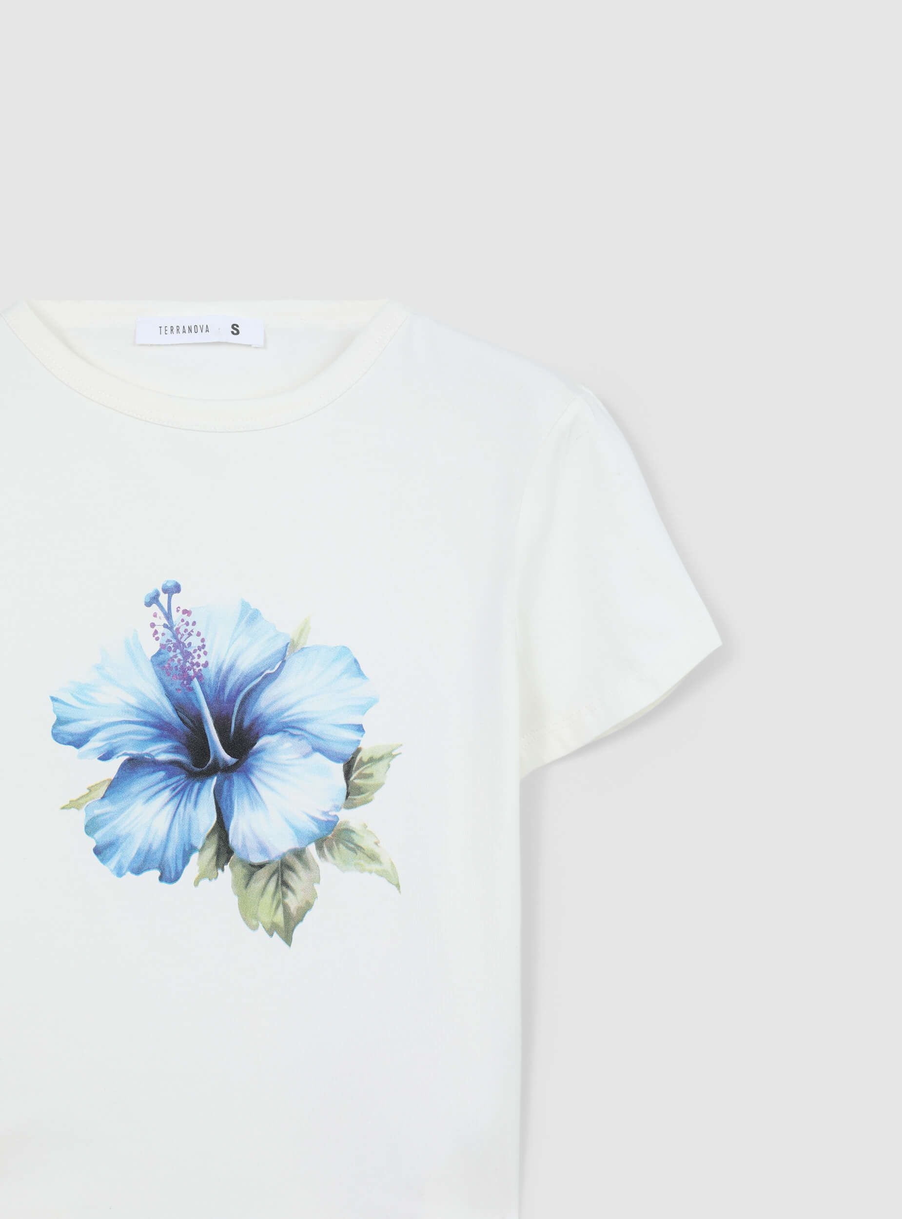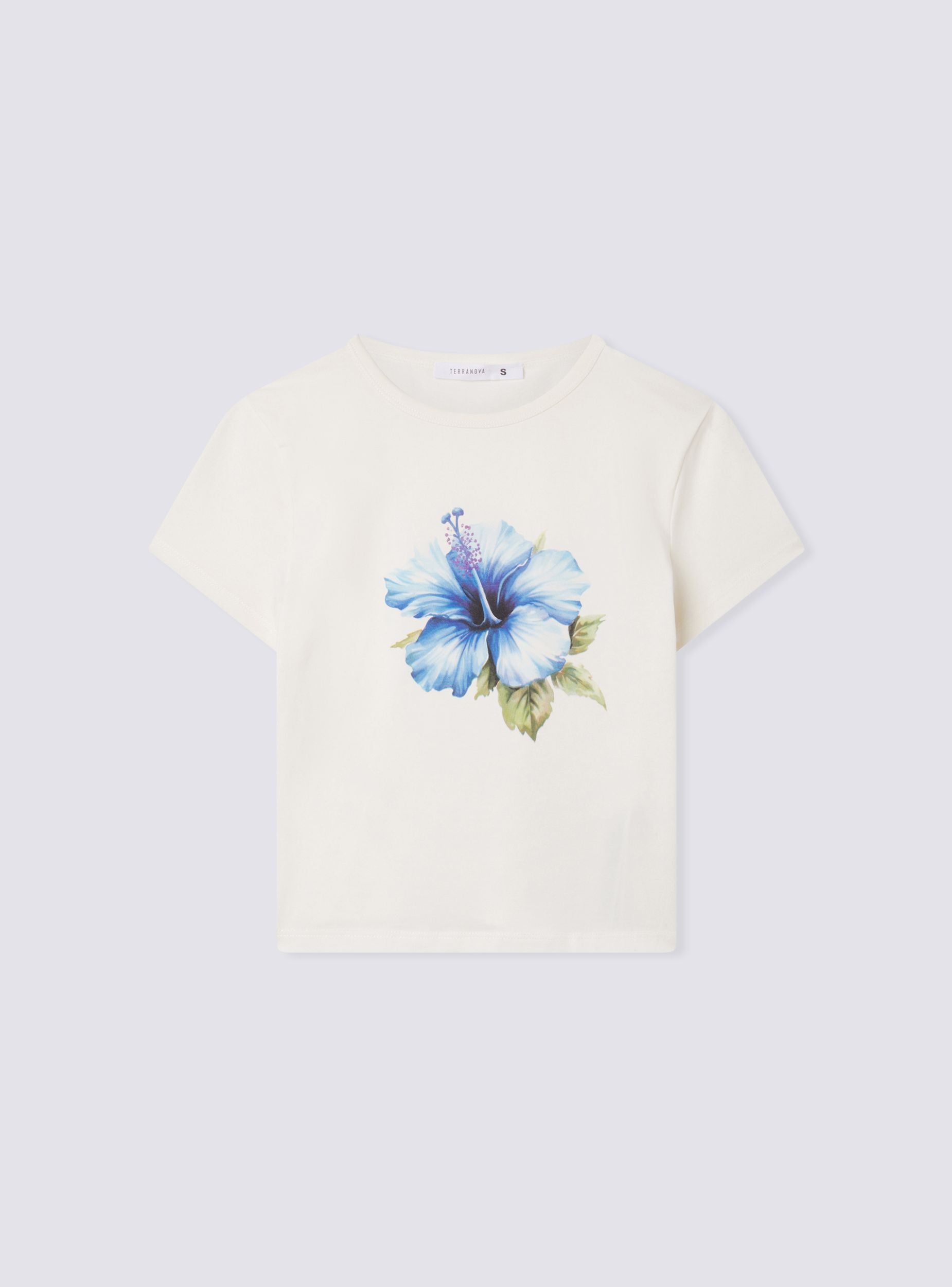 Ženska majica s kratkim krojem savršena za ljetni i modni izgled. Dizajn se ističe okruglim izrezom i kratkim rukavima koji osiguravaju udobnost i slobodu kretanja. Print s cvijetom hibiskusa dodaje nježan i tropski dodir, idealan za ležerne i svježe kombinacije. Uparena s trapericama ili suknjama visokog struka, postaje savršeni komad za dane na plaži ili šetnje gradom.Detalji