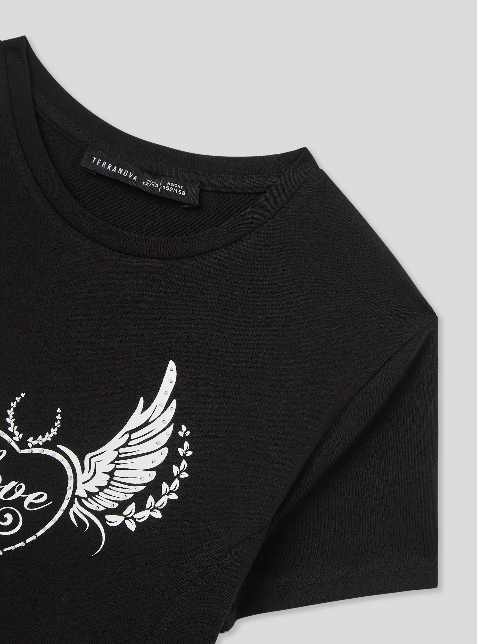 Majica za djevojčice s odvažnim izgledom, savršena za izražavanje odlučne i stilom orijentirane osobnosti. Ovaj crop model s kratkim rukavima i okruglim izrezom ističe se otisnutim rebel stilom, obogaćenim detaljima od kristala koji dodaju dašak sjaja. Idealna za ležerne i trendi outfite, namijenjena je onima koji žele izgledati moderno s karakterom.Detalji