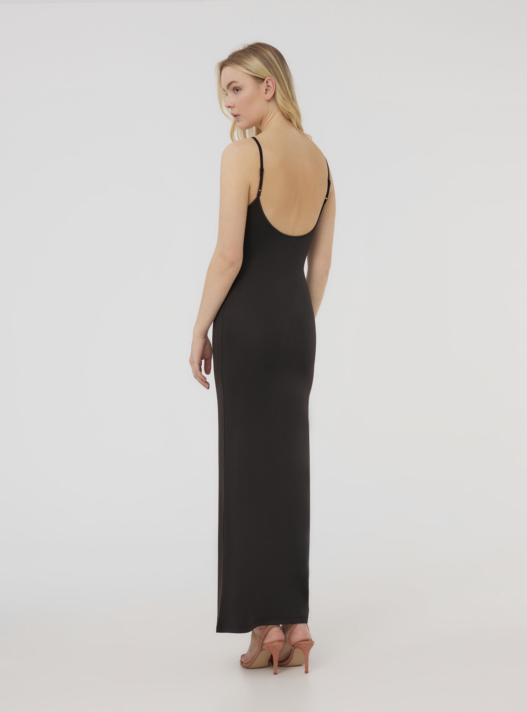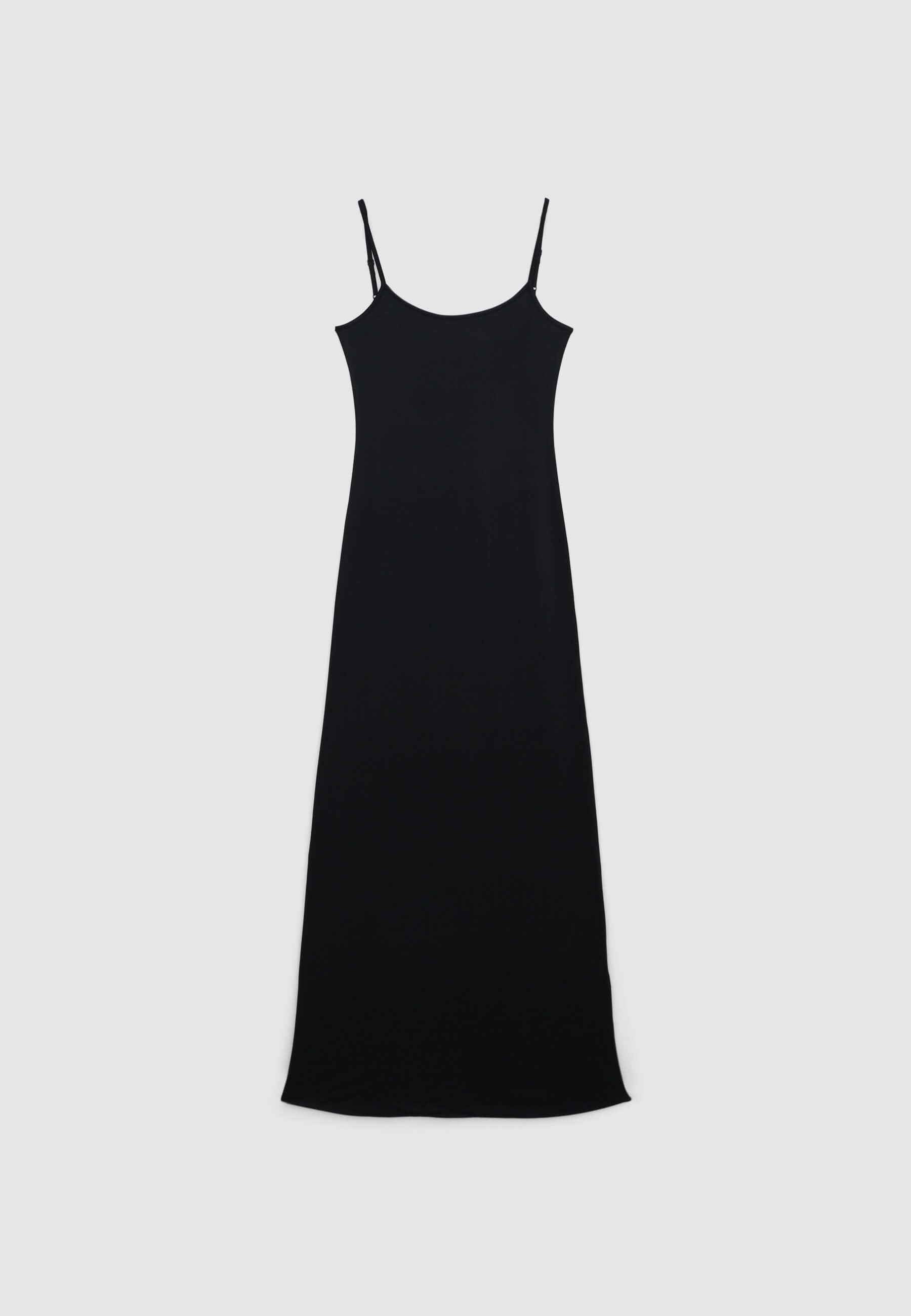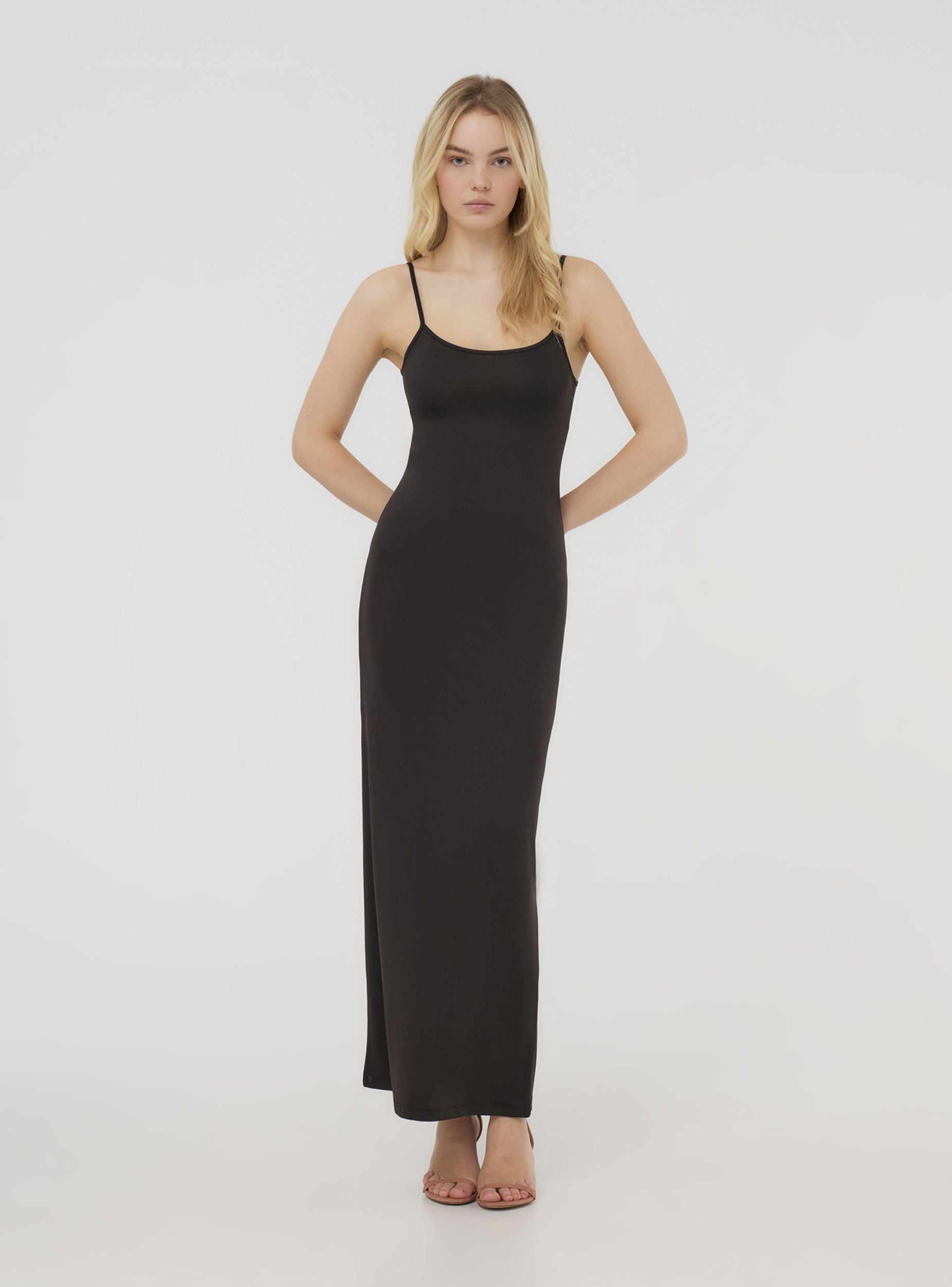Ženska haljina jednostavne boje, duga i obavijajuća, s esencijalnim i rafiniranim stilom. Bodydress dizajn ističe figuru, dok tanke podesive naramenice nude savršeno prilagođavanje tijelu, pružajući udobnost i praktičnost. Haljina ima jednostavan i delikatan izrez, idealna za kombiniranje s elegantnim dodacima ili casual-chic izgledom. Savršena za ljetne večeri ili elegantne događaje, zahvaljujući svom linearnom i uskom kroju koji diskretno i elegantno naglašava prirodne linije tijela.Detalji