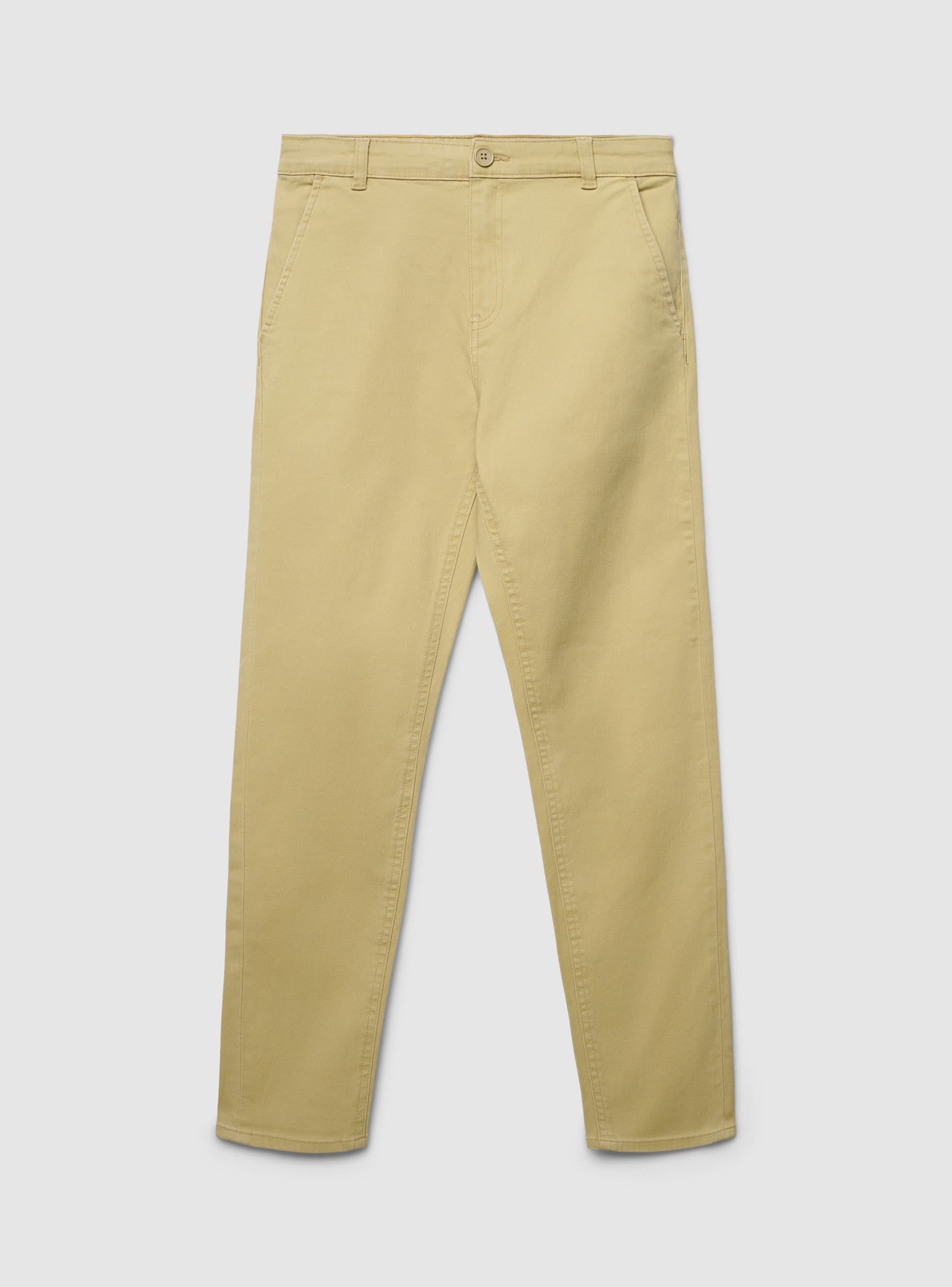 Dječije dugačke pantalone u chino stilu jednobojne, savršene za školu i slobodno vrijeme. Struk sa petljama za pojas, zatvaranje na dugme i rajsferšlus. Prednje džepove u francuskom stilu i lažne džepove na leđima za uredan izgled. Regular kroj sa ravnim nogavicama, lako se kombinuju sa košuljama ili duksericama za pažljivo i svestrano odijevanje.