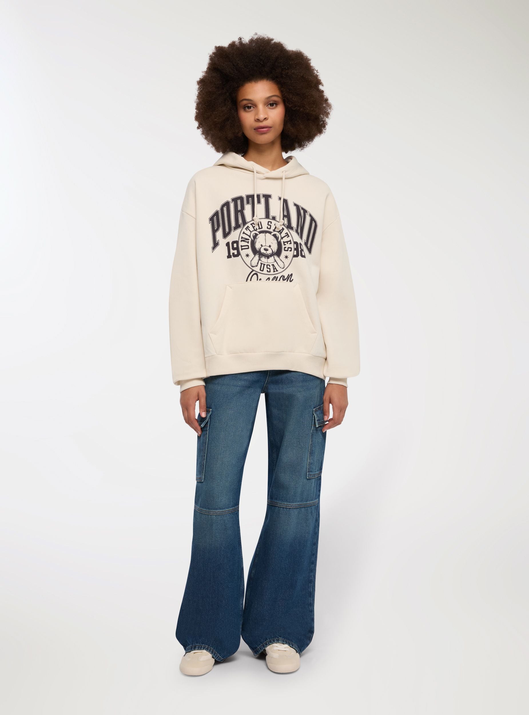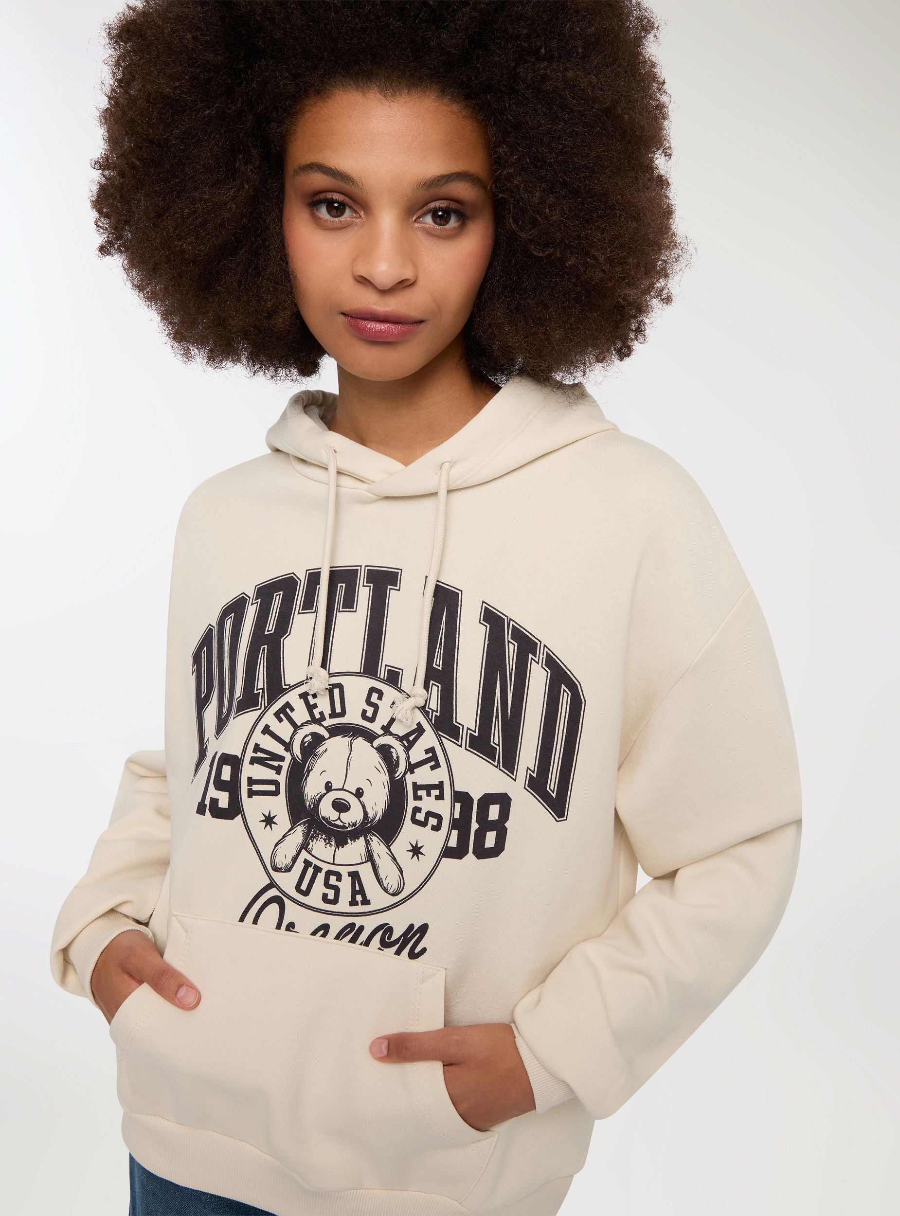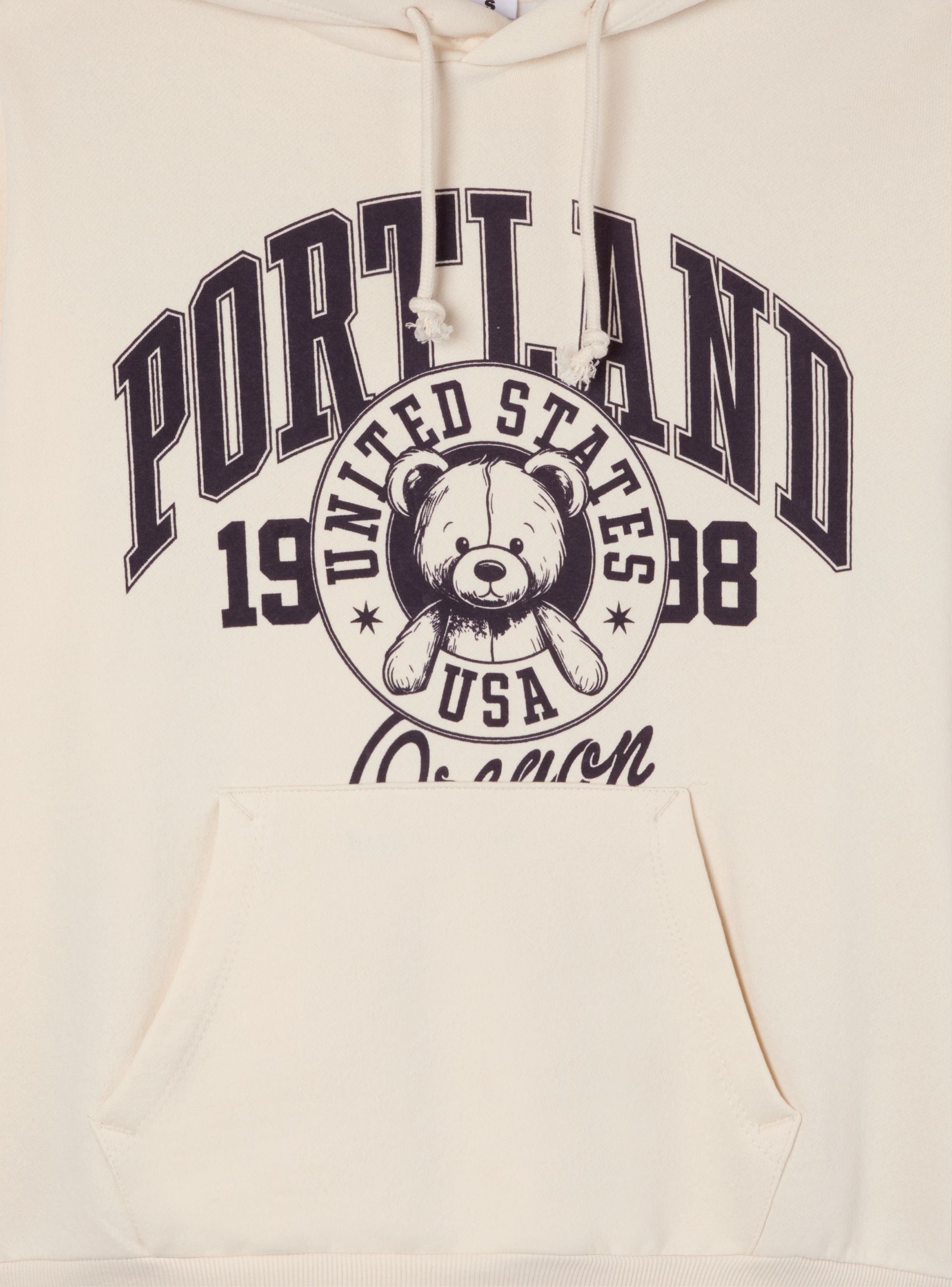 Ženska teška dukserica savršena za zimu, s kapuljačom i podesivom vezicom za prilagođenu udobnost. Model bez zipa obogaćen je prednjim džepom u obliku torbe, idealnim za grijanje ruku. Maxi print "Portland Oregon" s natpisima u college stilu i simpatičnom medvjediću u središtu daje originalan i privlačan izgled. Idealna za ležerne, ulične ili sportske kombinacije, za svakodnevno nošenje.Detalji