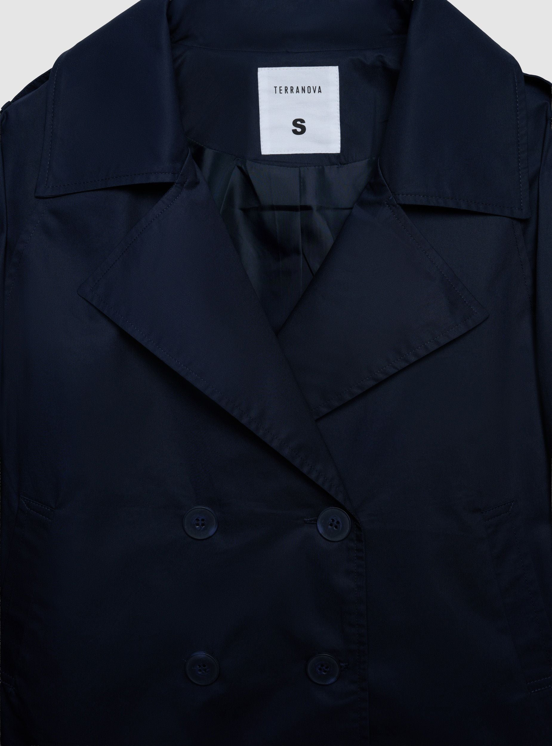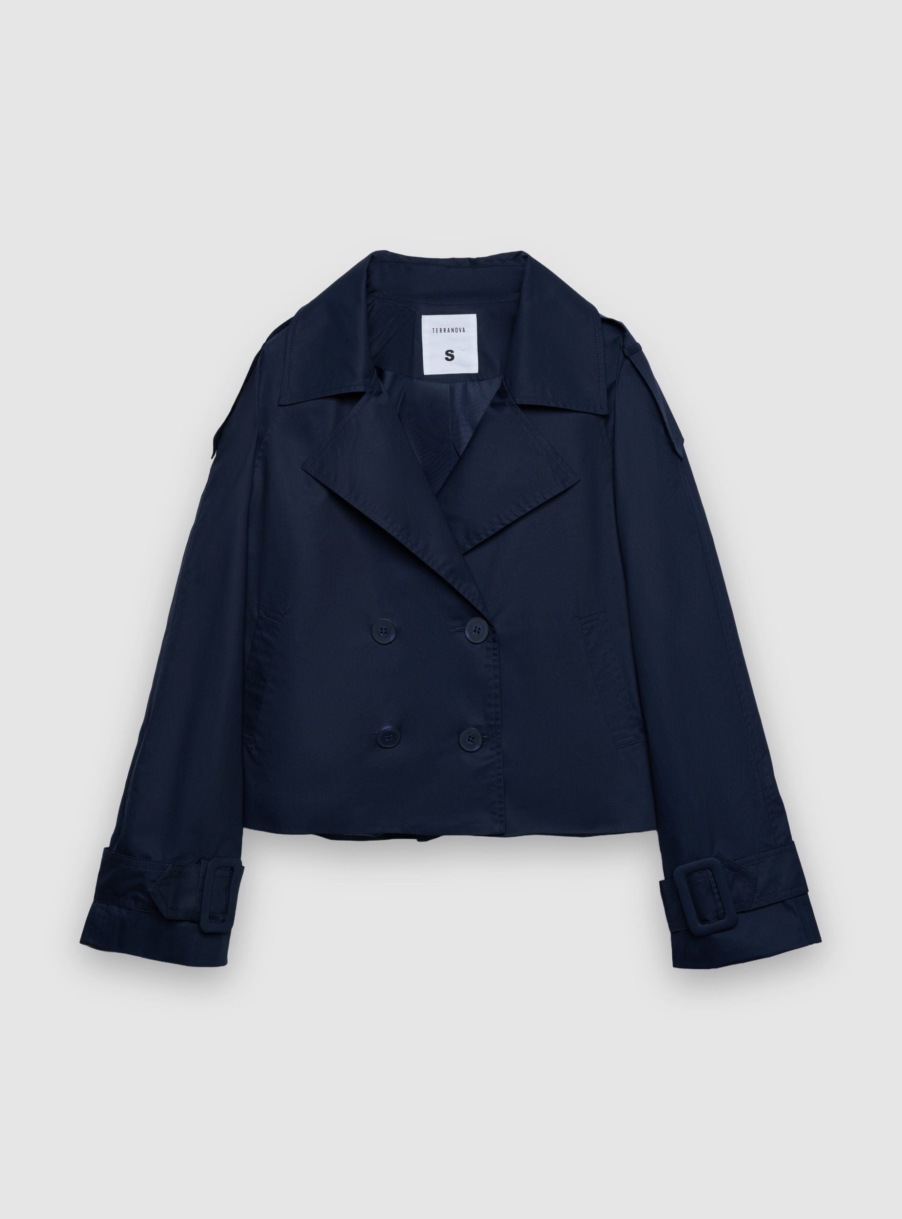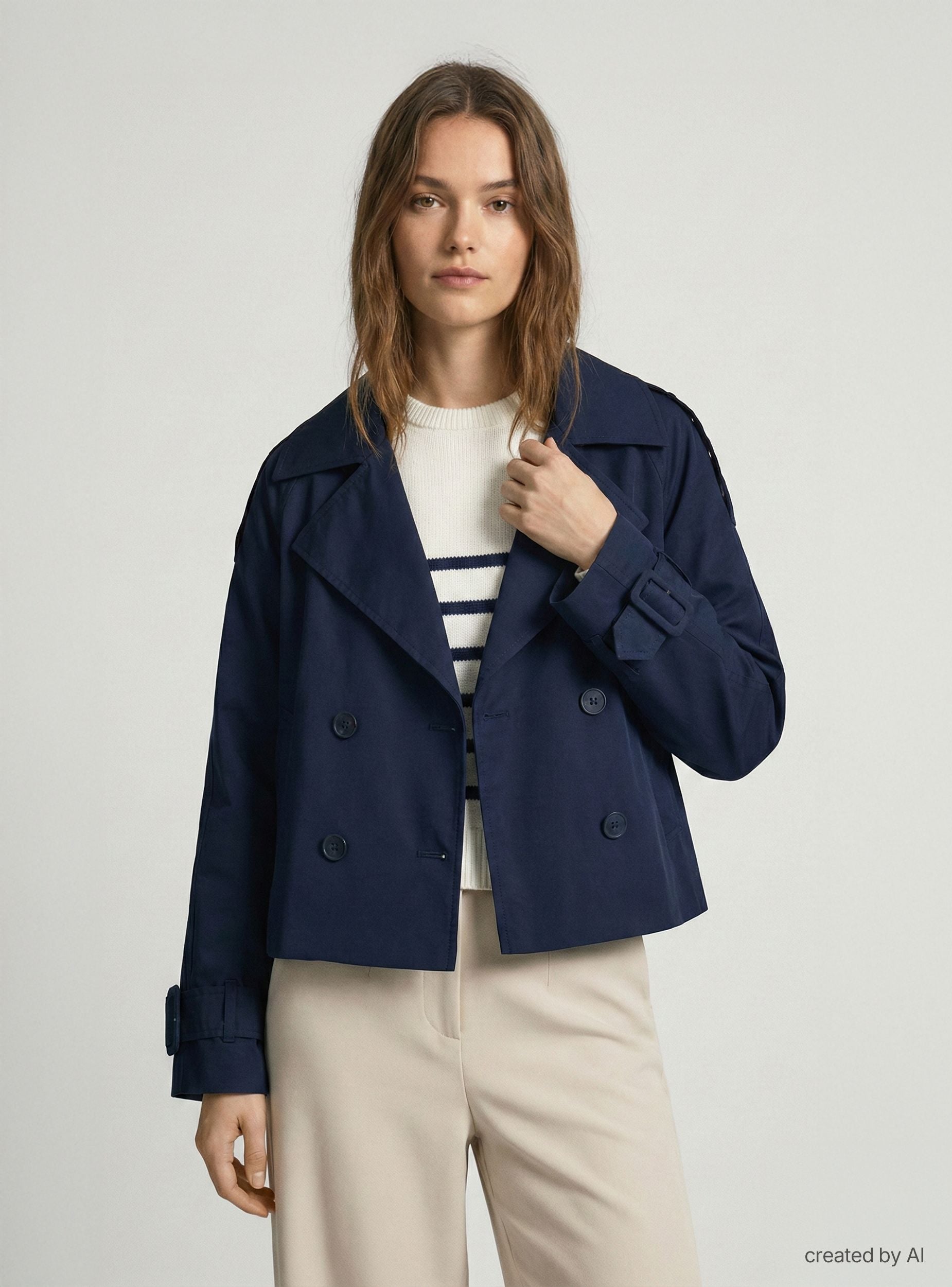 Ženski jednobojni trench kaput s dvorednim dizajnom i rever ovratnikom. Kratki model regularnog kroja, idealan za nošenje uz traperice ili elegantne pantalone za svakodnevnu upotrebu ili u kancelariji. Duge rukave krase podesivi remenčići na zglobovima i epolete na ramenima koje daju urbani šarm. Bočni džepovi sa otvorom i prednje zakopčavanje na dugmad upotpunjuju svestrani izgled.Detalji