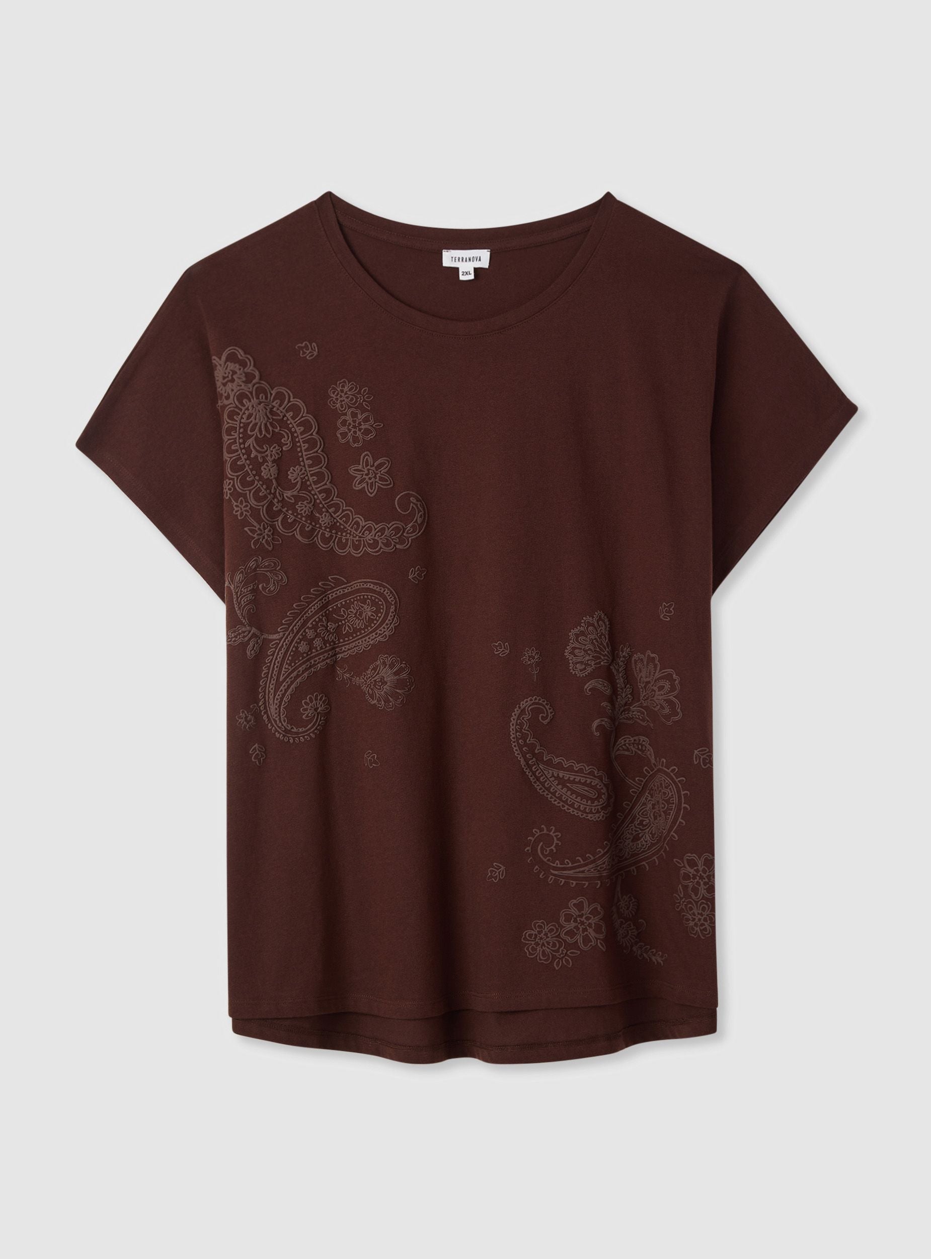 Ženska majica kratkih rukava s reljefnim printom paisley uzorka po cijeloj površini, idealna za casual i urbani stil. Okrugli izrez i blago spušteni rameni dio za udobno pristajanje koje pada ravno na bokove. Savršena uz traperice ili lagane pantalone, može se nositi ispod laganih blejzera ili kardigana za kompletan izgled. Model u jednobojnoj varijanti s ton na ton grafikom koja dodaje karakter bez pretjerivanja.Detalji