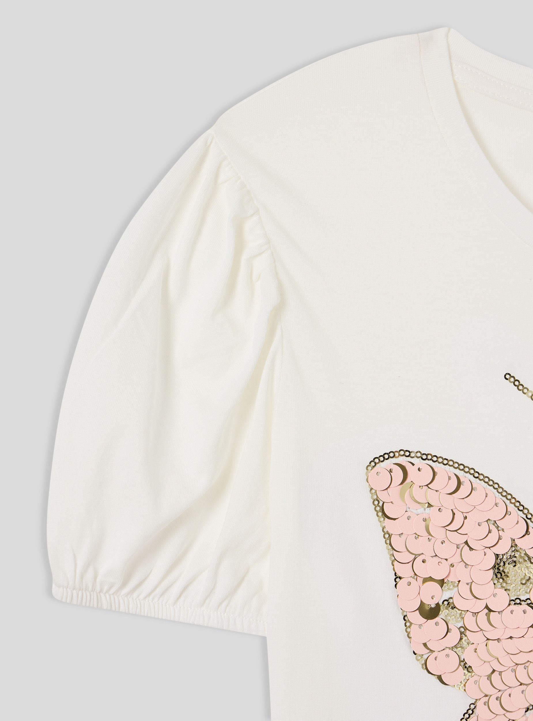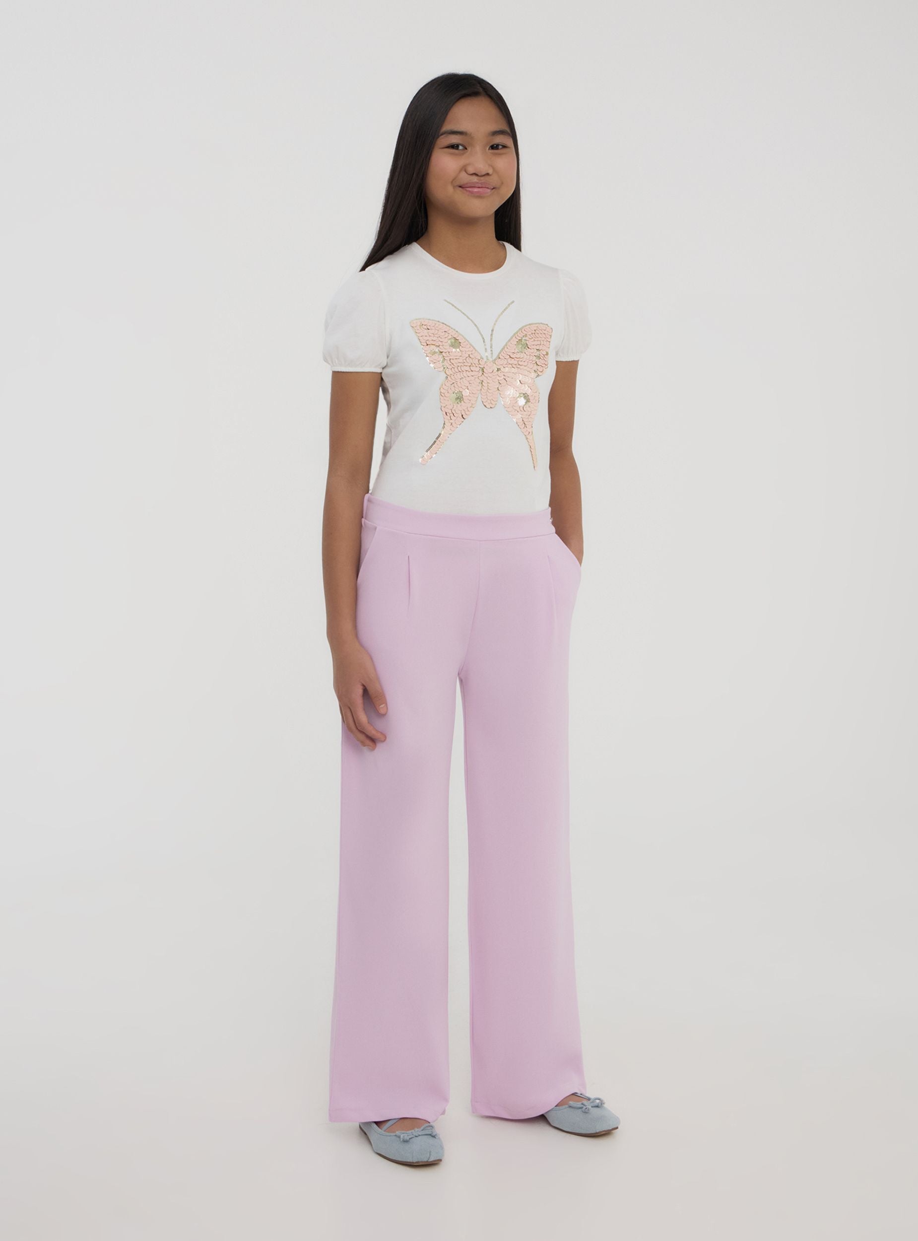 Majica za djevojčice romantičnog i svijetlog dizajna, s kratkim rukavima i okruglim izrezom za idealnu udobnost u svakom trenutku. Velika leptir ukrašen šljokicama dodaje sjajan i razigran dodir. Savršena za kombiniranje s trapericama, tajicama ili suknjama za stvaranje veselog i svestranog izgleda, idealna je za školu, slobodno vrijeme i posebne prilike kada želite zasjati sa stilom.Detalji