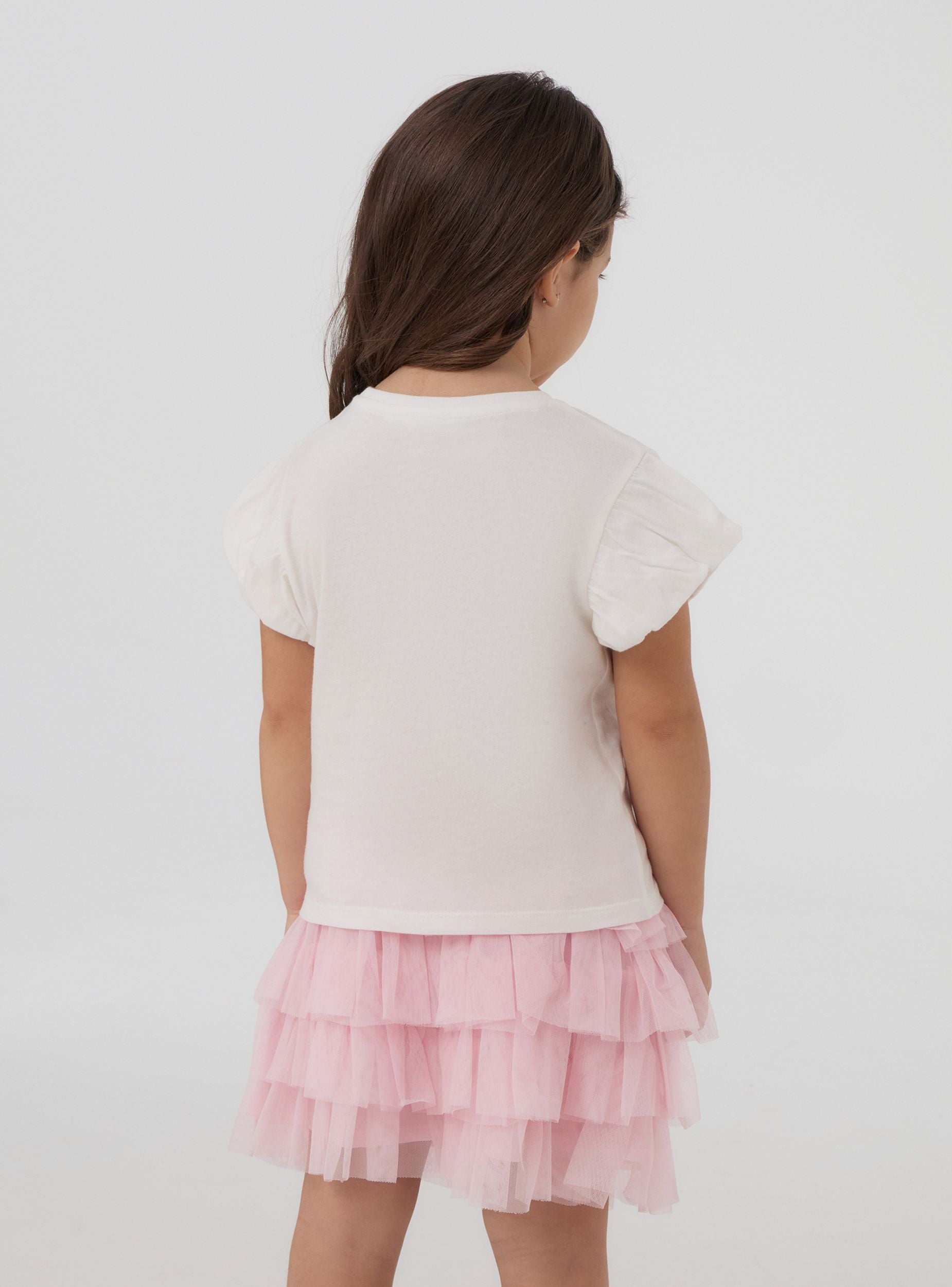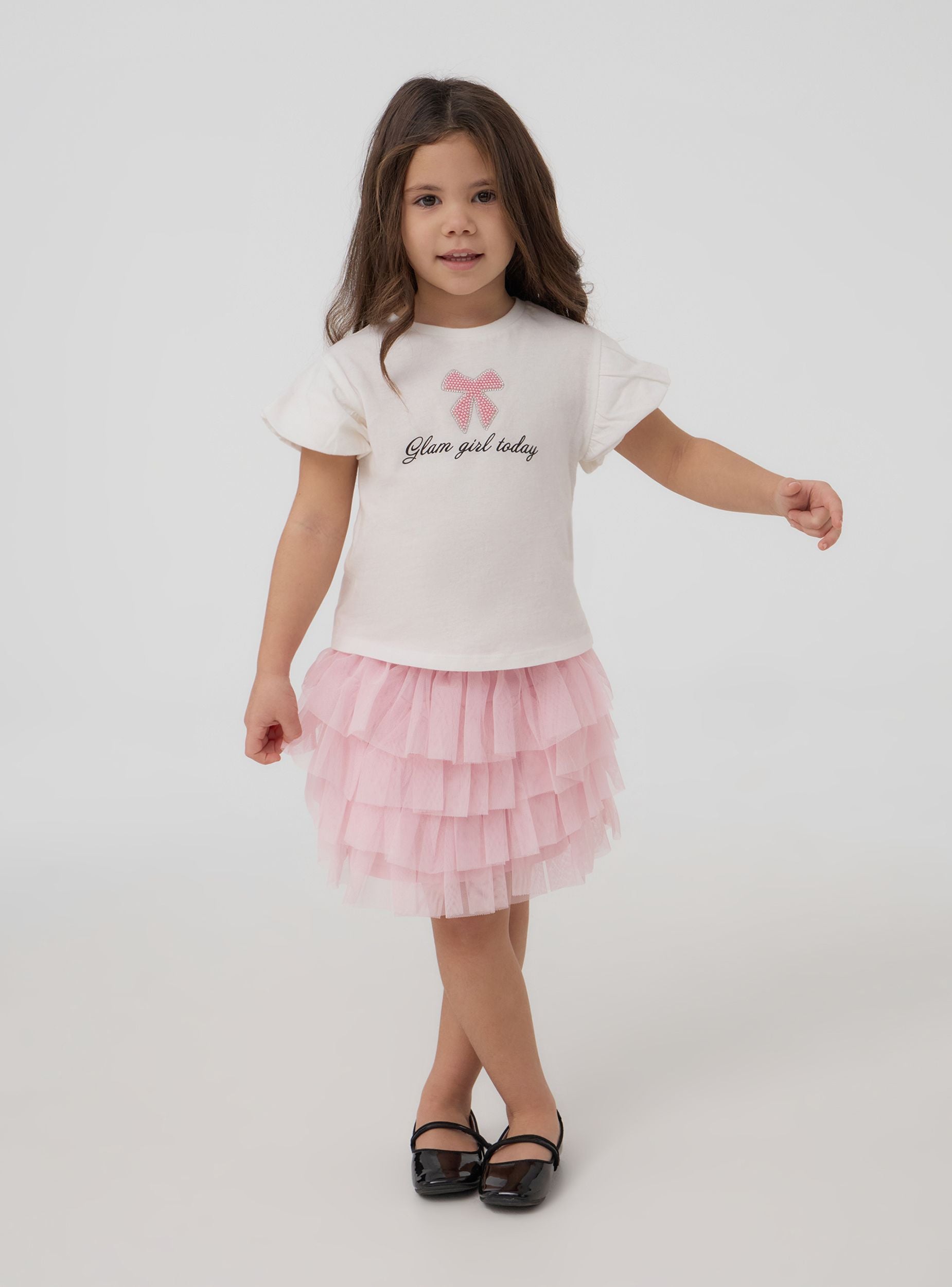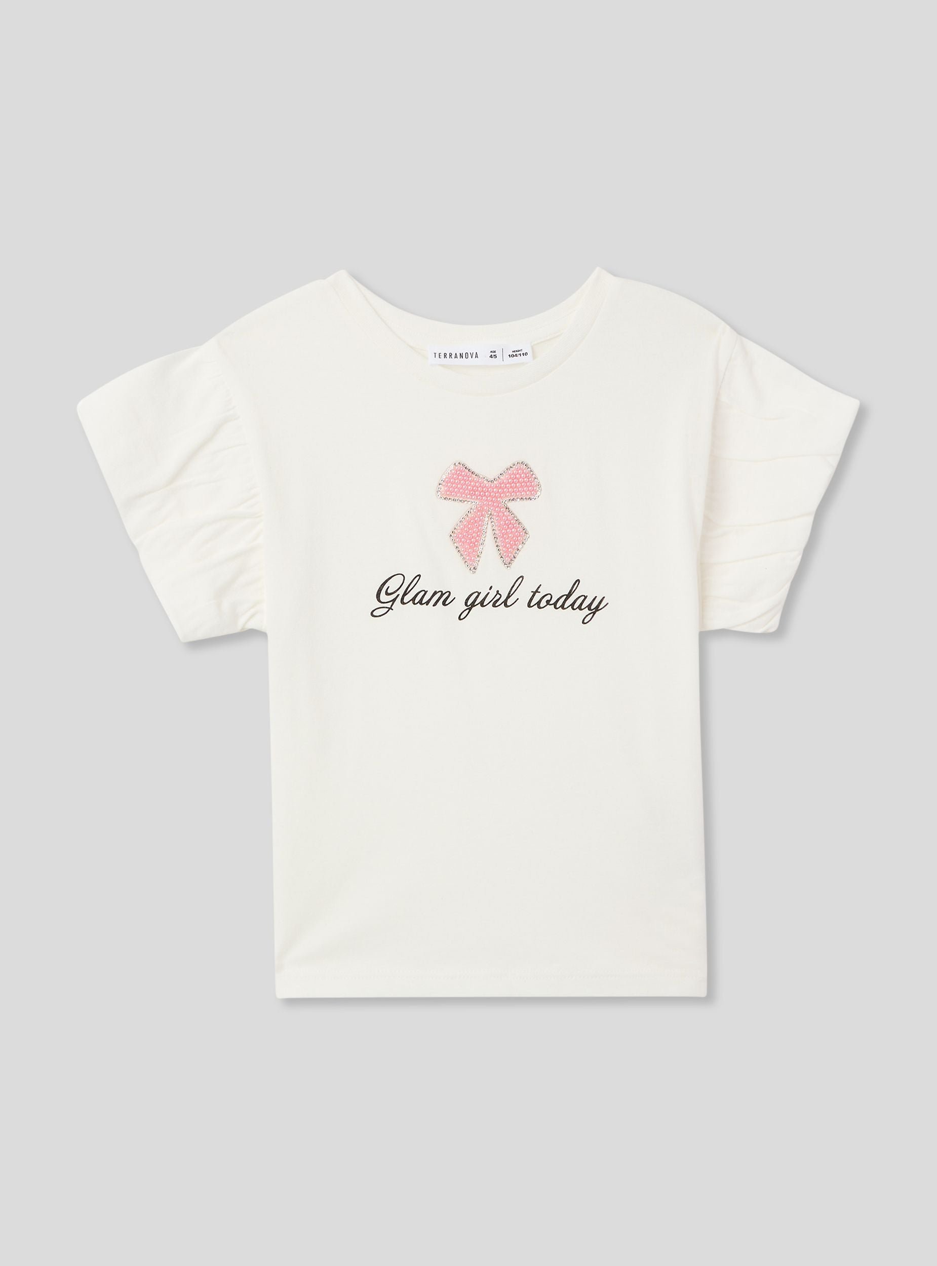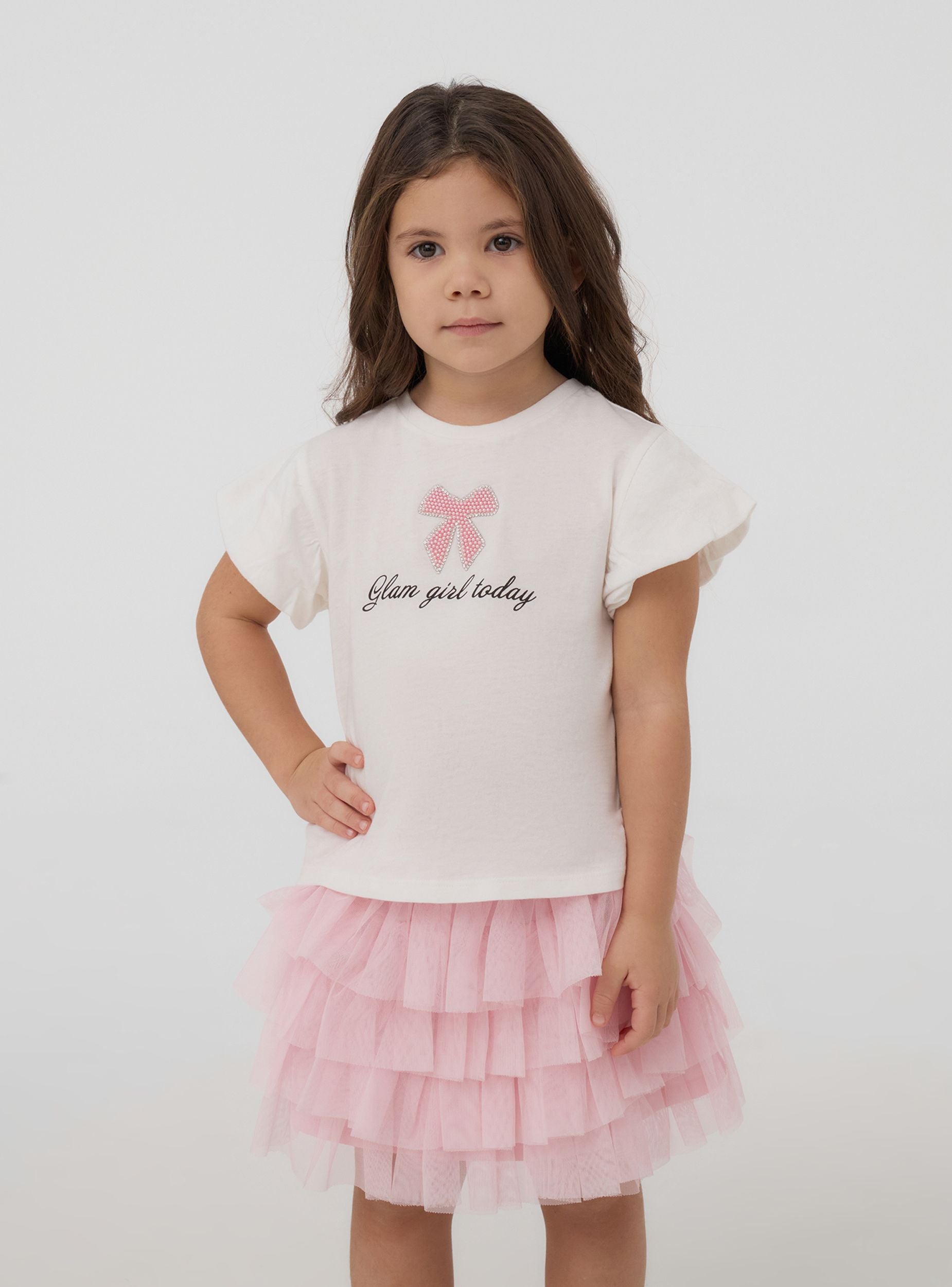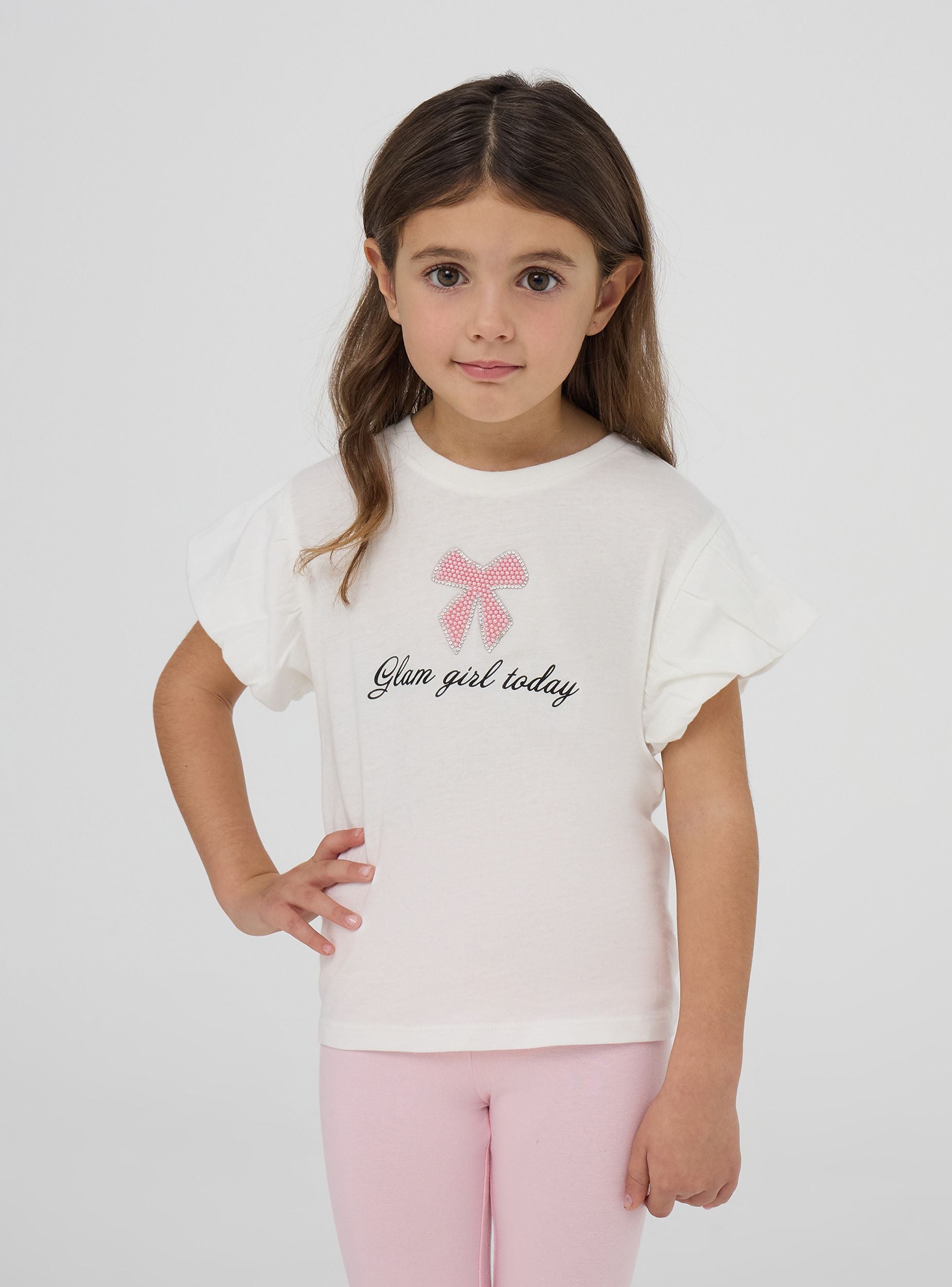 Majica za djevojčice savršena za ležeran i moderan izgled, idealna za školu ili izlaske s prijateljima. S kratkim rukavima i okruglim izrezom, spaja udobnost i stil. Ispis je obogaćen mašnom s sjajnim aplikacijama i natpisom "Glam girl today", što dodaje dašak originalnosti.Detalji