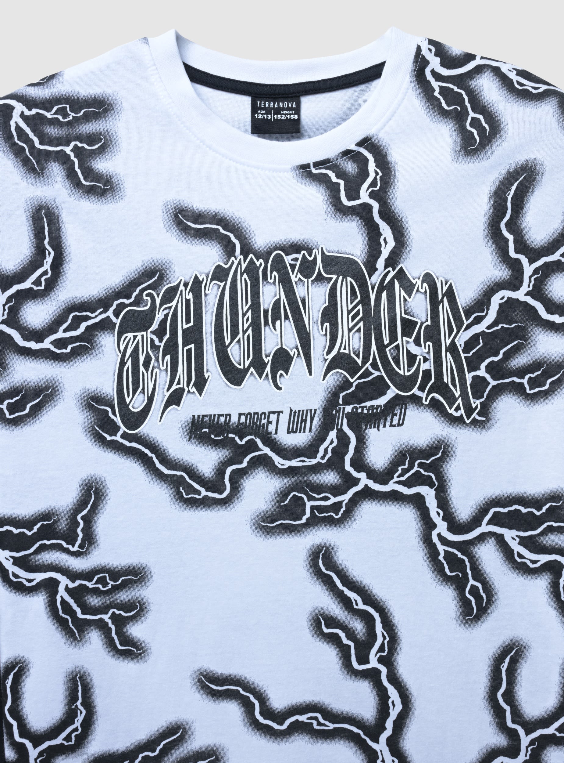 Dječja majica dugih rukava s printom munja. Idealna za ležeran i moderan izgled, ova majica ističe se privlačnim dizajnom i udobnim krojem. Savršena za kombiniranje s trapericama ili sportskim hlačama, prikladna je za slobodno vrijeme i svakodnevne aktivnosti. Grafički print dodaje dašak originalnosti odjevnom predmetu, čineći ga jedinstvenim i modernim.Detalji
