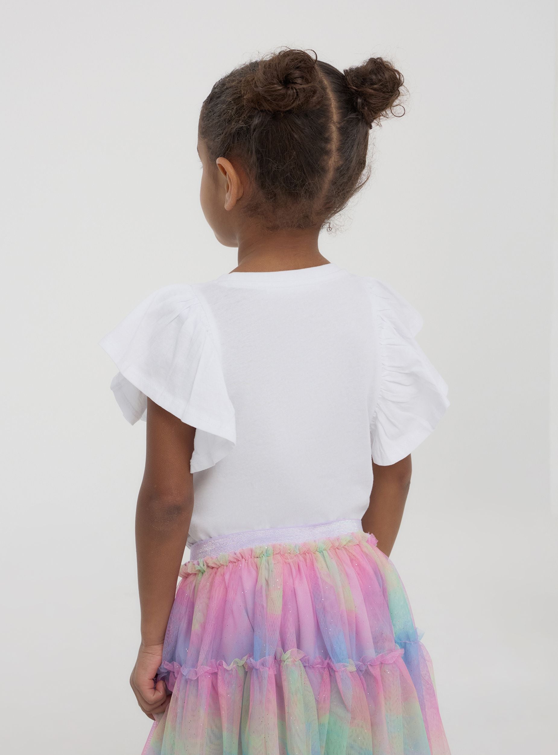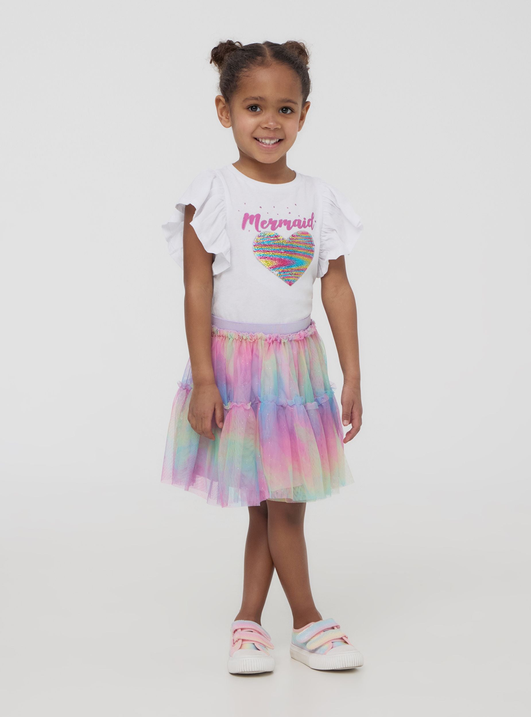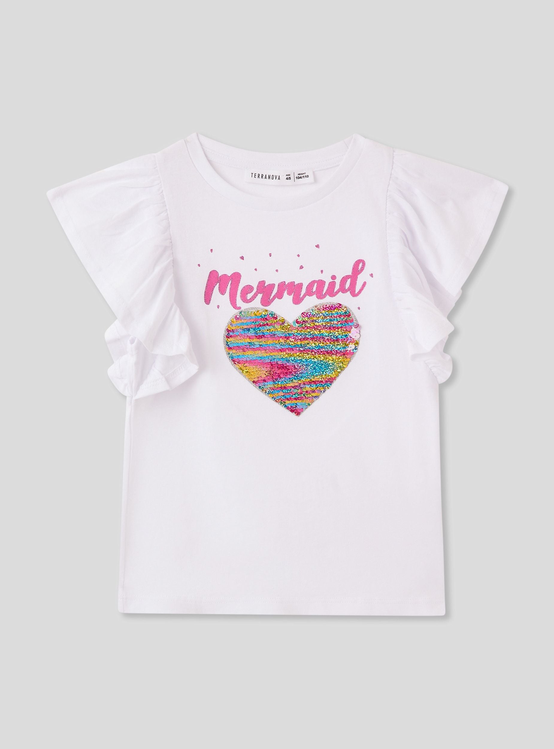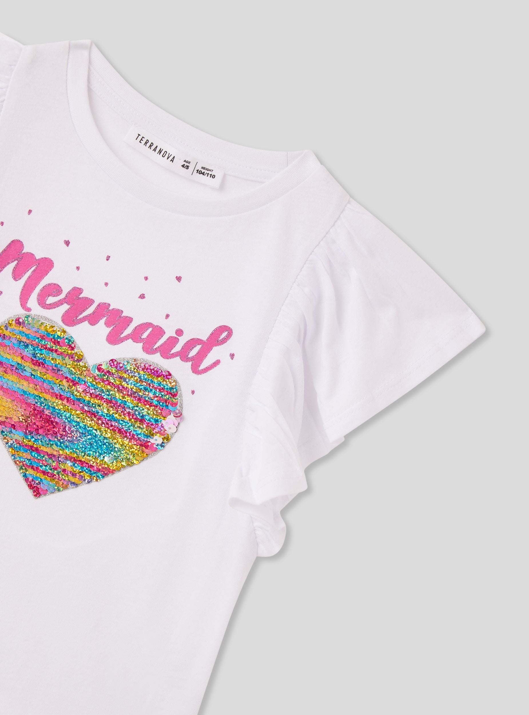 Majica za djevojčice s daškom magije savršena za stvaranje veselog i originalnog izgleda. Široki kratki rukavi dodaju lepršavi efekt, dok okrugli izrez osigurava udobnost i praktičnost. Dizajn je obogaćen sjajnim srcem ukrašenim šljokicama s promjenjivim refleksima i svijetlim natpisom s glitterom, idealno za živahnu odjeću. Savršena uz traperice, kratke hlače ili suknje za ležeran ili ženstven izgled.Detalji