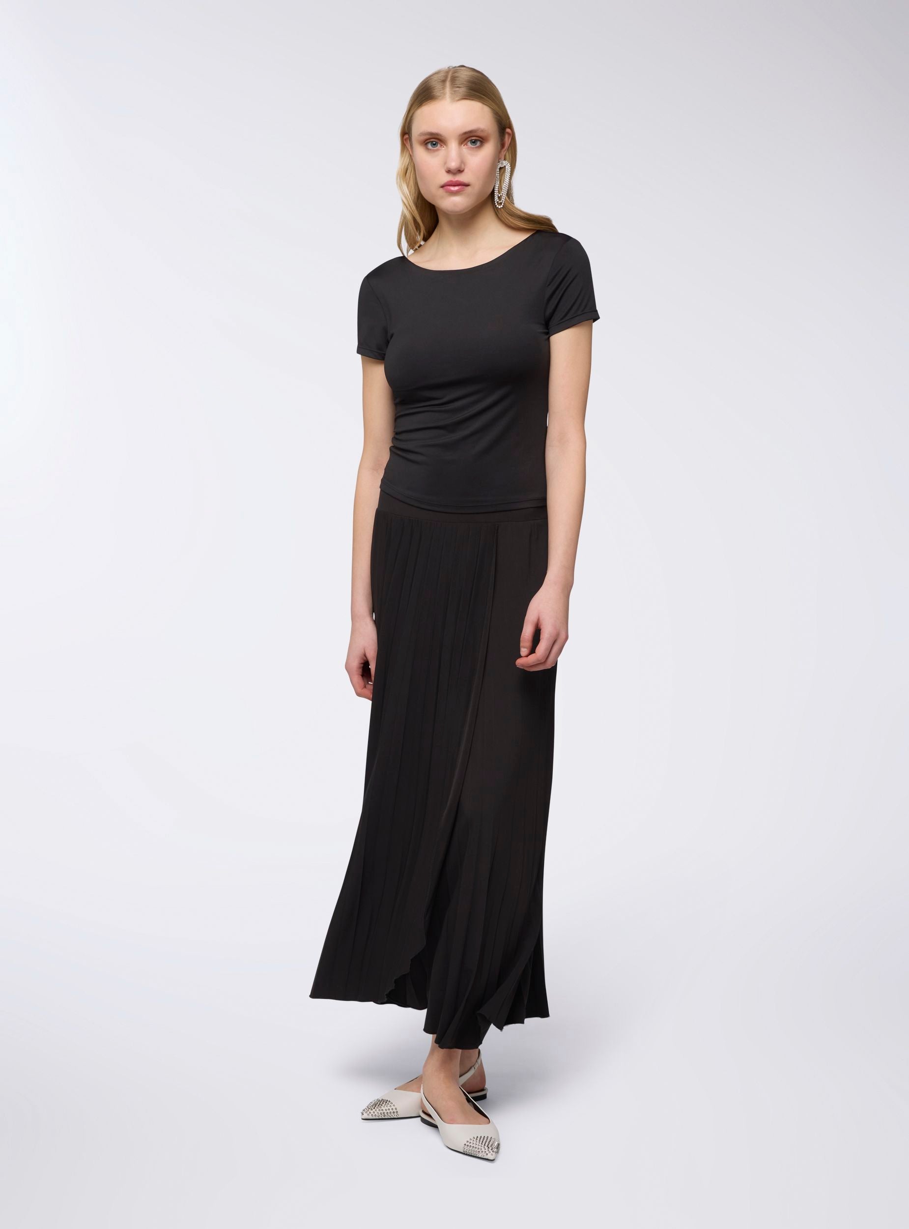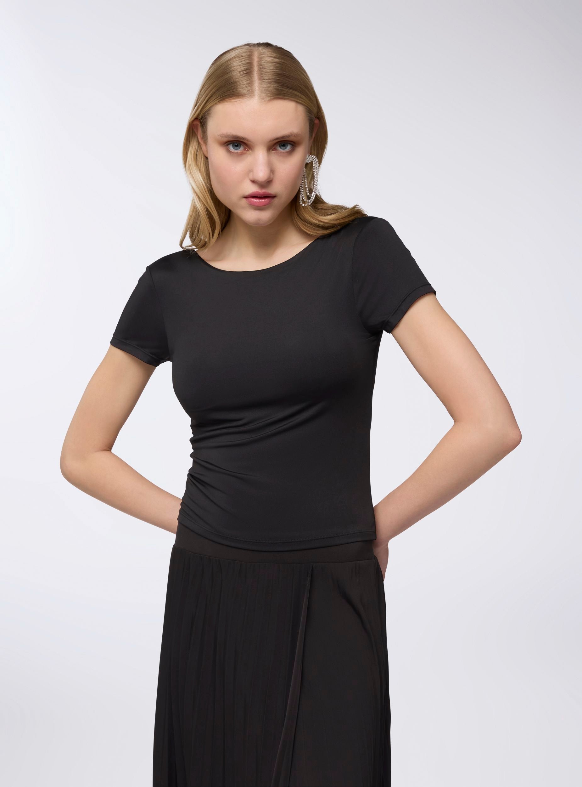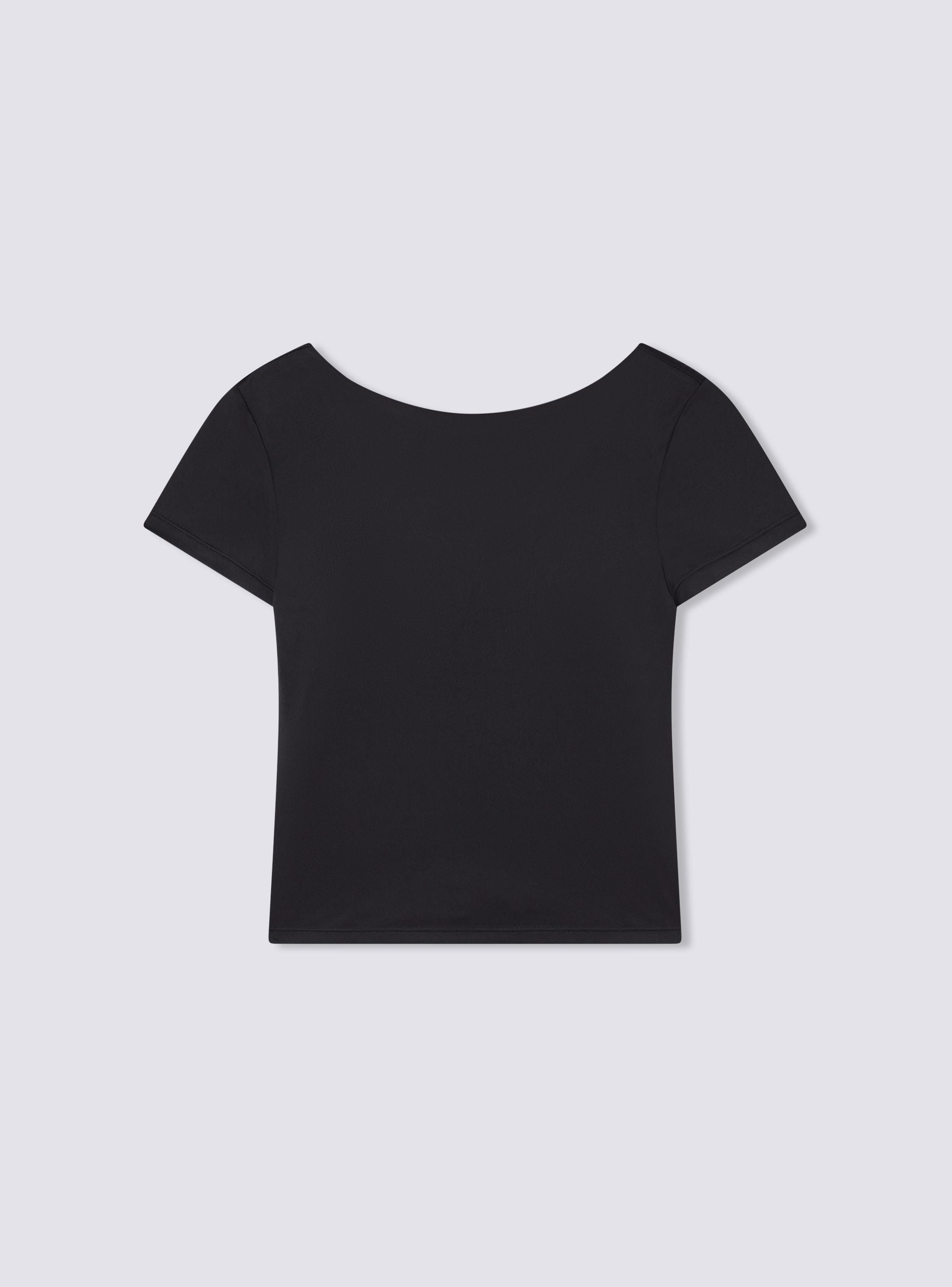 Ženska majica s ženstvenim i obavijajućim dizajnom, karakterizirana uskim krojem i elastičnom tkaninom koja ističe obline. Kratki rukavi i široki izrez na leđima daju sofisticirani dodir. Unutarnje šalice osiguravaju potporu i udobnost. Savršena za kombiniranje s trapericama, suknjama ili hlačama visokog struka, idealna je za casual chic izgled ili večeri s daškom elegancije.Detalji