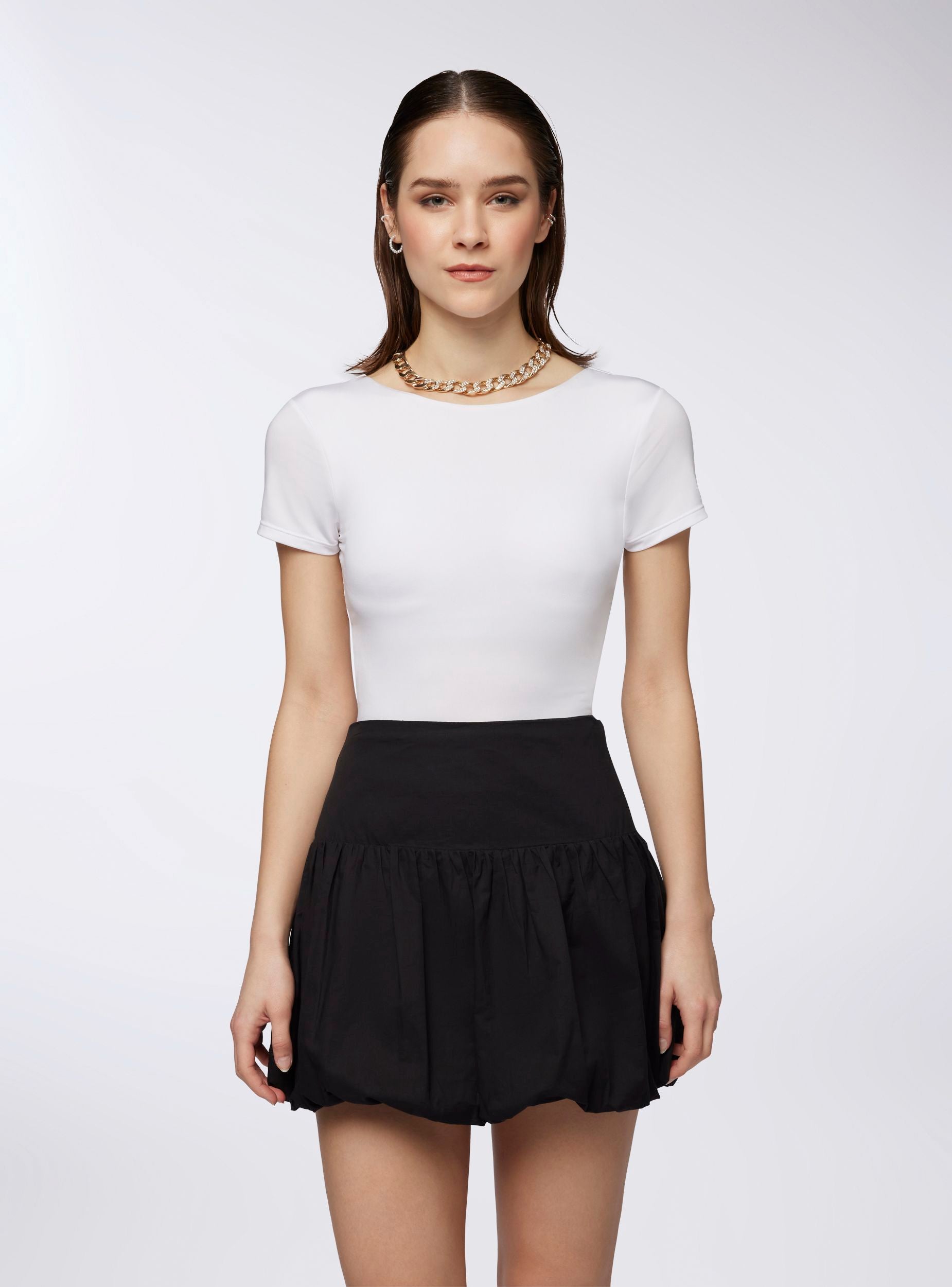 Ženska majica s ženstvenim i prilagodljivim dizajnom, karakterizirana uskim krojem i elastičnim materijalom koji ističe obline. Kratki rukavi i široki izrez na leđima daju rafinirani dodir. Unutarnje šalice osiguravaju potporu i udobnost. Savršena za kombiniranje s trapericama, suknjama ili hlačama visokog struka, idealna je za casual chic izgled ili večeri s daškom elegancije.Detalji