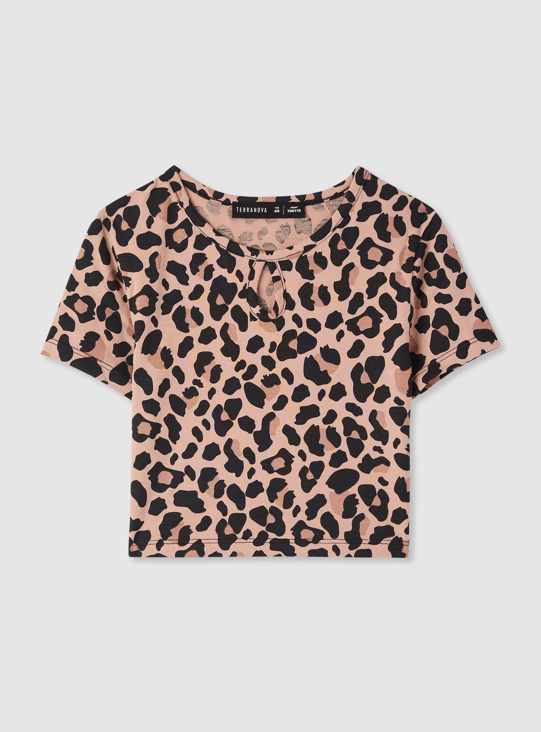 Majica za djevojčice sa animal printom, savršena za svakodnevne modne kombinacije sa trendi prizvukom. Model sa kratkim rukavima, okruglim izrezom i malim prorezom sprijeda koji dodaje ženski detalj. Regularan kroj, lako se kombinuje sa farmerkama, suknjama ili šortsevima za školu i slobodno vrijeme. Idealna za nošenje preko lagane dukserice ili kardigana u prelaznim godišnjim dobima.Detalji