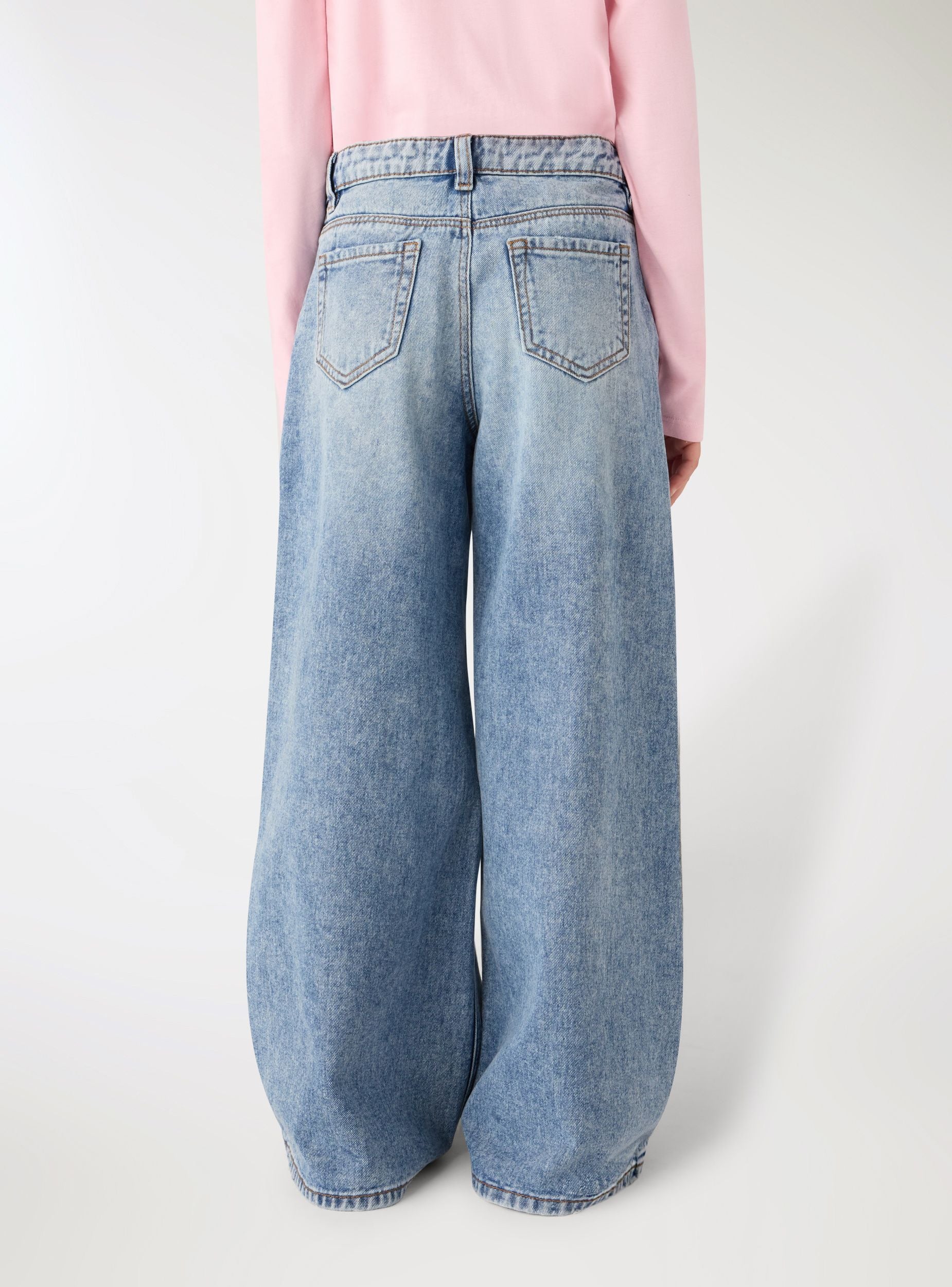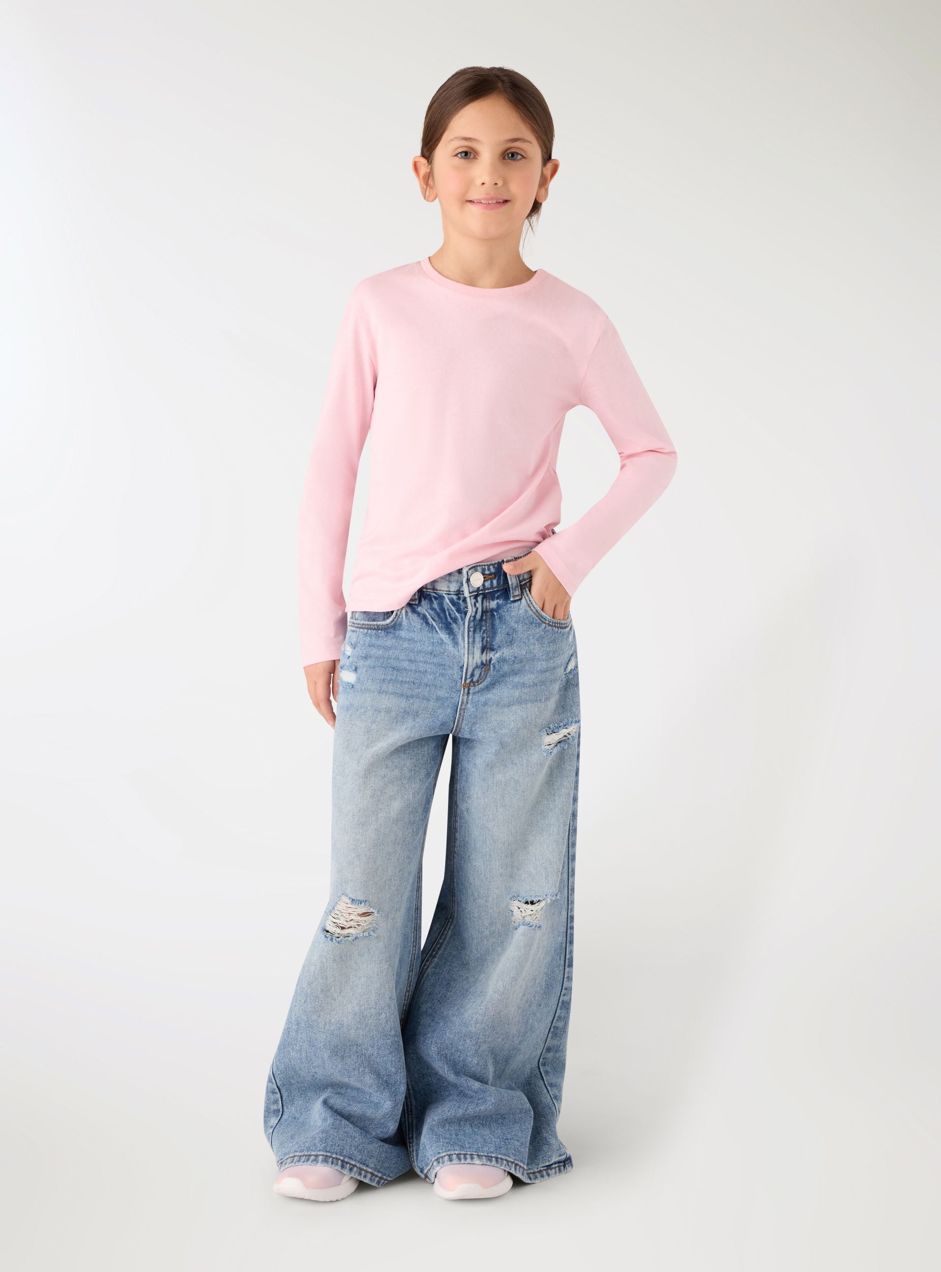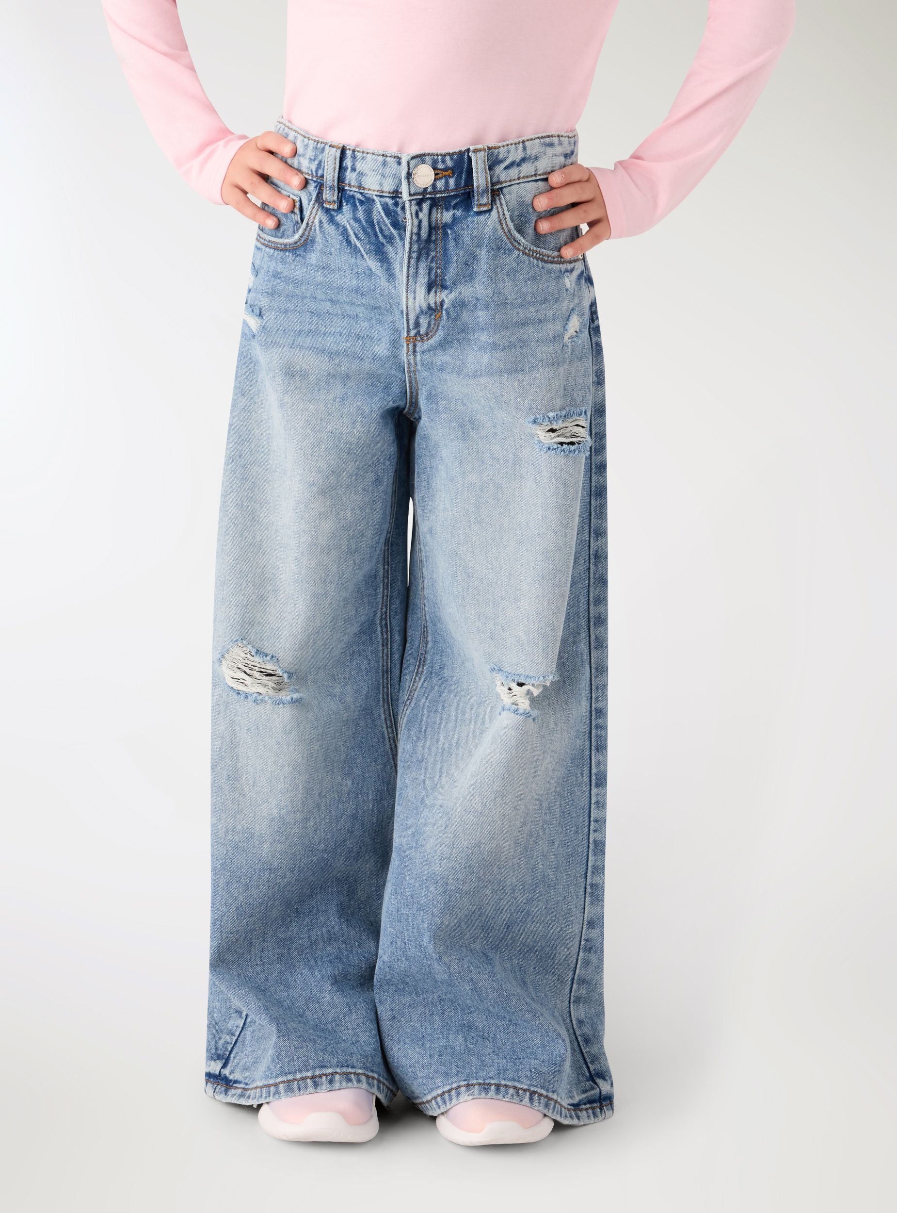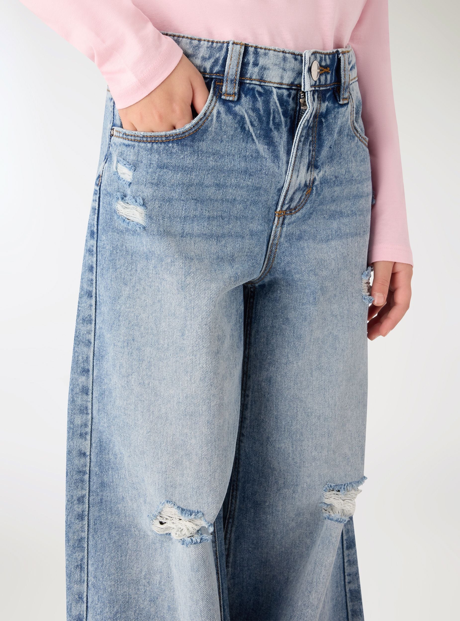 Traperice za djevojčice u jednobojnoj varijanti sa super širokim nogavicama, idealne za ležeran i ulični stil. Model sa regularnim strukom, ima proreze za remen, zatvaranje na dugme i rajsferšlus, kao i praktične bočne džepove s dodatnim malim džepom te zadnje džepove. Detalji sa poderotinama daju karakter i lako se kombinuju sa duksevima, majicama i patikama za školu i slobodno vrijeme.Detalji
