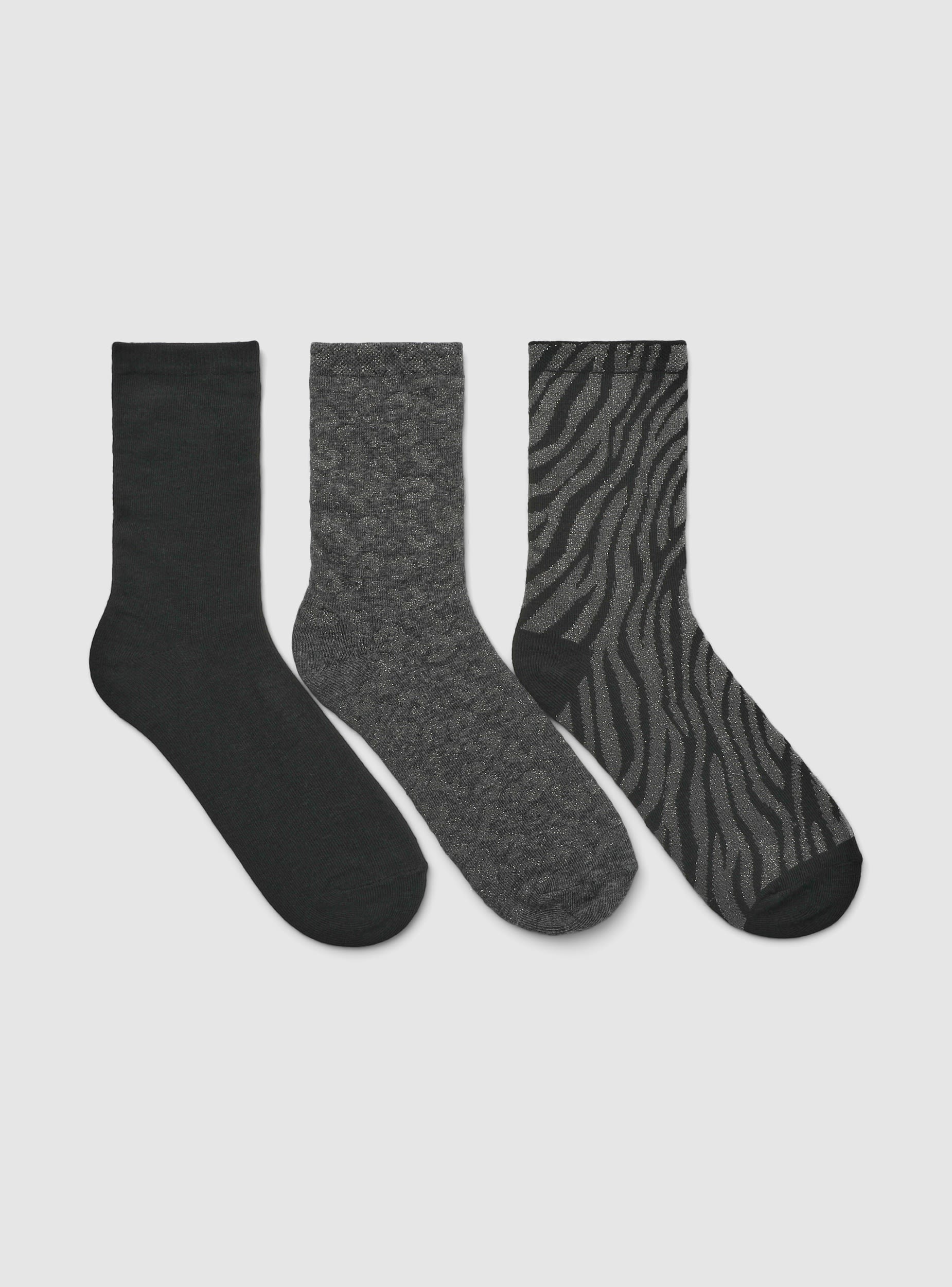 Ženske čarape idealne za dovršavanje casual i modernih outfita. Pakiranje uključuje tri para čarapa, dva s animal print uzorcima sa sjajnim efektom i jedan par u jednobojnoj varijanti, savršene za dodavanje stila vašim svakodnevnim kombinacijama. Standardna veličina osigurava udobnost i praktičnost, dok se svestrani dizajn prilagođava različitim prilikama. Idealne za kombiniranje sa sportskom ili casual obućom za trendi i udoban izgled.Detalji