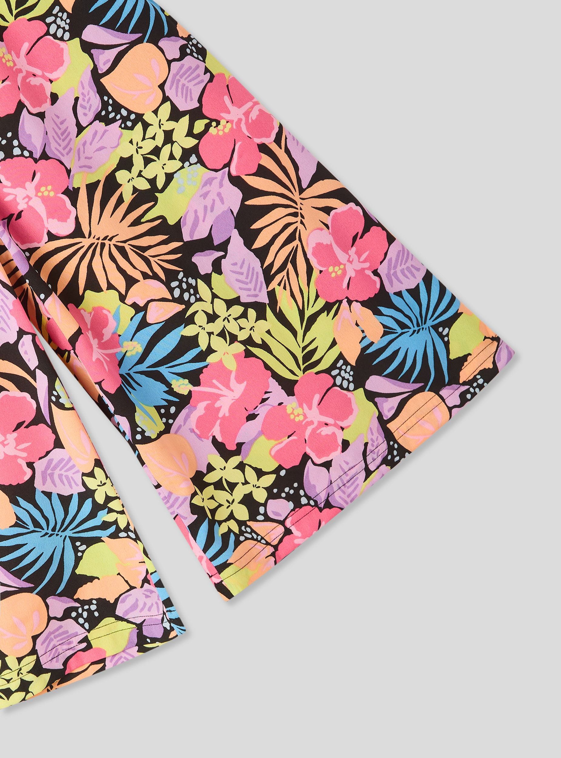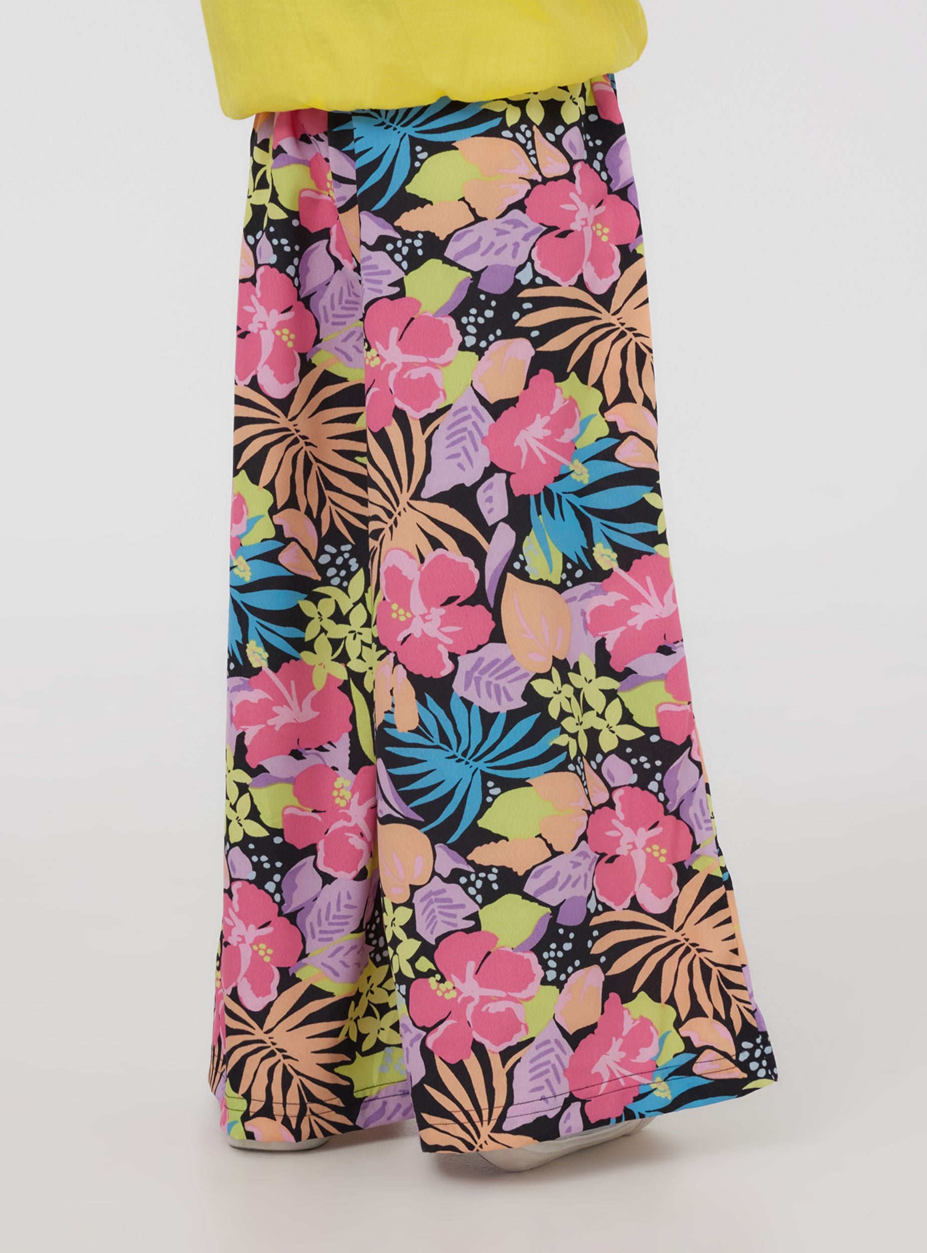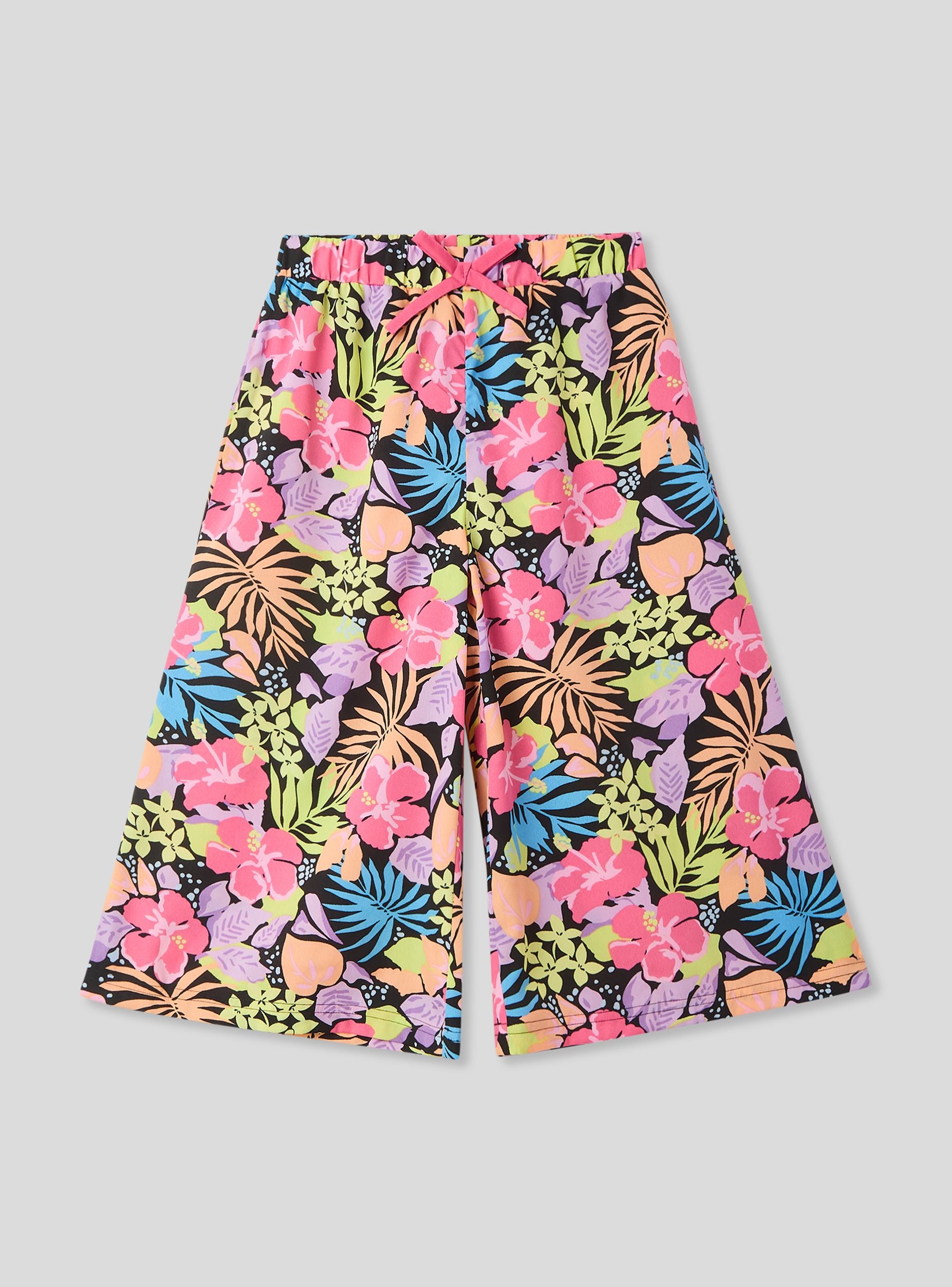 Dječje duge culotte hlače s živopisnim i višebojnim uzorkom, savršene za stvaranje vesele i originalne odjeće. Idealne su za ljetne dane, a mogu se kombinirati s laganim topovima i sandalama za bezbrižan i moderan outfit. Fluidan i udoban dizajn čini ih prikladnima za svaki trenutak igre ili šetnje, dodajući dašak svježine i veselja u ormar.Detalji