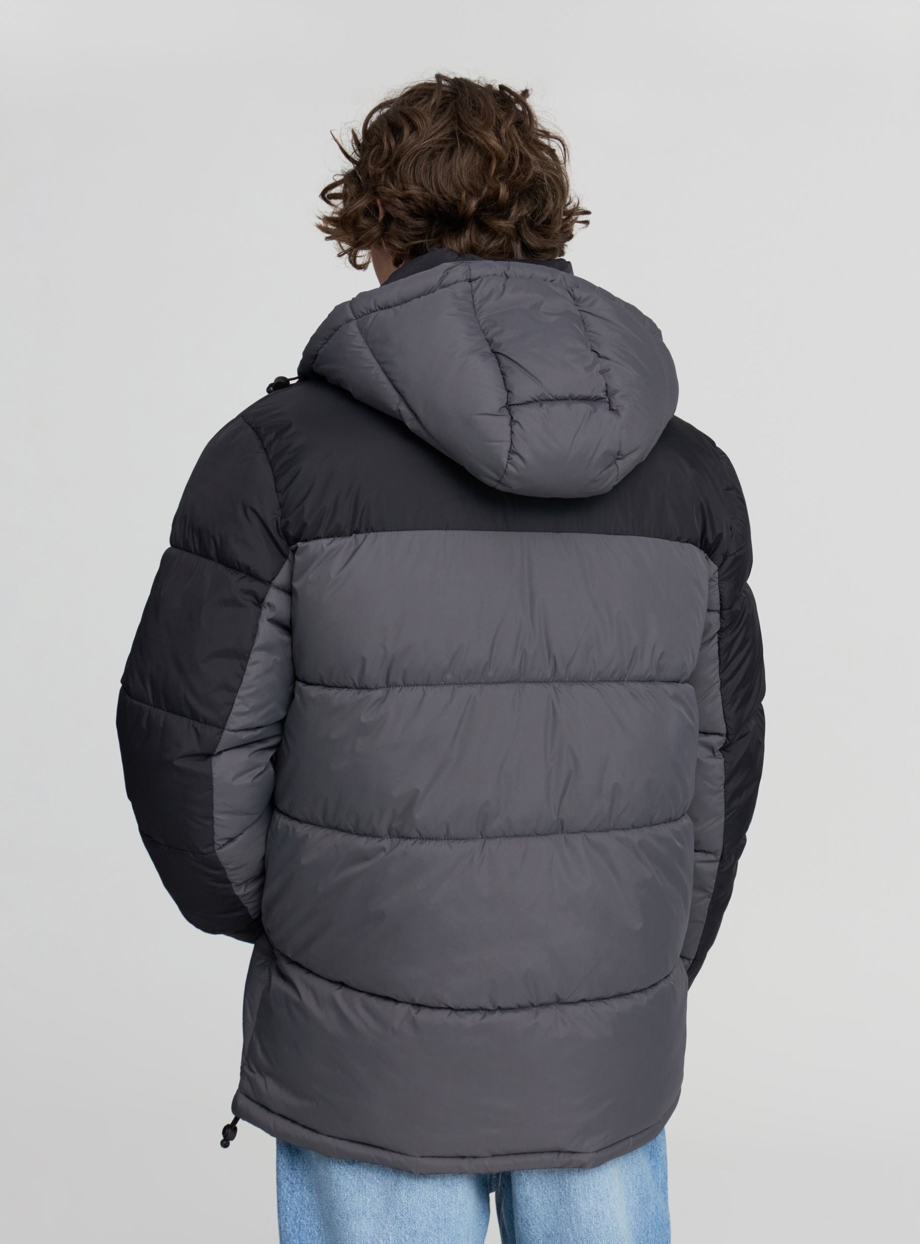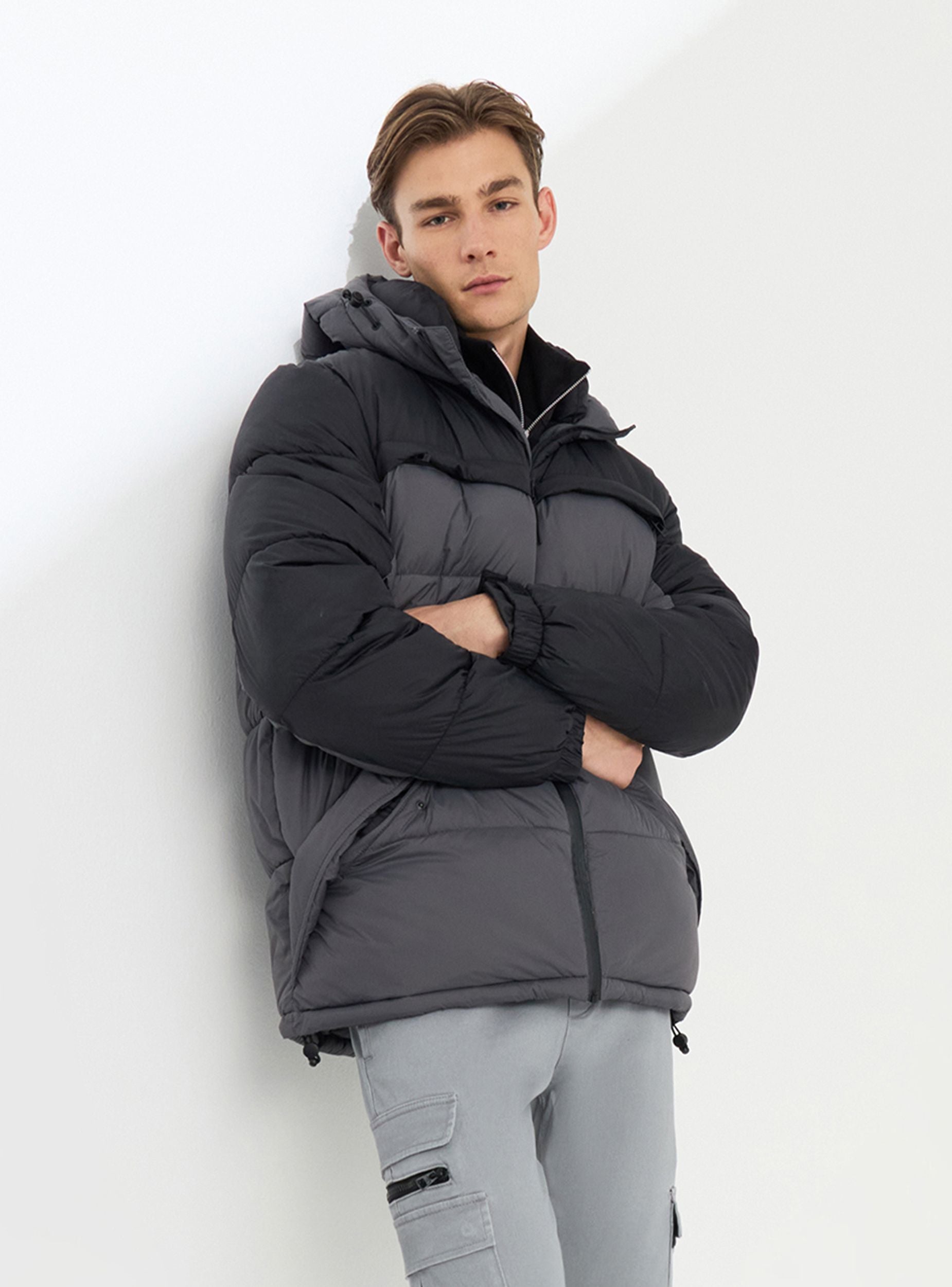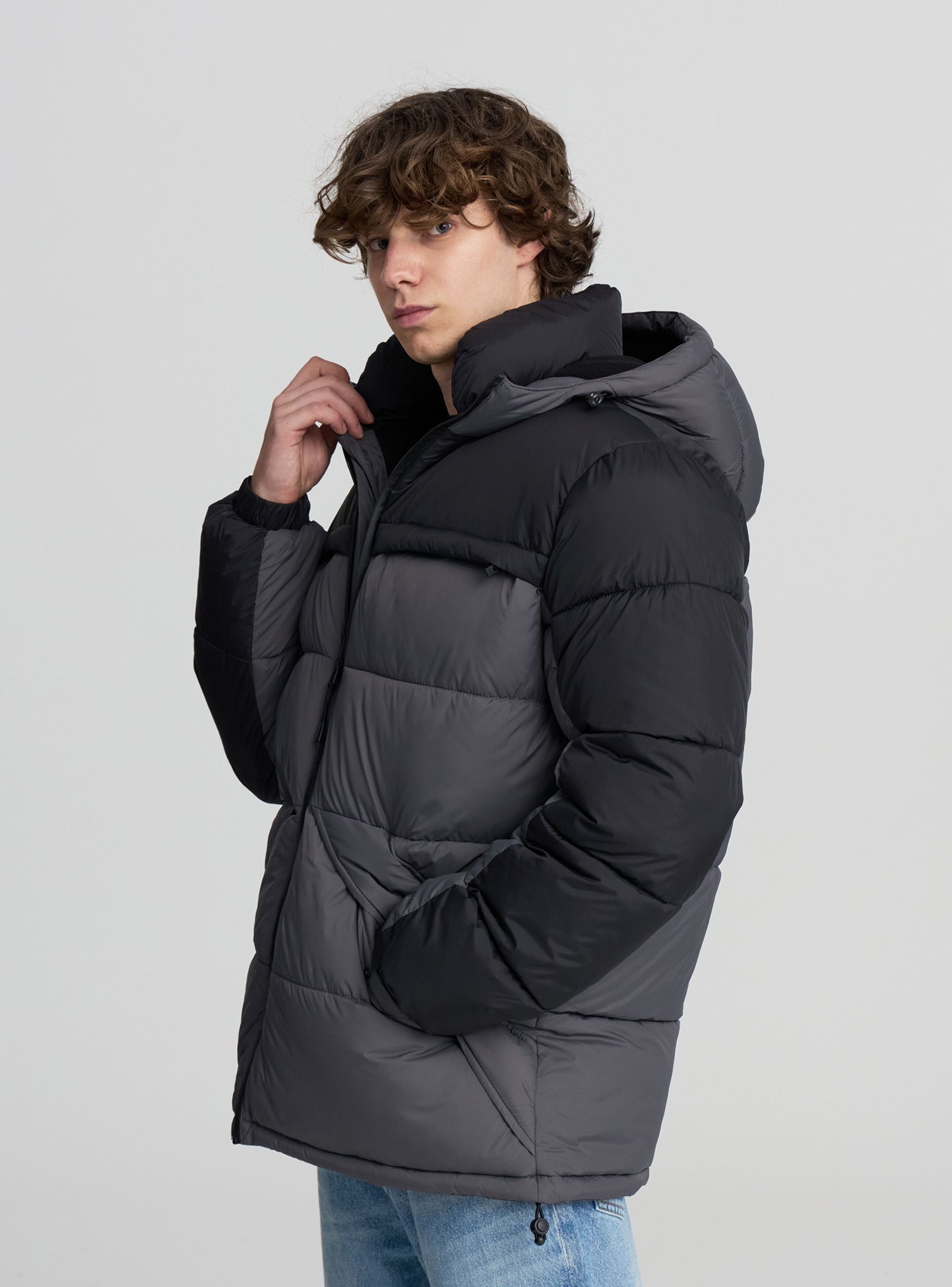 Muška zimska jakna idealna za suočavanje s najhladnijim danima s stilom. Dizajn sadrži uzorak u blokovima boja i udoban kroj, savršen za nošenje preko džempera ili dukserica. Opremljena je podesivim kapuljačom, zatvaranjem s vodootpornim patentnim zatvaračem, džepovima na prsima s patentnim zatvaračem i bočnim dijagonalnim džepovima s skrivenim dugmadi na pritiskanje, podesivim manžetama, steznikom na dnu i unutarnjim džepom s čičak trakom, pruža zaštitu i funkcionalnost. Podesive manžete. Prikladna je za grad i slobodno vrijeme.Detalji