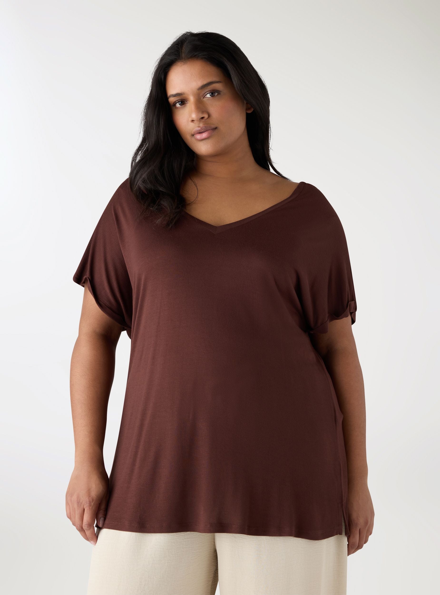 Ženska jednobojna majica s V-izrezom i kratkim rukavima, s opuštenim krojem. Širi kroj i blago spuštena ramena čine je idealnom za svakodnevne i ležerne prilike. Savršena uz traperice, lepršave pantalone ili suknje, može se nositi i uvučena i opuštena za jednostavan i svestran stil.Detalji
