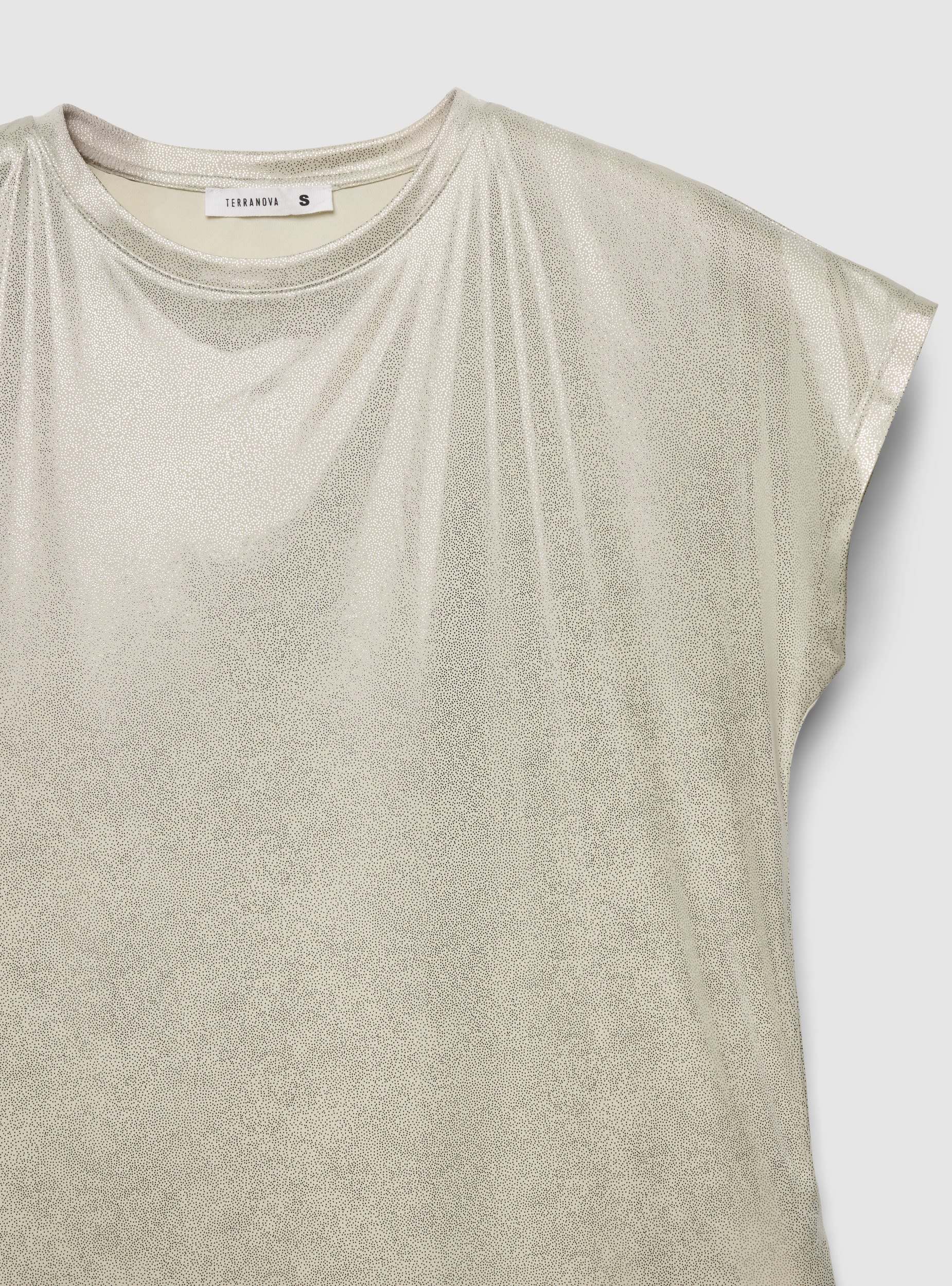 Ženska majica širokog kroja i okruglog izreza, idealna za ležerne izglede ili večernje prilike. Kratki rukavi koji lagano padaju preko ramena i blago zaobljen donji rub. Sjajna površina daje blistav izgled i savršena je za kombinovanje s farmerkama, mini suknjama ili krojenim pantalonama.Detalji