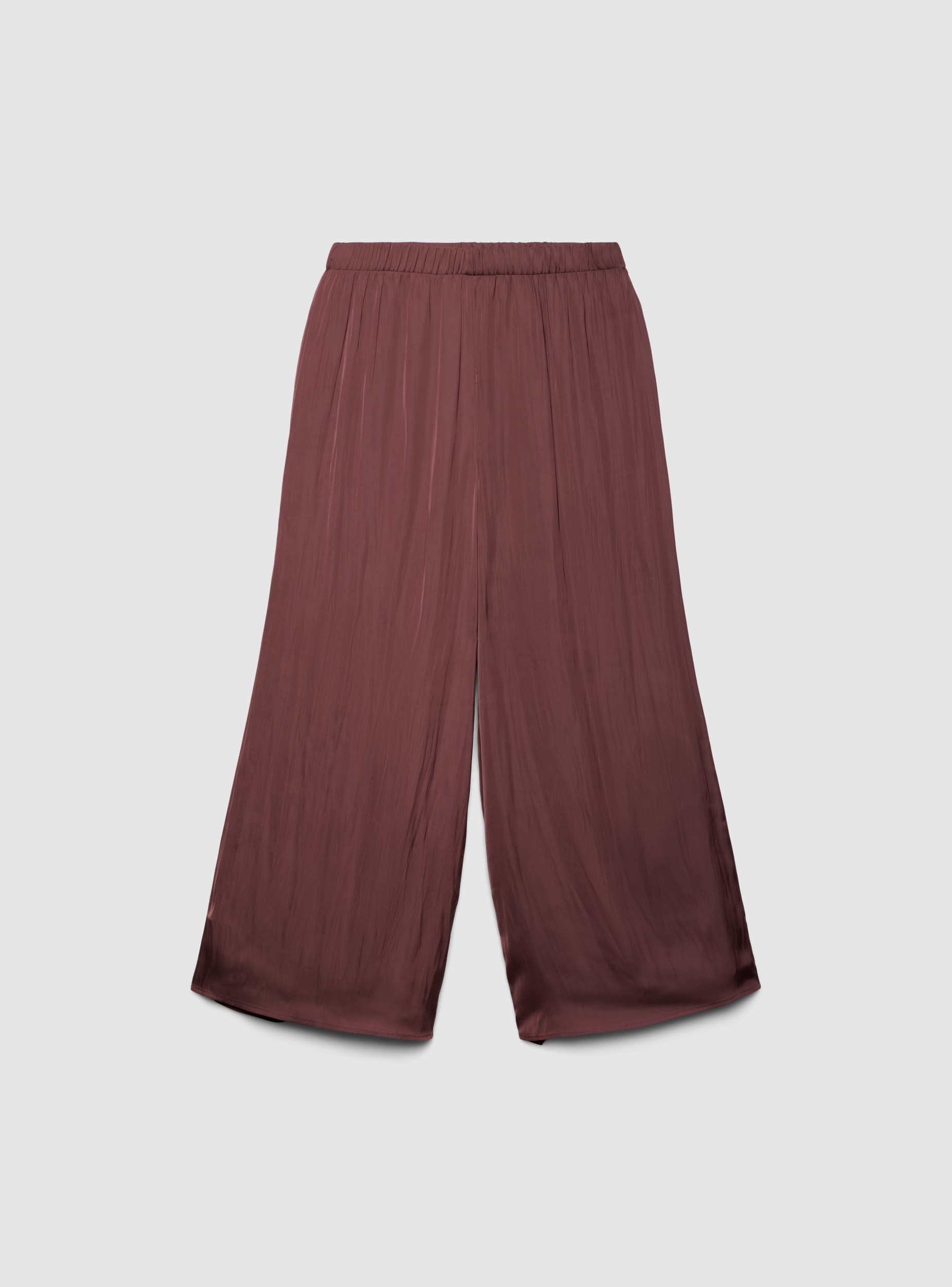 Ženske pantalone u jednobojnoj varijanti sa širokim krojem i širokim nogavicama. Elastičan struk za svakodnevnu udobnost i opušten izgled. Idealna skraćena dužina za nošenje sa sandalama ili patikama, savršene za ležerne prilike. Tkanina sa blagim naboranim efektom koja dodaje pokretljivost. Lako se kombinuju sa uskom majicom ili mekanom košuljom za svestrane outfite.Detalji