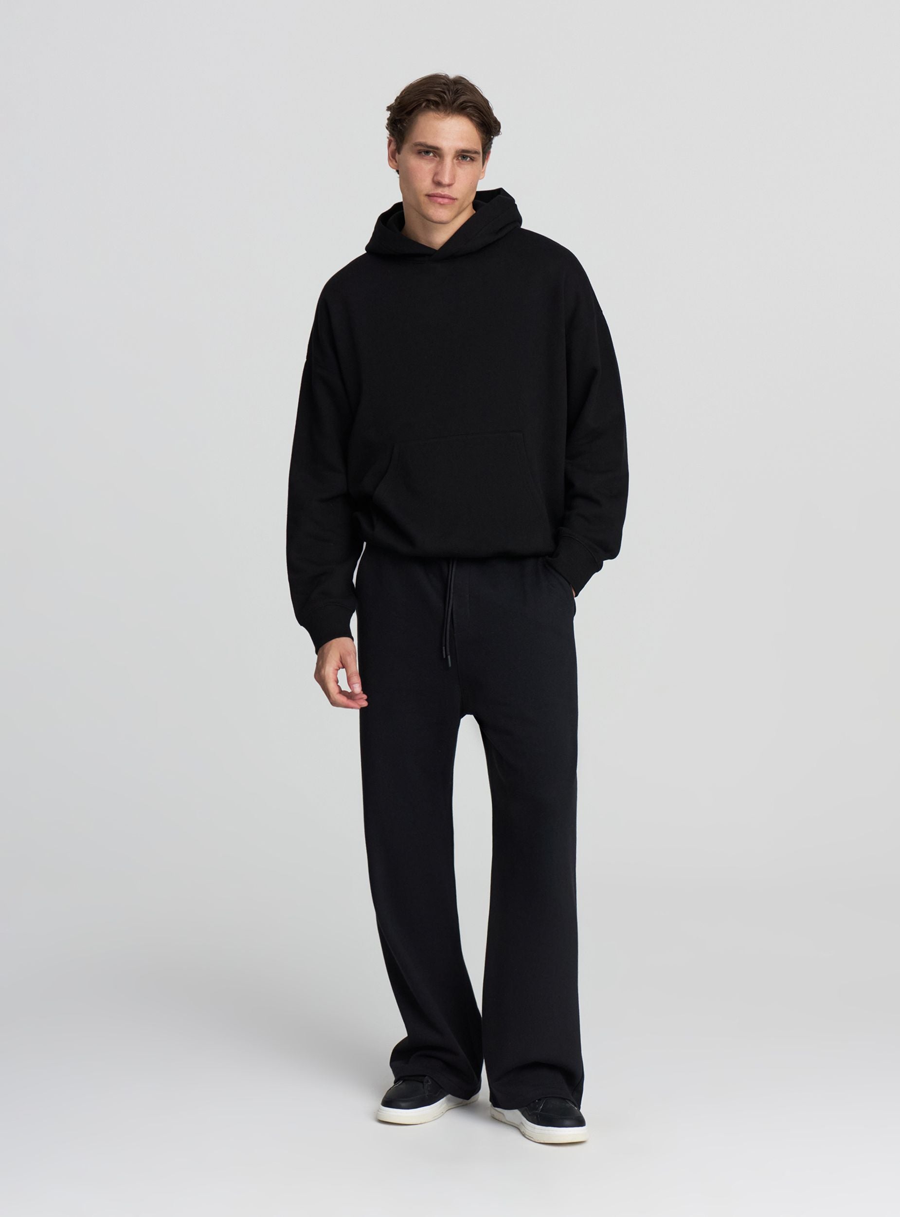 Muški teški trenirci idealni za slobodno vrijeme i svakodnevne aktivnosti. Model s širokim nogavicama, elastičnim pojasom i podesivom vezicom, savršeni za osiguranje udobnosti i slobode kretanja. Praktične bočne kuteve za male predmete. Široka kroja, lako se kombiniraju s duksericama ili majicama za opušten i svestran izgled.Detalji