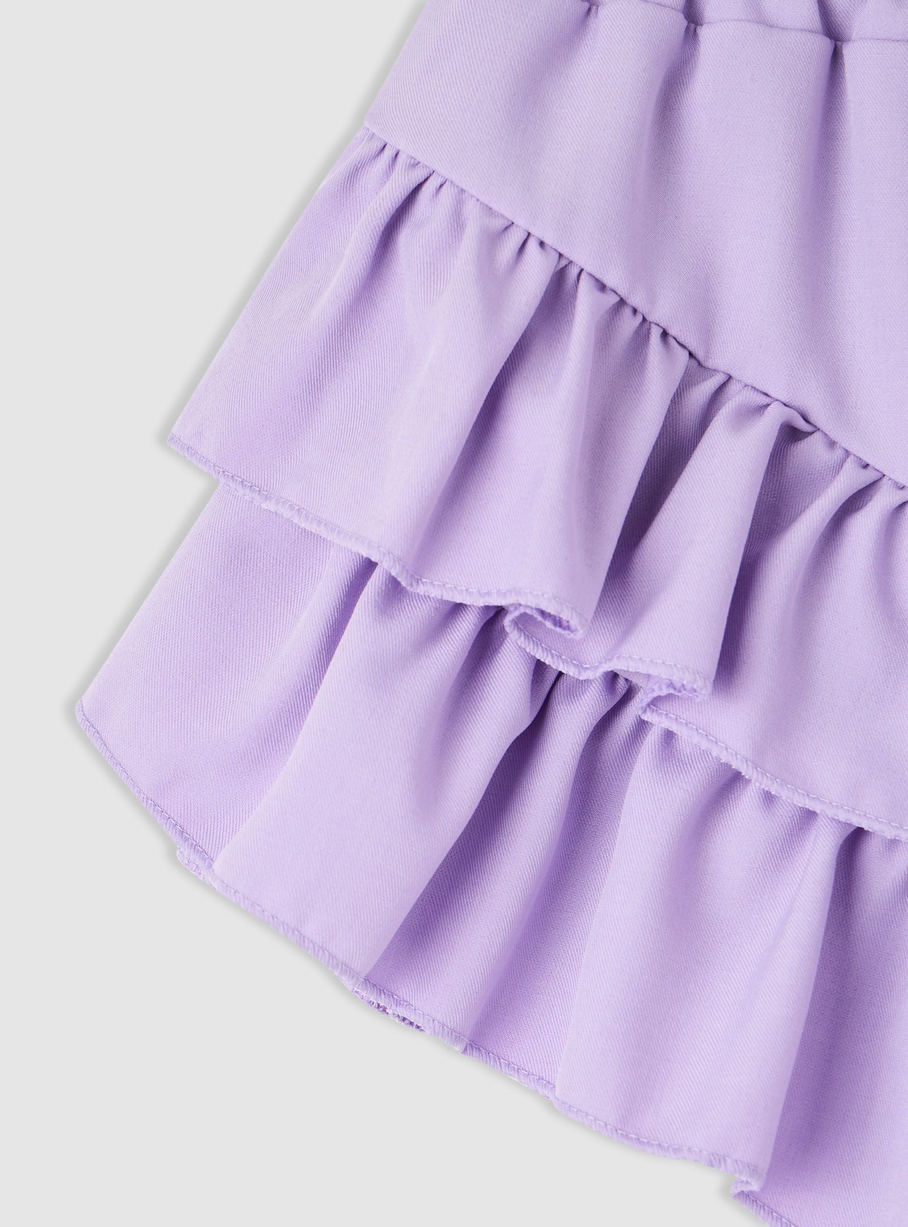 Jednobojne dječije suknja-hlače, dizajnirane za živahan i udoban izgled. Kratki model sa slojevitim volanima i V-izrezom sprijeda koji daje pokret. Struk sa elastičnom trakom za praktično i brzo oblačenje. Savršene uz majicu i patike za školu ili uz bluzu za zabave i rođendane.Detalji