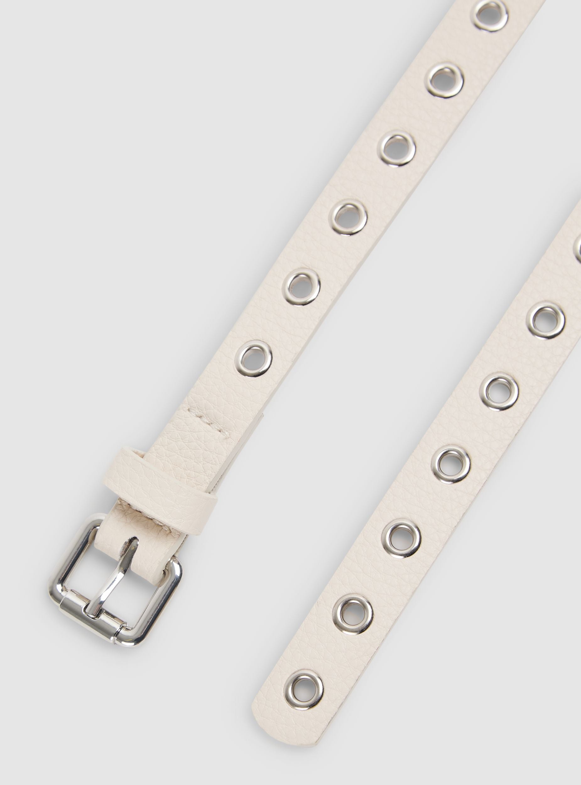 Ženski remen tankog i izduženog dizajna, ukrašen nizom srebrnih metalnih okova raspoređenih duž cijele površine. Kopča je metalna, kvadratnog oblika sa srebrnim završetkom, što ističe njegov moderan karakter. Zahvaljujući velikoj dužini, može se nositi omotan više puta oko struka, dodajući rock i savremen dodir svakom izgledu. Jednobojan, lako se kombinuje sa farmerkama, pantalonama visokog struka i haljinama, čineći ga idealnim za ležerne i urban chic outfite.Detalji