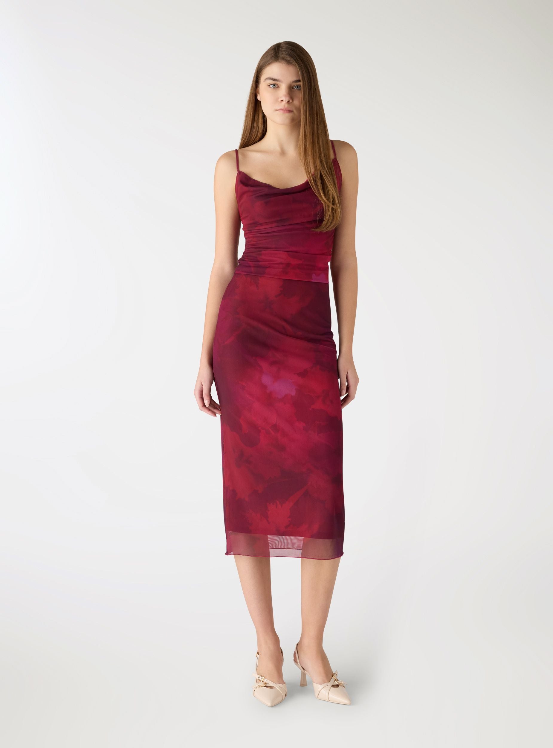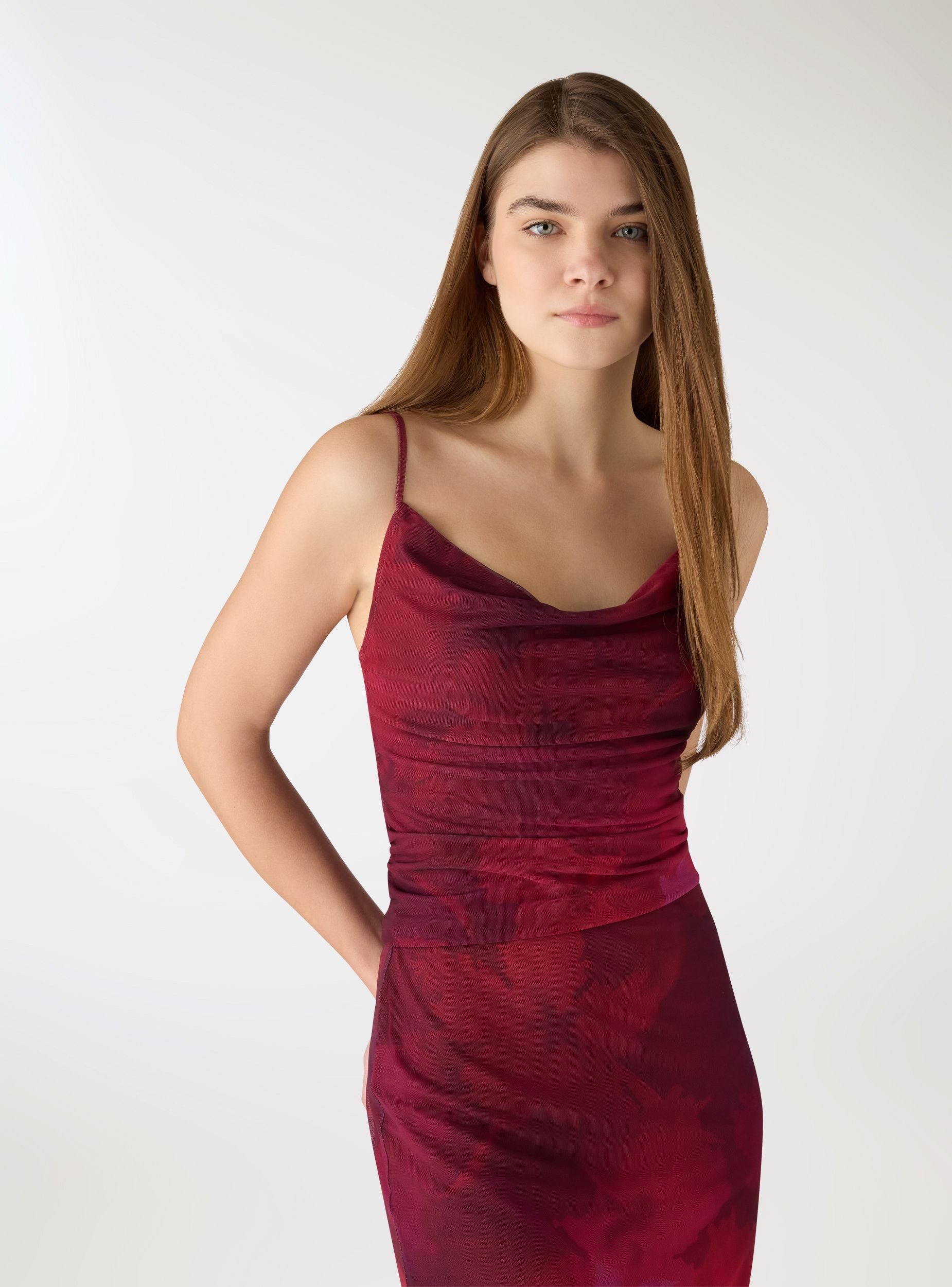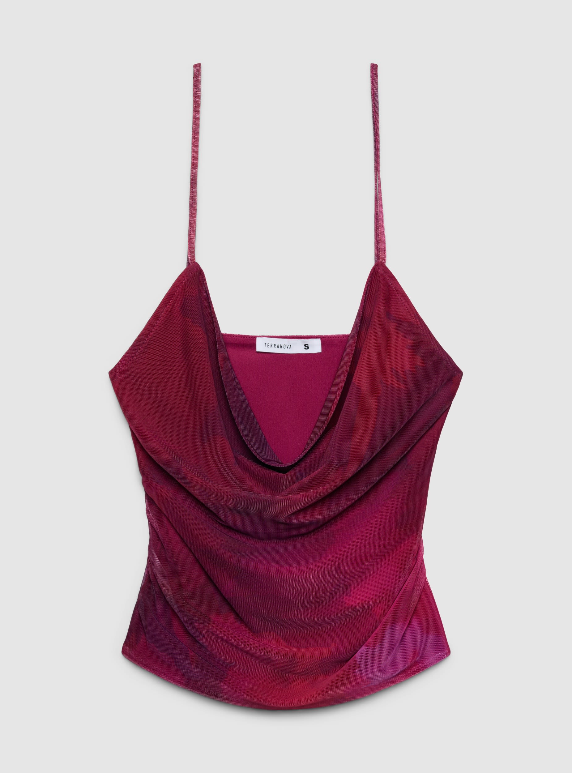 Top za žene s uzorkom, s tankim podesivim naramenicama i dekolteom u obliku vodopada koji ističe dekolte. Uski kroj prati liniju tijela, dok bočne nabore stvaraju naborani i izduženi efekt. Idealan je uz traperice s visokim strukom ili elegantne pantalone za aperitive i večernje izlaske, a lako se kombinuje i ispod blejzera ili kardigana.Detalji