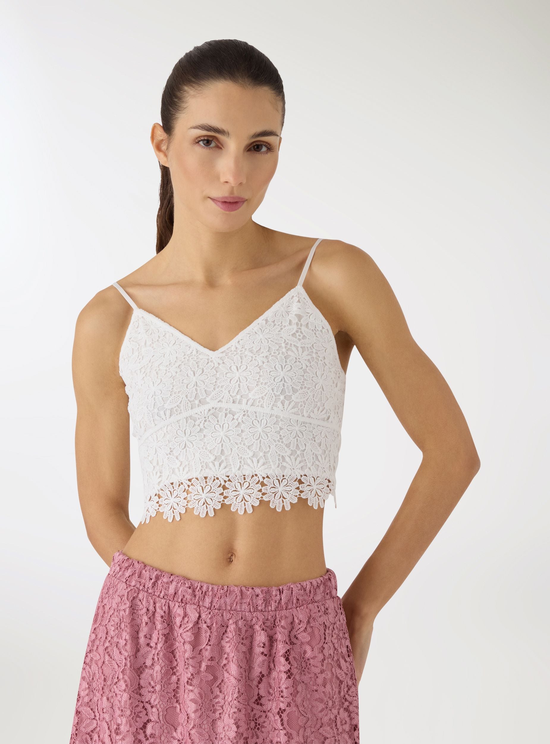 Ženski top u jednobojnoj varijanti s makrame radom u cvjetnom uzorku, idealan za ljetne izglede i posebne večeri. V-izrez i tanke naramenice ističu liniju, dok kratka dužina s nazubljenim rubom dodaje karakter. Model bez zatvaranja, s unutrašnjom podstavom za veću pokrivenost. Savršen uz traperice s visokim strukom ili lepršave suknje.Detalji