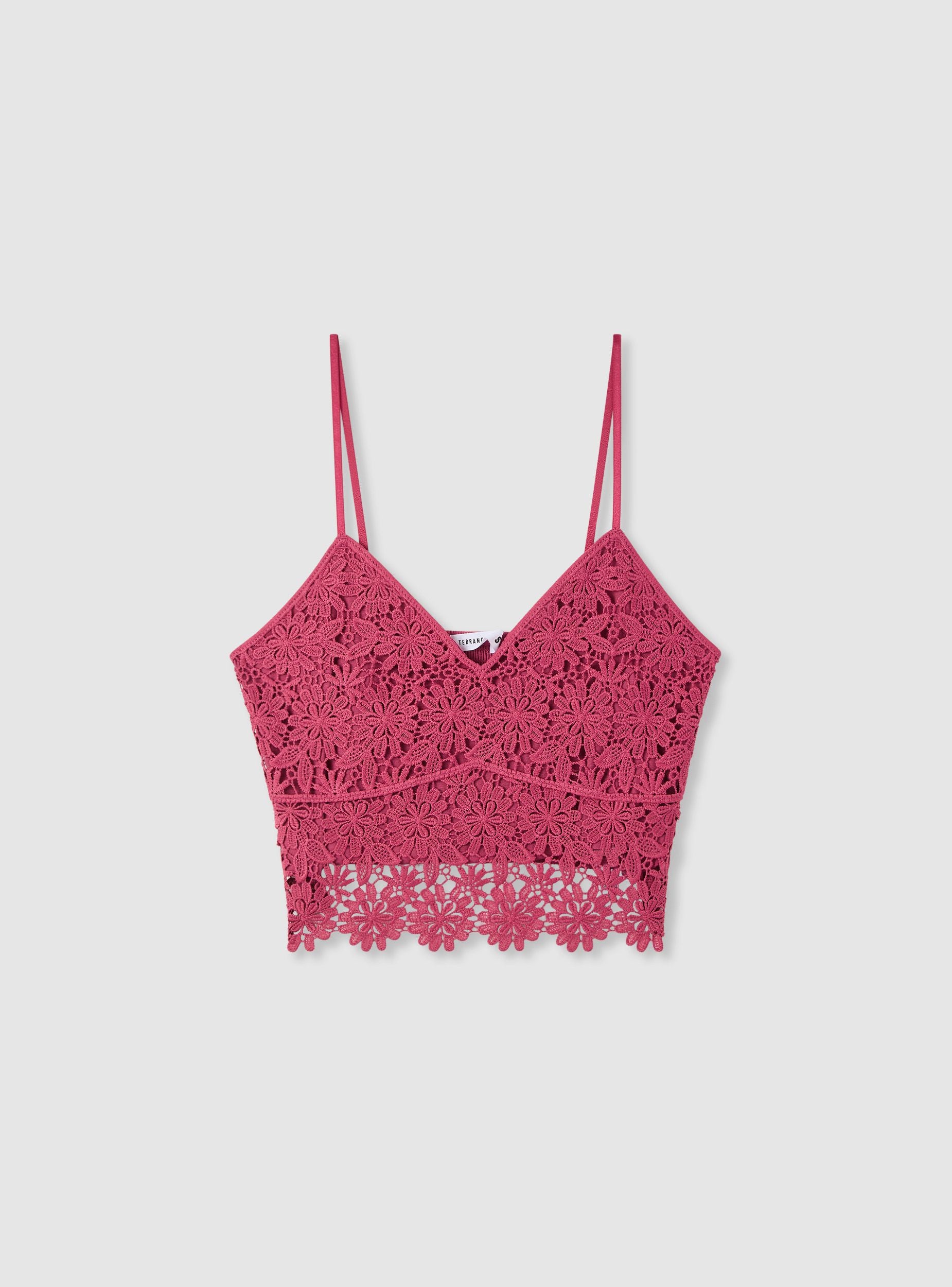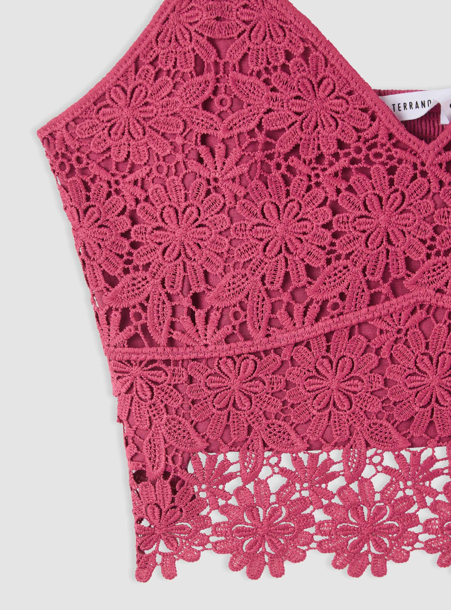 Ženski top u jednobojnoj varijanti s makrame radom u cvjetnom uzorku, idealan za ljetne kombinacije i posebne večeri. V-izrez i tanke naramenice ističu liniju, dok kratka dužina s nazubljenim rubom dodaje karakter. Model bez kopčanja, s unutrašnjom podstavom za veću pokrivenost. Savršen uz traperice s visokim strukom ili lepršave suknje.Detalji