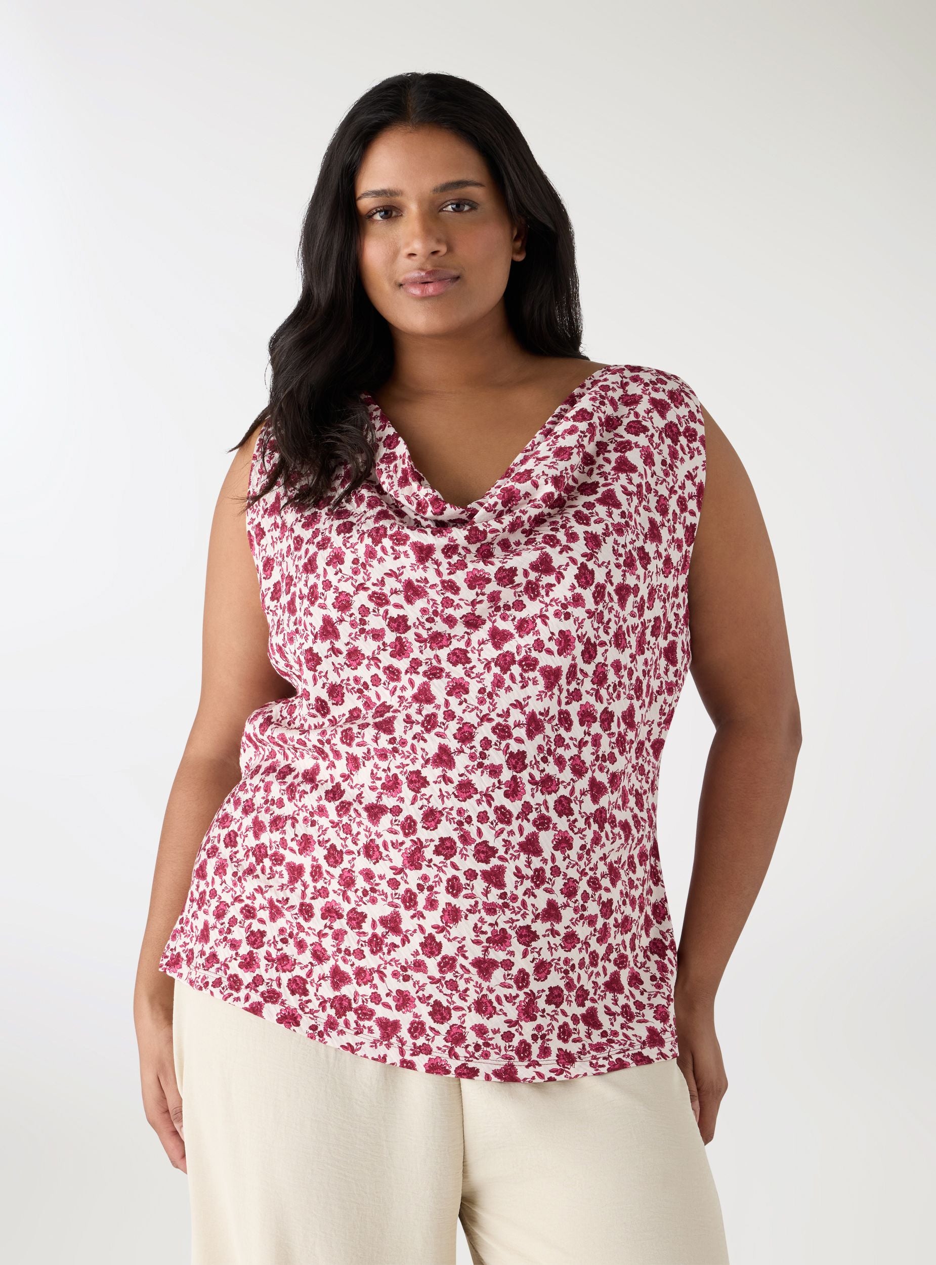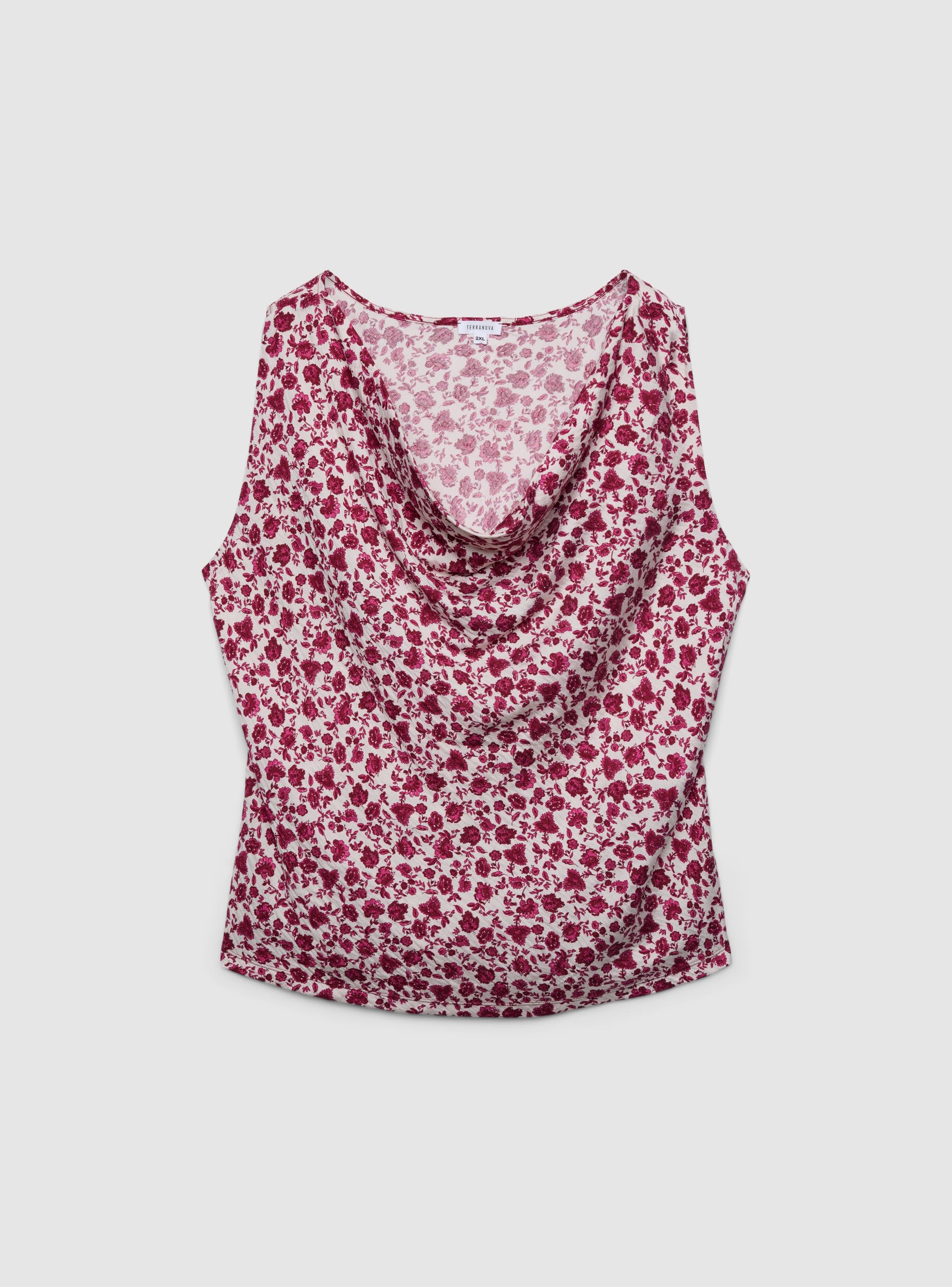 Ženski top sa cvjetnim printom po cijelom komadu i mekanim naboranim izrezom koji ističe dekolte. Model bez rukava sa regularnim krojem, idealan uz traperice ili pantalone visokog struka za dnevne i neformalne večernje izlaske. Jednostavan dizajn bez kopčanja i džepova, savršen i ispod blejzera ili kardigana za slojevite kombinacije.Detalji